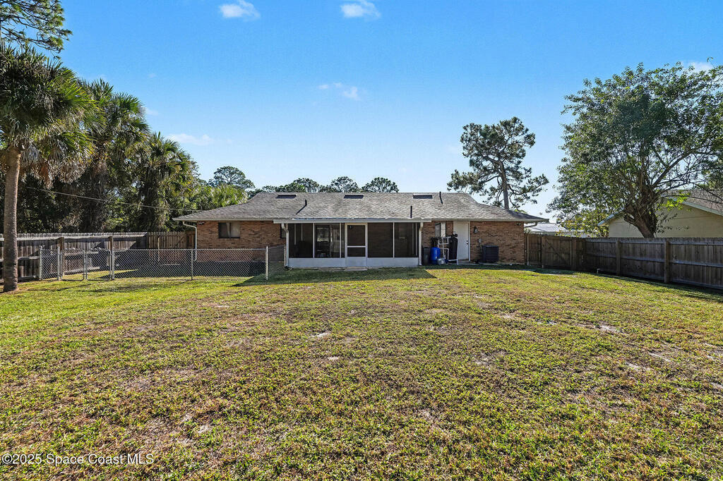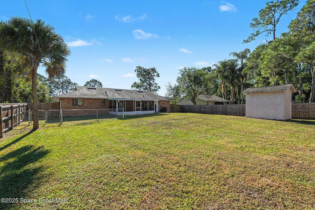 Here ye, Here ye! You won't find a better home for this price in the area! This well built, brick home features everything you need to live a modern life! Completely upgraded: including 2023 stainless steel appliances, elegant quartz countertops, and a trendy backsplash., 2023 updated bathrooms! Custom closet and built in wall unit in master bedroom. Plus upgraded knockdown, vaulted ceilings and beautiful contemporary white tile floors throughout. Lets not forget about the exterior! 2023 new a roof, septic tank, gutters and a new well in September 2025! 2023 AC system, a new water heater, and water treatment system. The fully fenced backyard, including screened porch with tile and the storage shed. All tucked into the beautiful area of SW Palm Bay! Also plenty of room for a swimming pool.