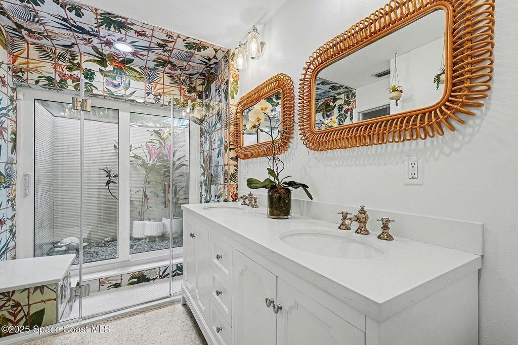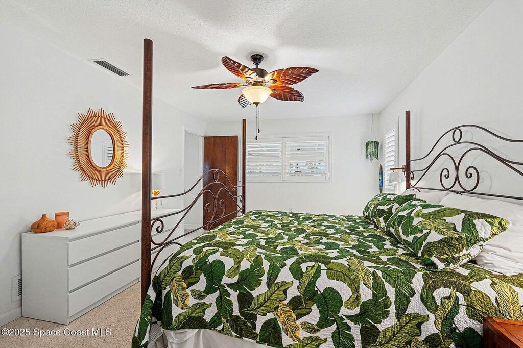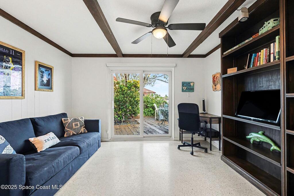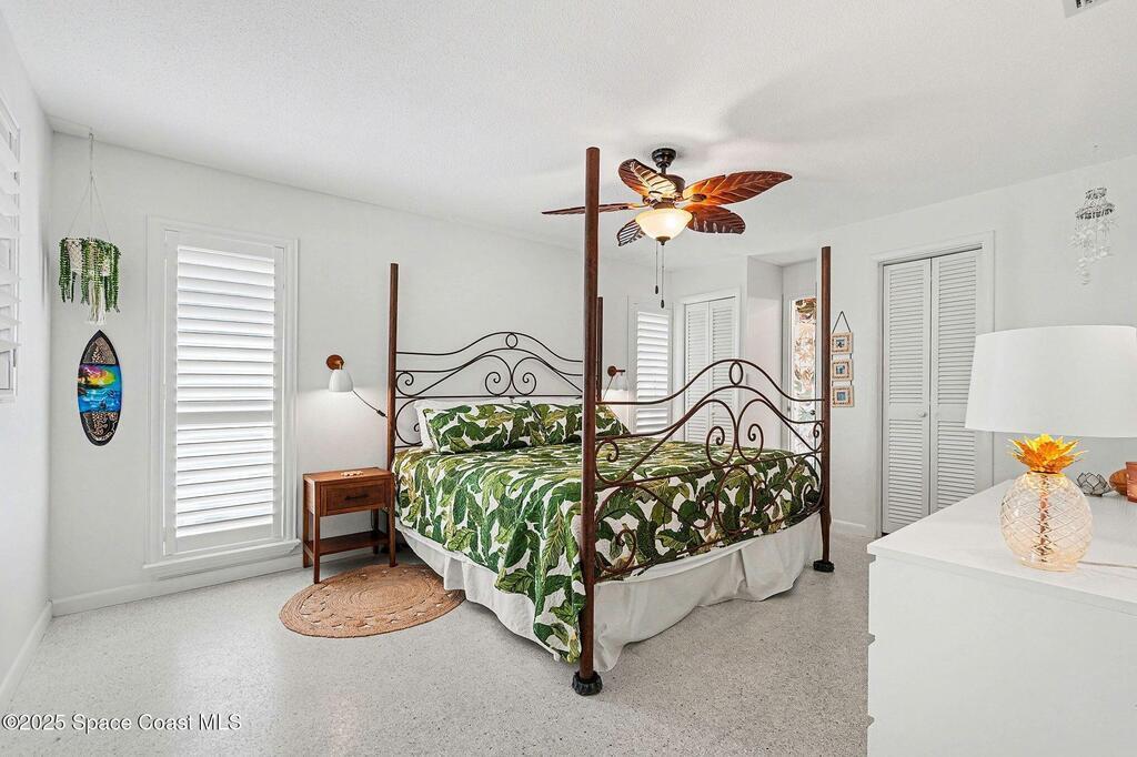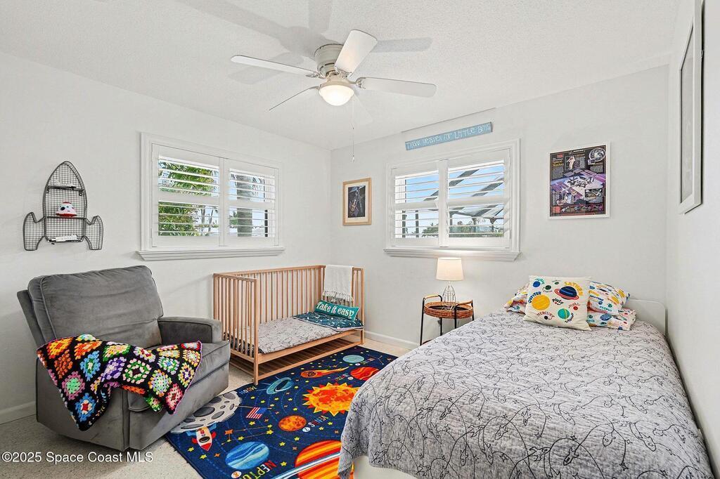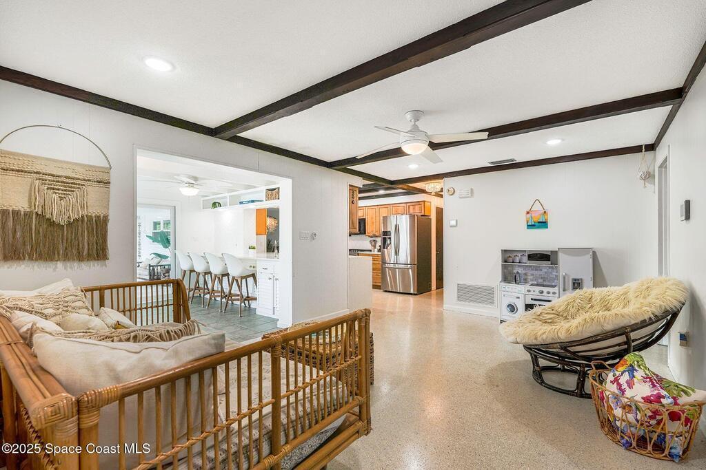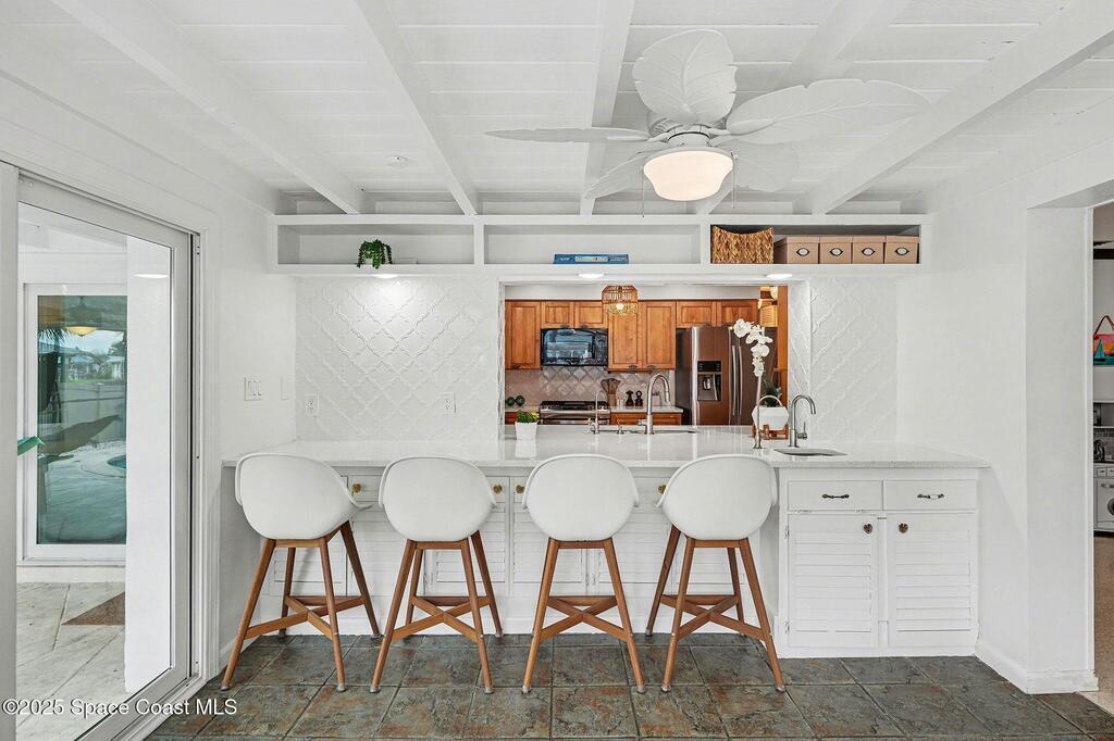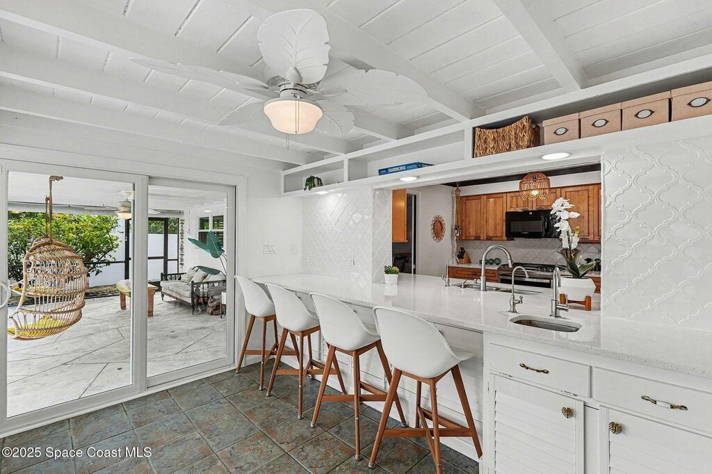 Cocoa Beach waterfront residence seconds from Banana River w/ easy ocean access. Tranquil canal views frame a backyard oasis w/ resurfaced free-form screened pool, gas heater and 2025 pool pump. Dock w/ electric boat lift offering kayaking, paddleboarding, sunset cruising, w/ sightings of manatees and dolphins. The 4BR/2BA split floor plan showcases diamond-polished terrazzo floors, plantation blinds, and Four Seasons hurricane-rated windows and sliders. An upgraded kitchen w/ gas stove and water filtration opens to a sunroom with breakfast bar and nook. Updated bathrooms include a serene primary suite with double sinks, walk-in closet, and screened atrium. Convenient outdoor shower and minutes to beach. Designed for both beauty and livability, the home features a fenced side-yard ideal for children, safely separated from the pool and canal.Striking black volcanic stone accents the exterior and foyer, while a front screened atrium provides privacy, natural light, & cooling breezes.