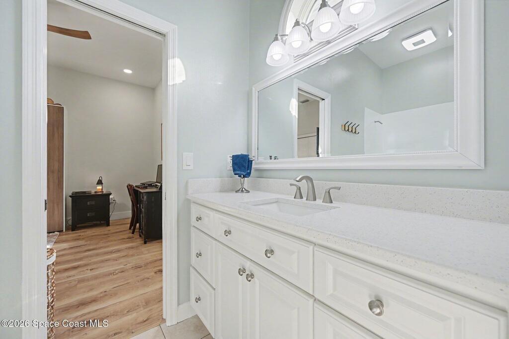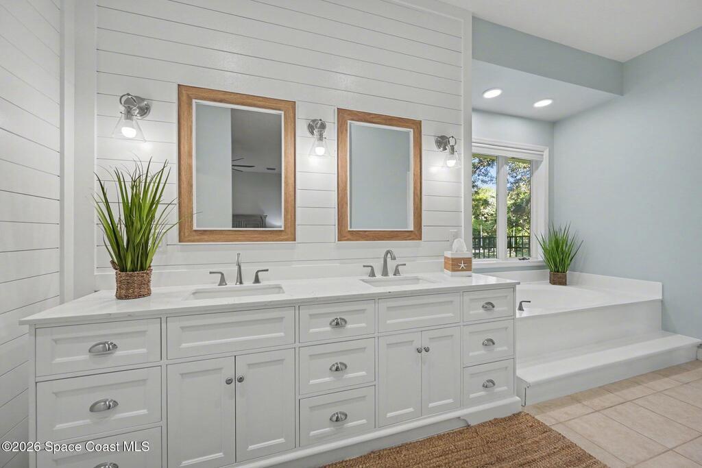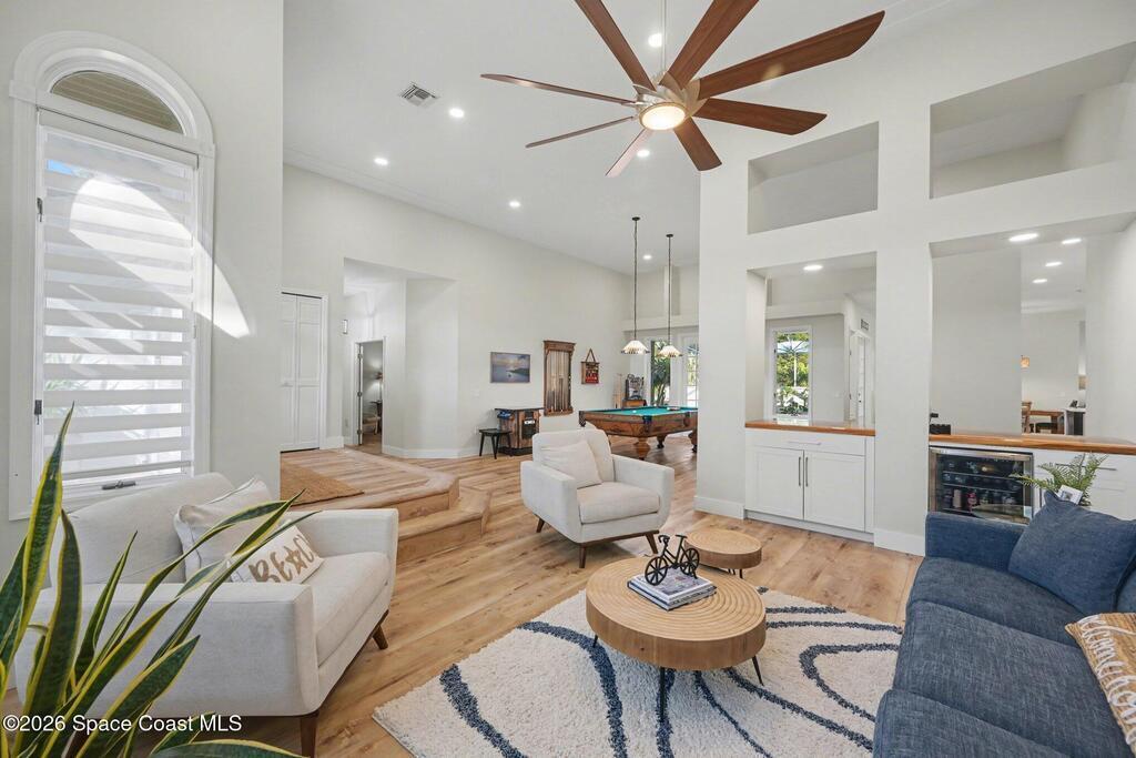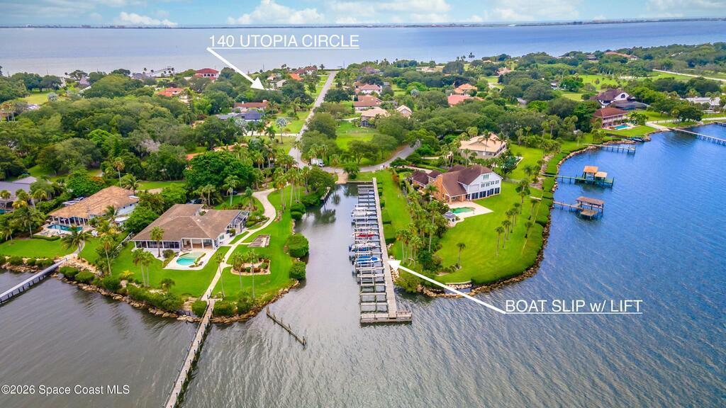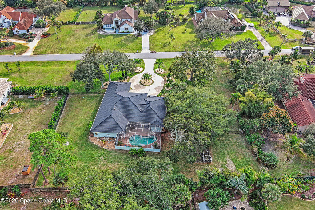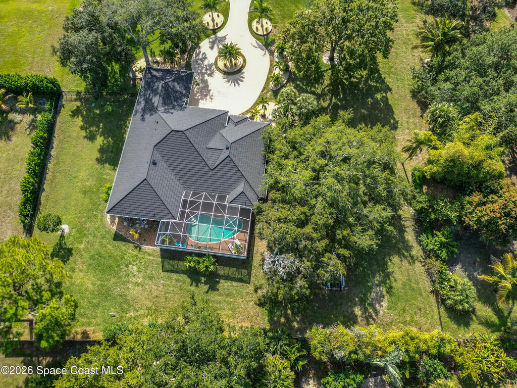A rare blend of acreage, updates, garage space, and premier boating in Brevard County on 1-acre + a boat slip, nestled between the Banana and Indian rivers. This home has it all: 4b/4 full baths, circular driveway, pool, and an 864sf garage. Soaring 14 & 10 ft ceilings throughout, abundant natural light, and a statement fireplace. A new metal roof (2025), gutters, and solar attic fans are just the first of many upgrades. Wide-plank luxury vinyl flooring, updated kitchen and baths, and LED lighting in every room create a spacious entertainment showcase. Low-maintenance tropical landscaping and stunning 40-year-old oak trees create a private, shaded oasis in the front and back fenced yards. Enjoy a private screened pool, making entertaining a breeze. You'll love the spacious master suite, featuring a coastal vibe, an en-suite bath, a new double vanity, sconce lighting, and two huge walk-in closets. This home has exclusive use of slip #7 w/ a private 8k lift w/ direct access to the ICW.