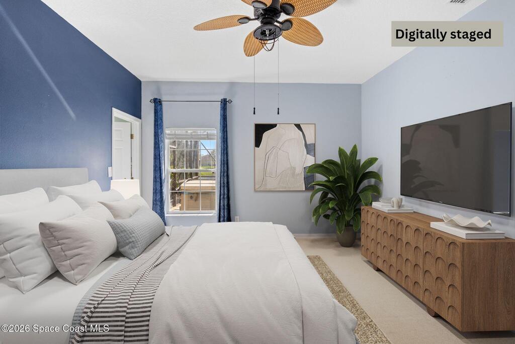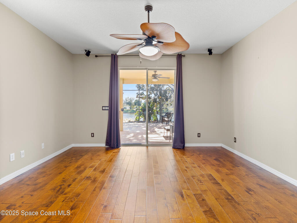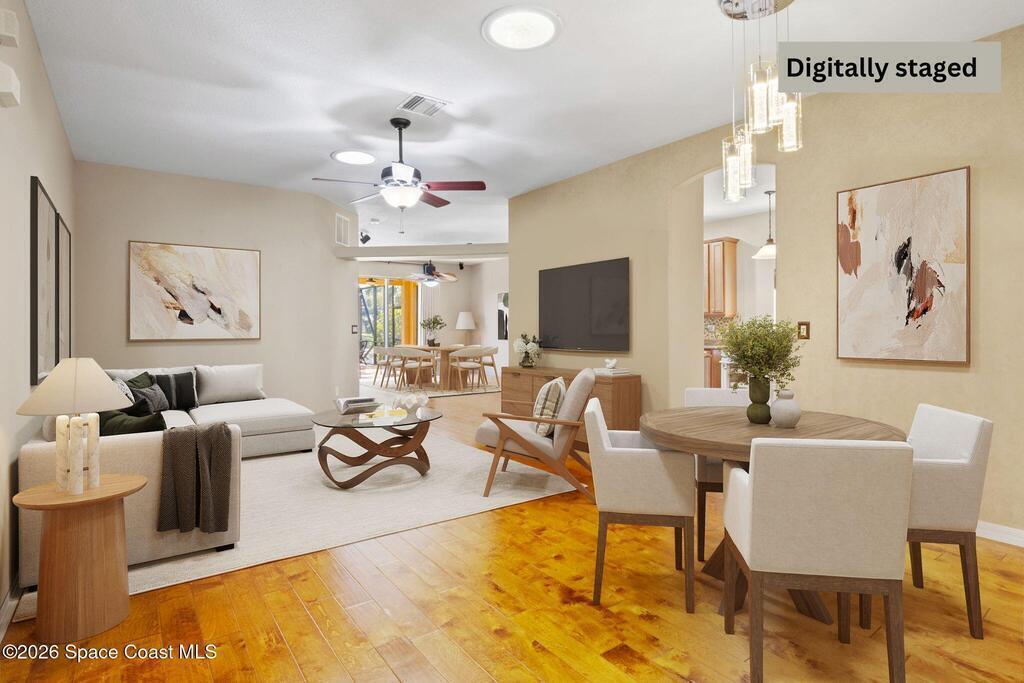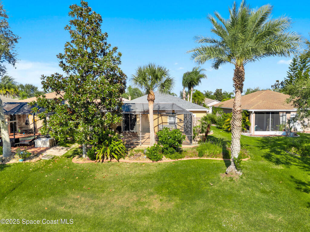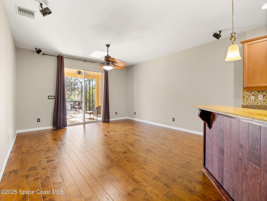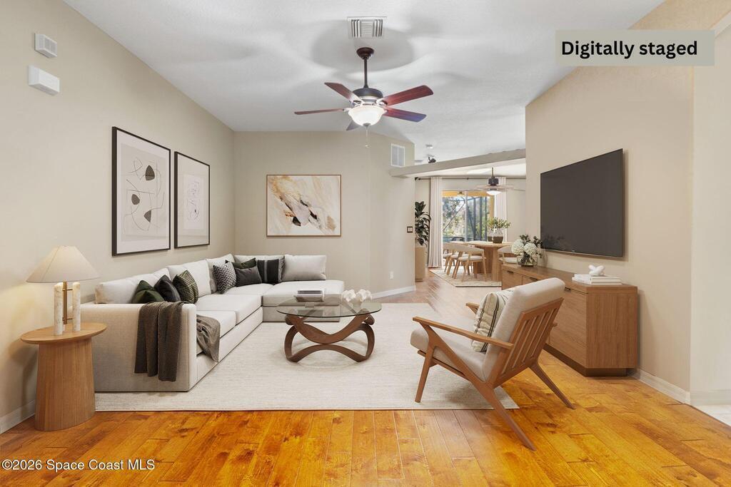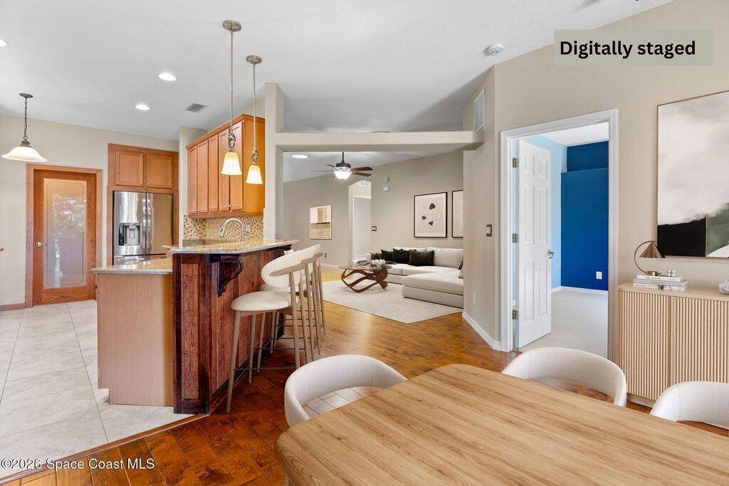 Immaculate lakefront home in highly desirable West Viera. An open-concept design w/ vaulted ceilings & gleaming wood floors in the living, dining, & front bdrm. The spacious great room flows into a large casual dining area, perfect for entertaining. The chef's kitchen features tall cabinets, SS appliances, generous counter space, a breakfast bar, a movable island, & a walk-in pantry. The owner's suite offers his & her closets, elegant vanity w/ extra storage, granite counters, & a glass-enclosed shower. Two other bdrms share the guest bath, also w/ granite counters. Sliding doors lead to the large screened porch w/ serene water views & no rear neighbors. A sprinkler system keeps the front & back lawns lush year-round. The roof was replaced in 2020. Located in one of Brevard's most desirable neighborhoods, this home is minutes from A+ schools, shopping, dining, golf, & parks. Residents have access to a fantastic community pool, clubhouse, & sports courts, including tennis & basketball
