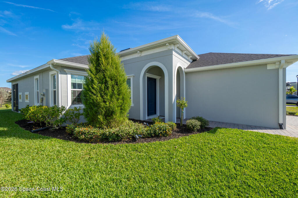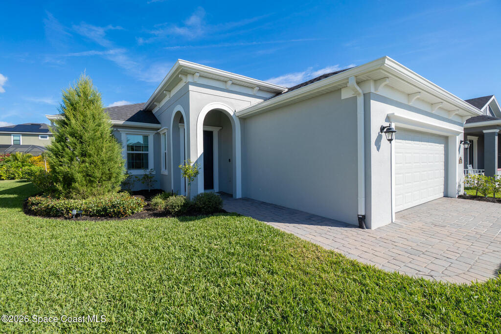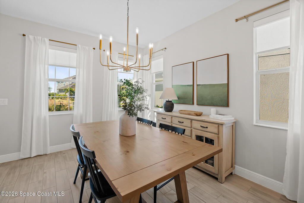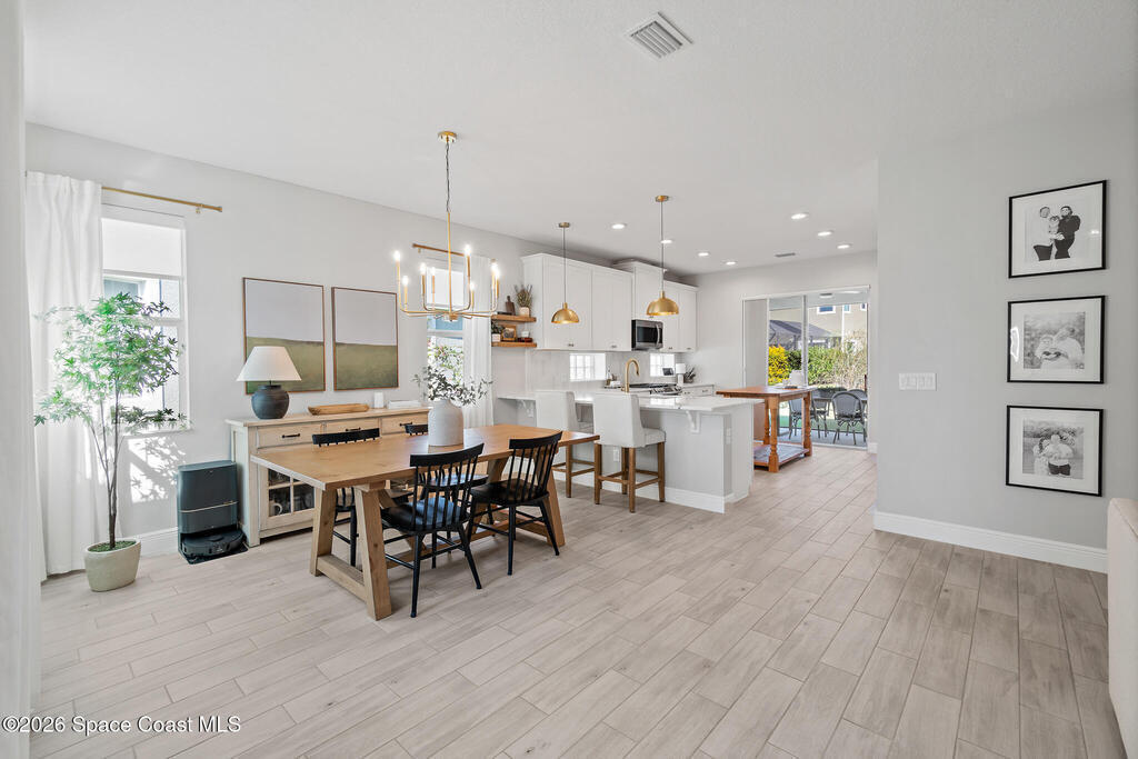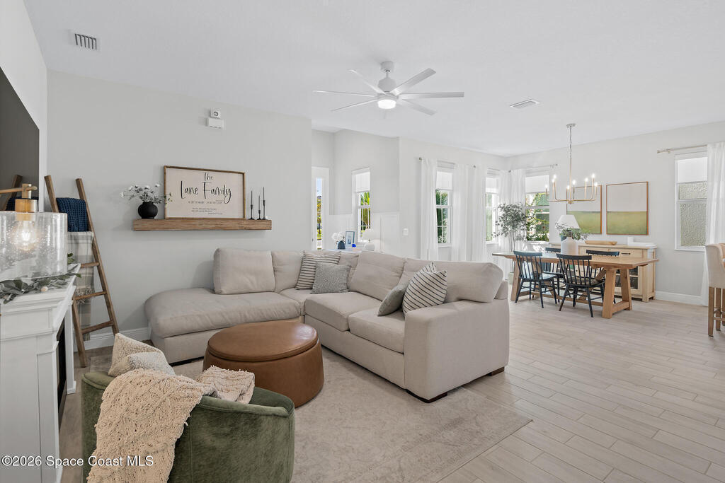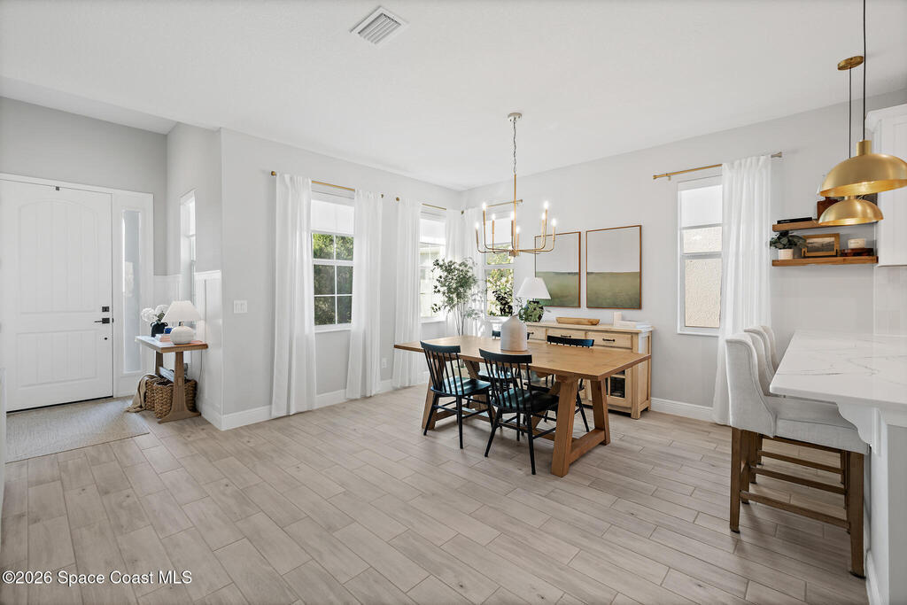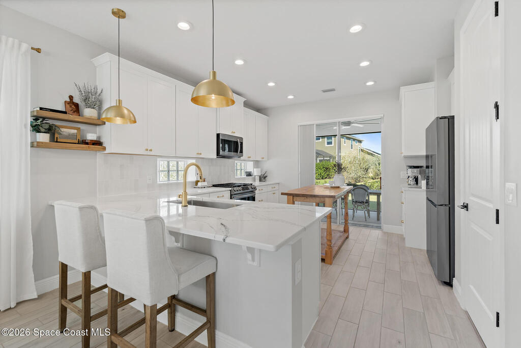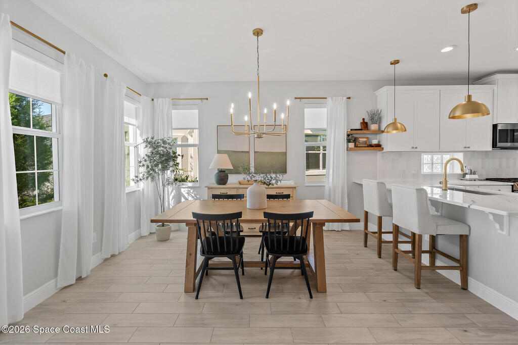 Welcome to 3024 Blazing Star, a beautifully upgraded 3-bedroom, 2-bath, 2-car garage single-family home located in the highly desirable planned community of Viera.This home is full of stunning upgrades. These sellers truly spared no expense. You'll immediately notice the wood-like custom tile flooring throughout the main areas, custom lighting, and a thoughtfully designed laundry room with upgraded finishes. The kitchen is a true showstopper, featuring stunning quartz countertops with subtle drops of gold, a large eat-in island, a charming coffee nook, and a layout perfect for both everyday living and entertaining.All bathrooms have been beautifully put together, continuing the home's cohesive, designer feel.Step outside to enjoy the covered, screened-in patio. Perfect for relaxing or entertaining while enjoying Florida living year-round. Residents also enjoy an incredible lifestyle with access to multiple community parks and the Addison Village Club, offering two pools,