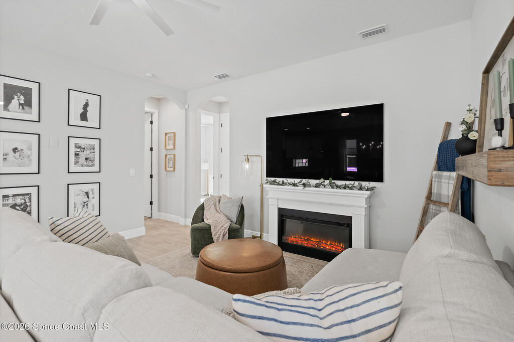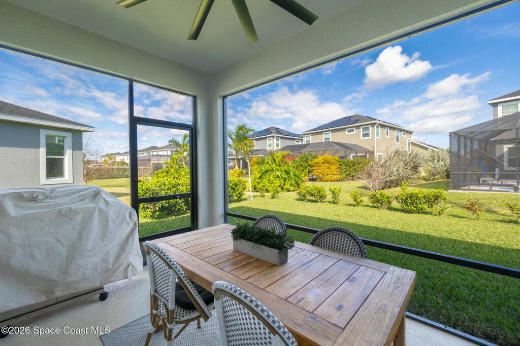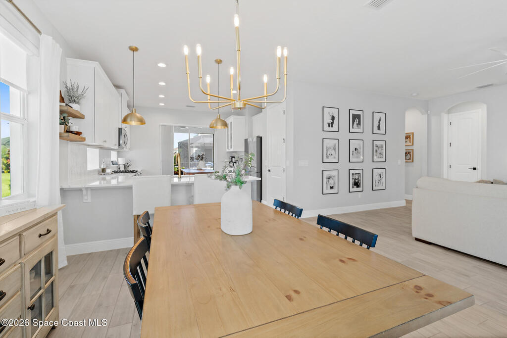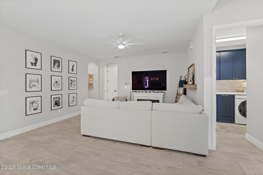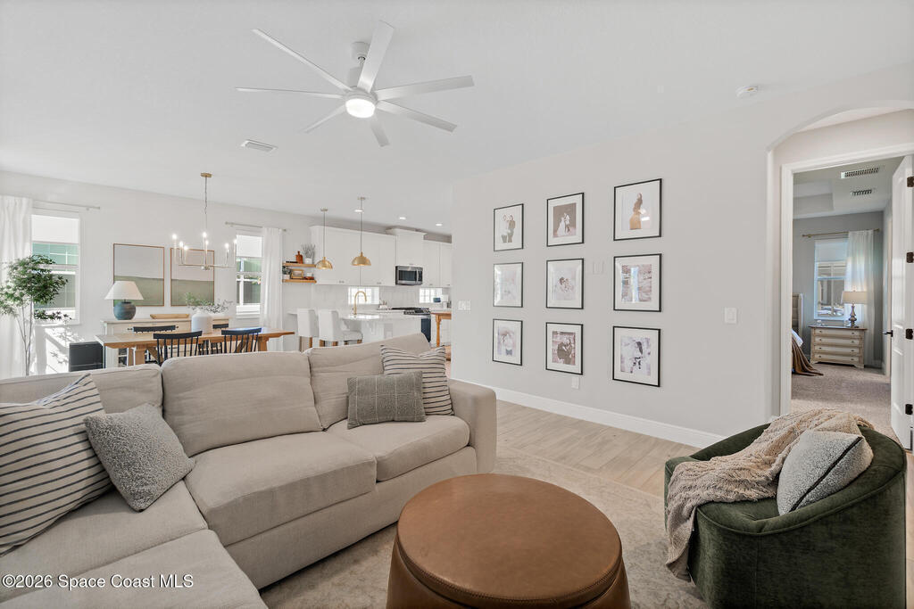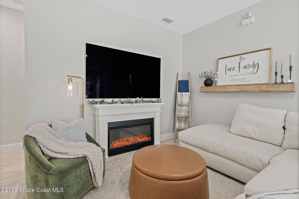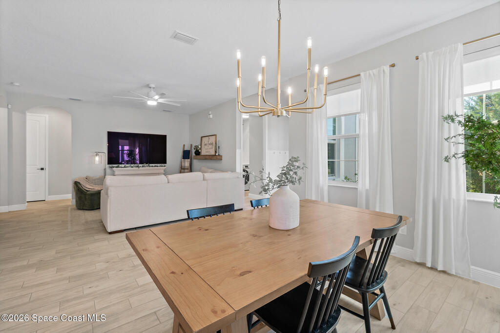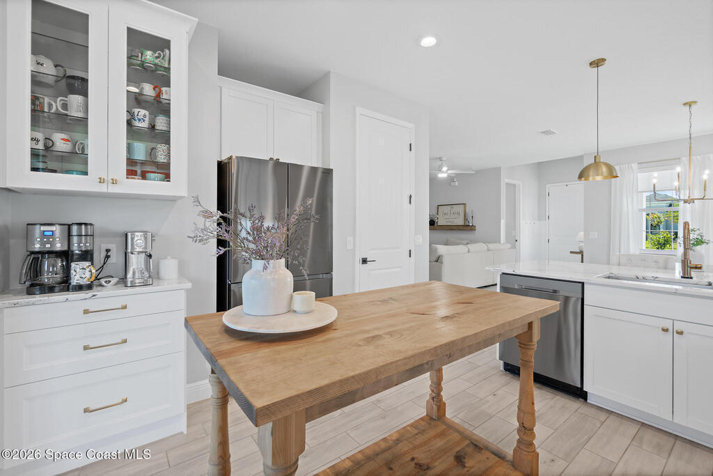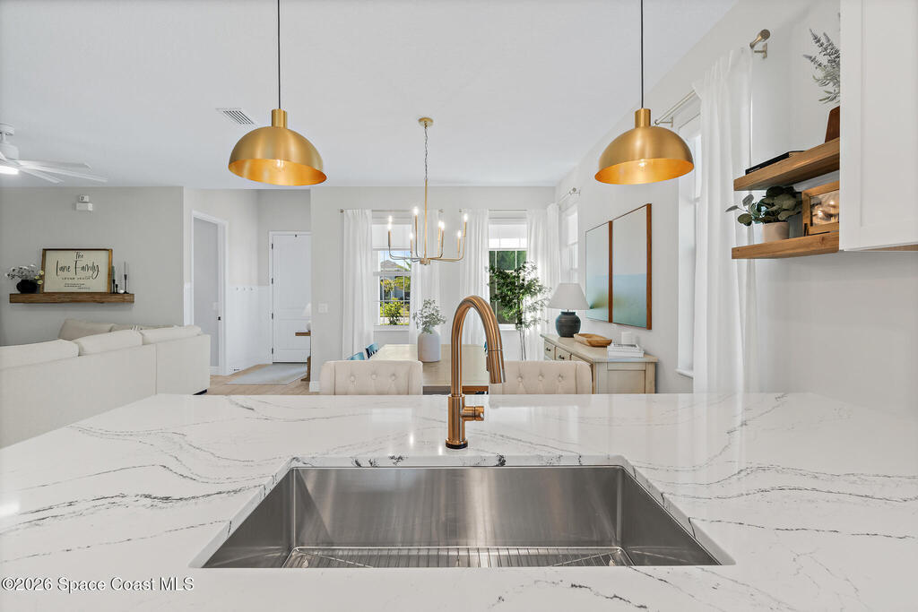 Welcome to 3024 Blazing Star, a beautifully upgraded 3-bedroom, 2-bath, 2-car garage single-family home located in the highly desirable planned community of Viera.This home is full of stunning upgrades. These sellers truly spared no expense. You'll immediately notice the wood-like custom tile flooring throughout the main areas, custom lighting, and a thoughtfully designed laundry room with upgraded finishes. The kitchen is a true showstopper, featuring stunning quartz countertops with subtle drops of gold, a large eat-in island, a charming coffee nook, and a layout perfect for both everyday living and entertaining.All bathrooms have been beautifully put together, continuing the home's cohesive, designer feel.Step outside to enjoy the covered, screened-in patio. Perfect for relaxing or entertaining while enjoying Florida living year-round. Residents also enjoy an incredible lifestyle with access to multiple community parks and the Addison Village Club, offering two pools,