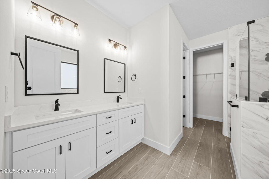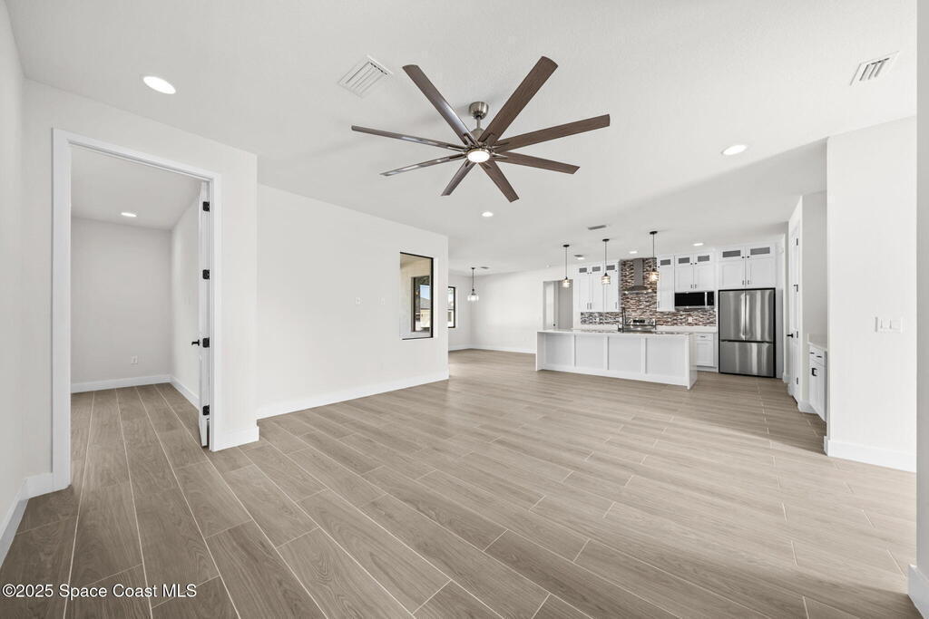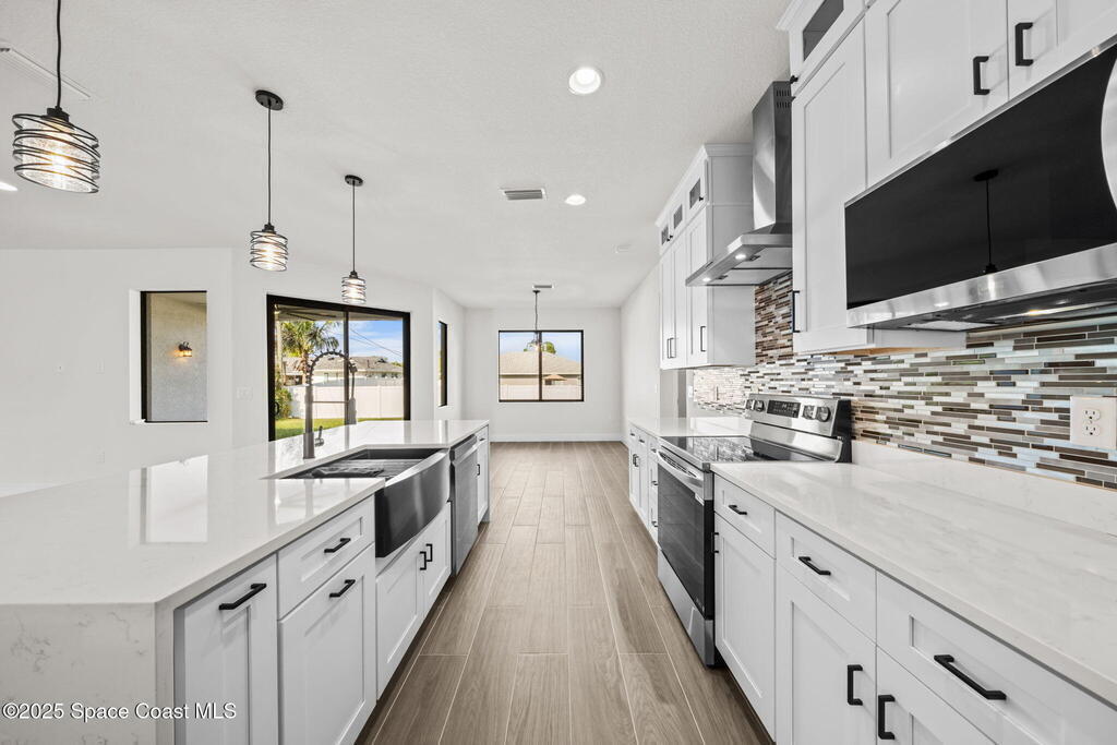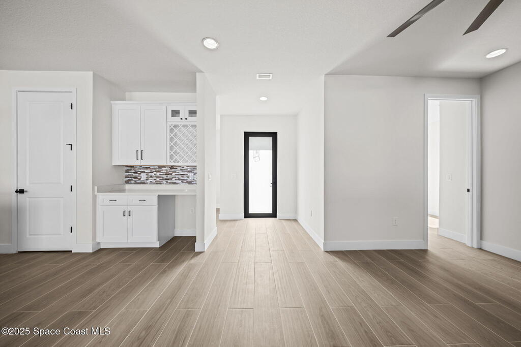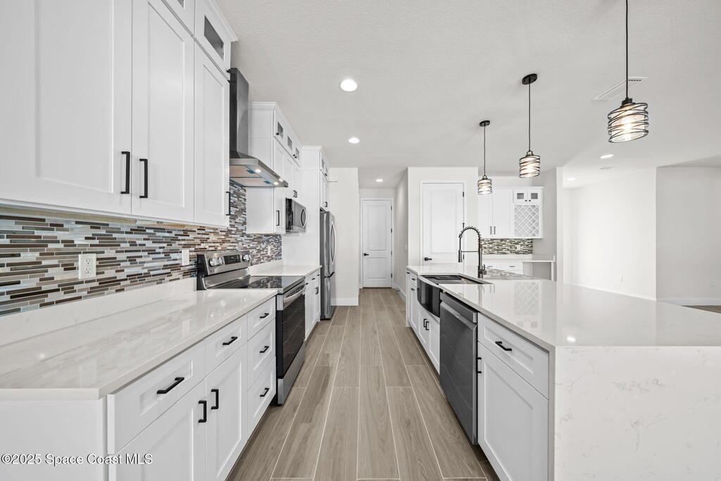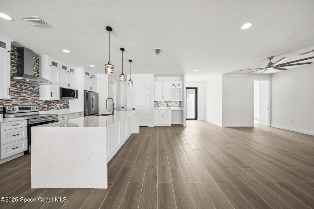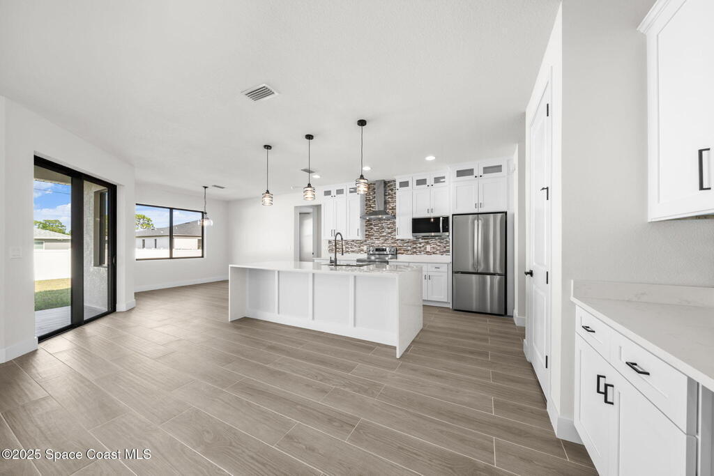 Luxurious new construction! 4 BED | 3 BATH + OFFICE. Paid Closing Costs with builders preferred lender! This home showcases quality at every turn with IMPACT windows & doors, wood-look porcelain tile, soaring 9'4'' ceilings, and 8' interior doors. The gourmet kitchen is a chef's dream featuring a large waterfall quartz island, tile backsplash, ceiling-height soft-close cabinetry, pull-out spice rack & hidden trash bin, pendant lights, exterior vented hood, premium LG appliances with refrigerator included, and bar area with built in wine rack. 4th bedroom is an in-law suite with it's private entrance and kitchenette. The primary suite offers a spa-like retreat with soaking tub, walk-in shower, dual vanities, and walk-in closet. Enjoy a covered patio pre-plumbed for a summer kitchen. Complete with water filtration system, laundry room w/ utility sink, smart fans, light fixtures, 1-year builder warranty and 10 year structural. Staged furniture pictures are of model home.