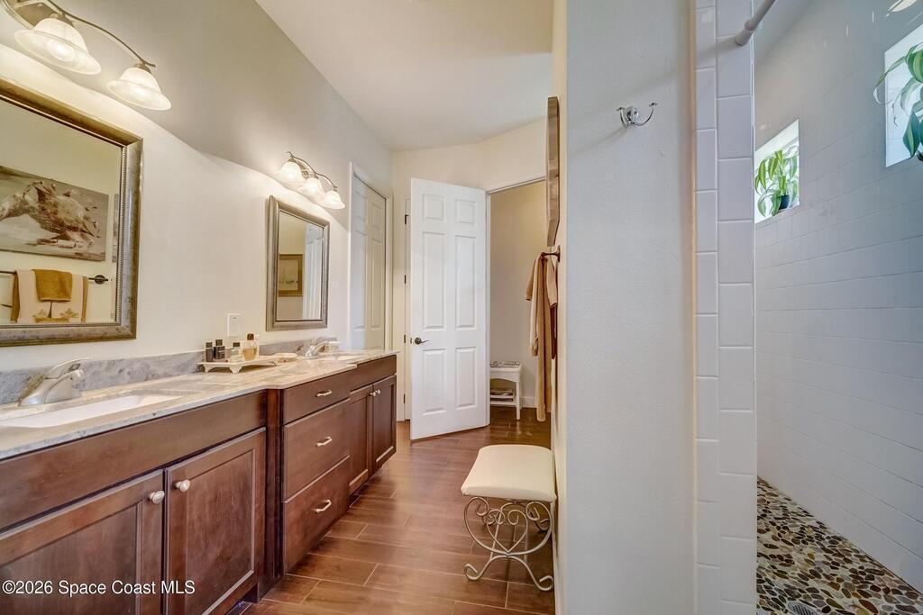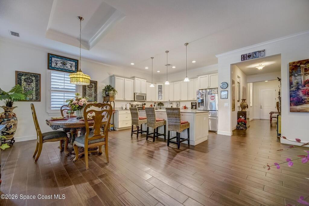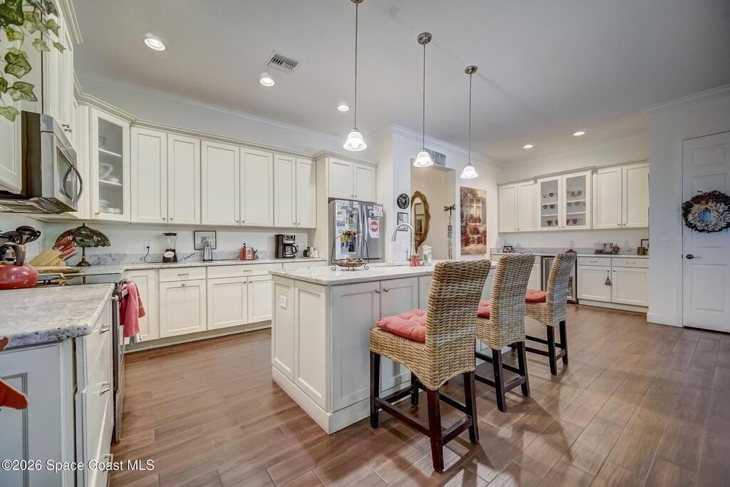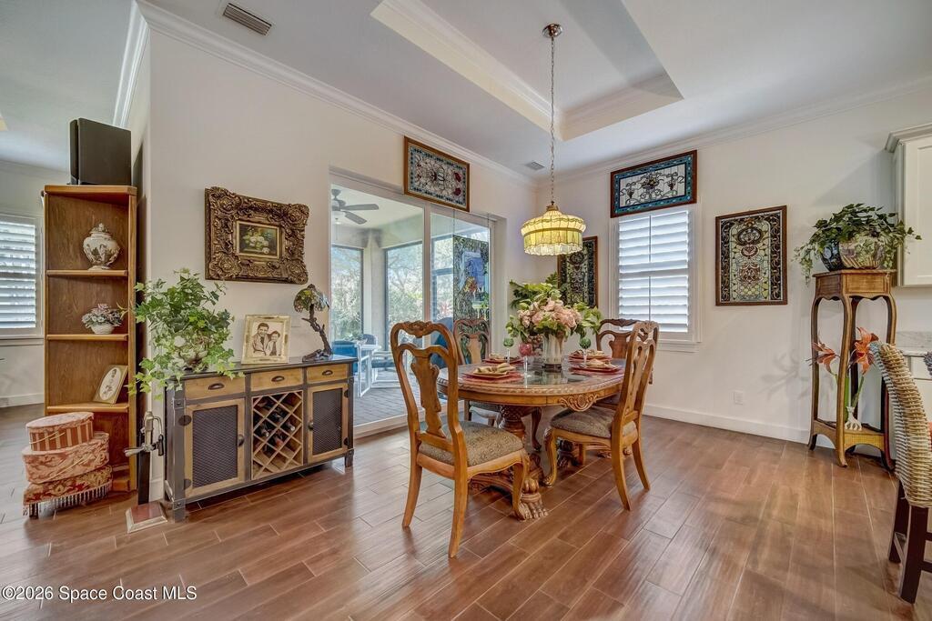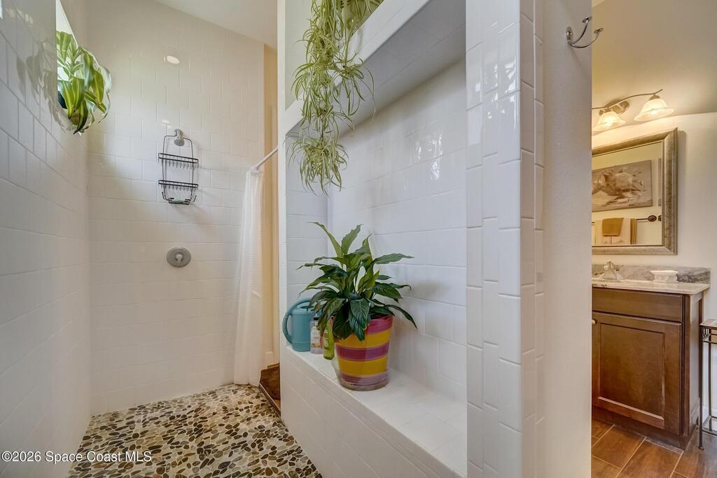 Perfectly situated in the heart of Cocoa Beach, just steps from both the Atlantic Ocean and the Banana River, this stunning beachside villa offers the best of coastal living. This concrete block home with a tile roof and hurricane-impact windows is truly move-in ready and designed for comfort, style, and durability. Spacious 3-bedroom, 2.5-bath residence features 12-foot ceilings and beautiful wood-look tile flooring throughout. Open and airy living spaces include a formal dining room and family room, ideal for everyday living and entertaining. The stylish kitchen is the heart of the home, showcasing granite countertops, stainless steel appliances, a beverage cooler, coffee bar, and custom soft-close cabinetry. The primary suite offers a peaceful retreat with a large walk-in closet and a luxurious en-suite bath featuring double sinks and an oversized Roman shower. A well-appointed laundry room with built-in cabinetry adds both convenience and storage. Located on a private corner lot