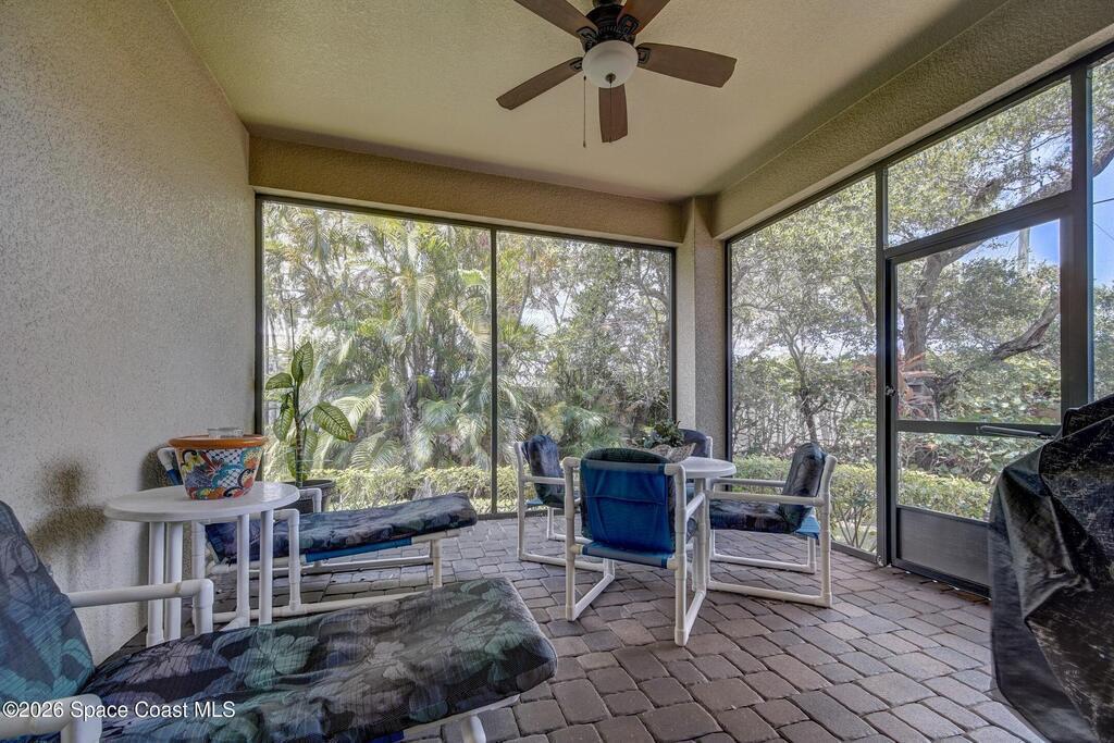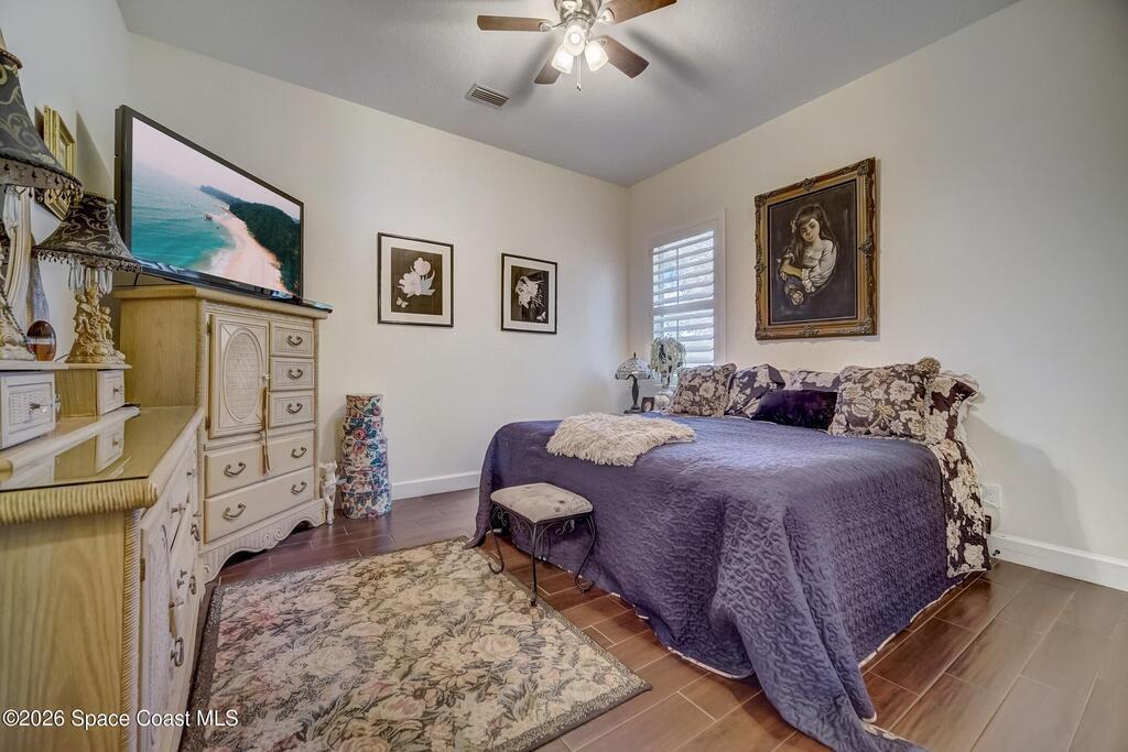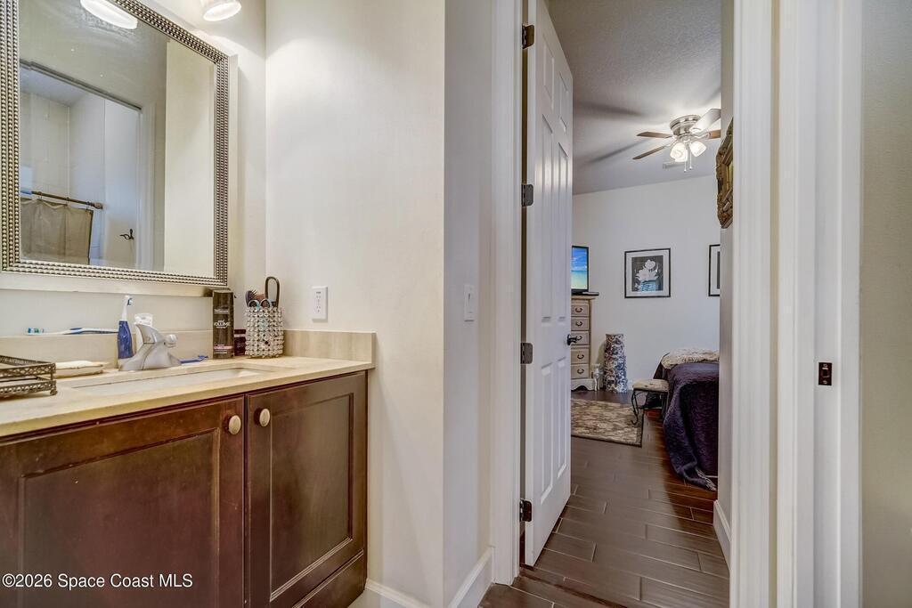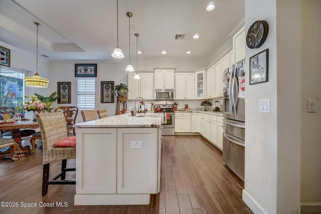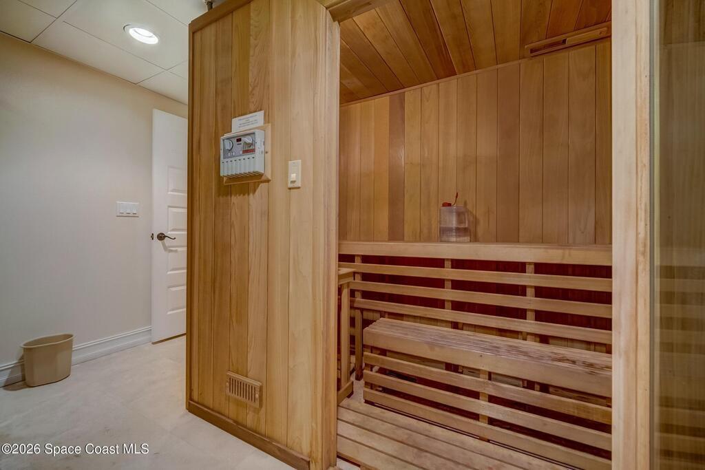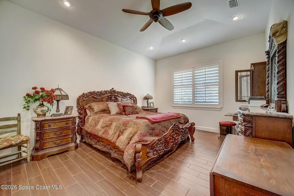 Perfectly situated in the heart of Cocoa Beach, just steps from both the Atlantic Ocean and the Banana River, this stunning beachside villa offers the best of coastal living. This concrete block home with a tile roof and hurricane-impact windows is truly move-in ready and designed for comfort, style, and durability. Spacious 3-bedroom, 2.5-bath residence features 12-foot ceilings and beautiful wood-look tile flooring throughout. Open and airy living spaces include a formal dining room and family room, ideal for everyday living and entertaining. The stylish kitchen is the heart of the home, showcasing granite countertops, stainless steel appliances, a beverage cooler, coffee bar, and custom soft-close cabinetry. The primary suite offers a peaceful retreat with a large walk-in closet and a luxurious en-suite bath featuring double sinks and an oversized Roman shower. A well-appointed laundry room with built-in cabinetry adds both convenience and storage. Located on a private corner lot