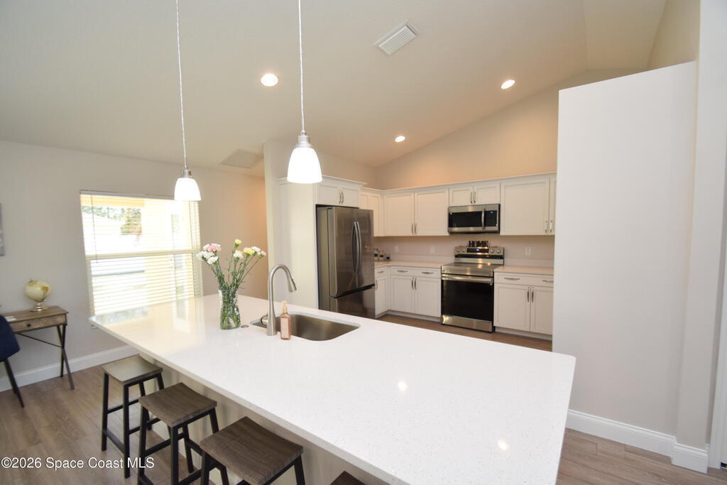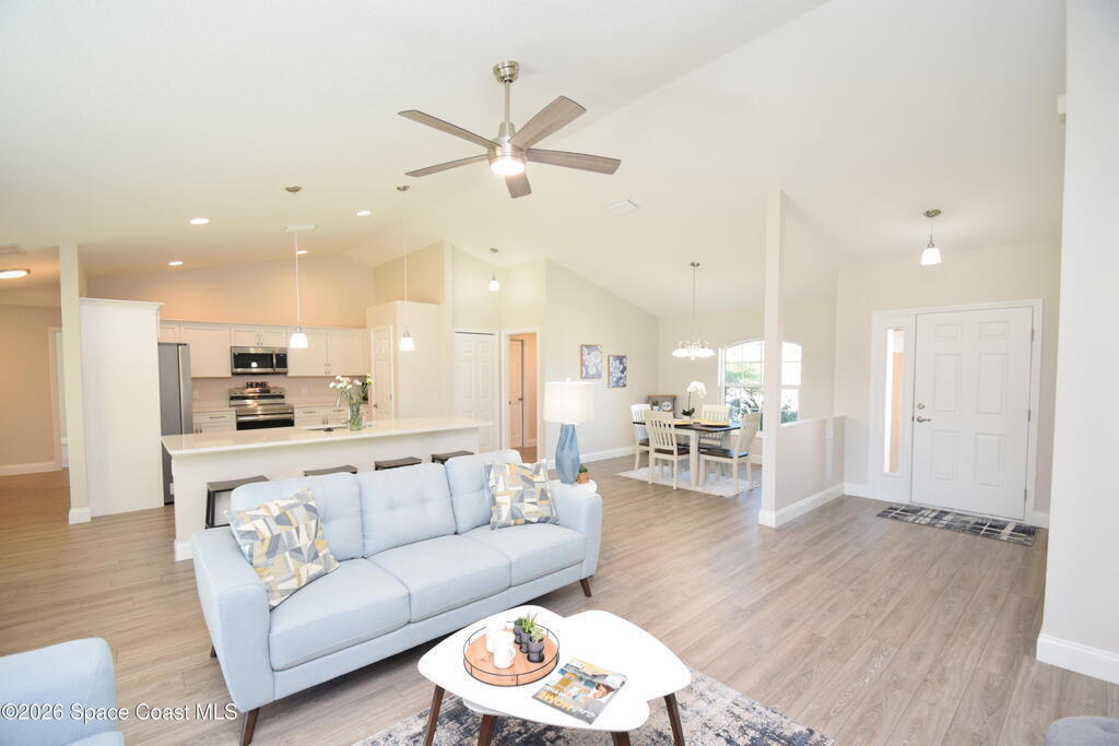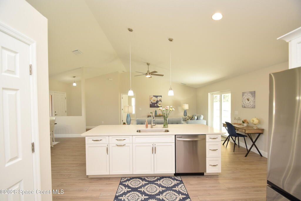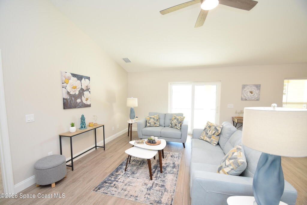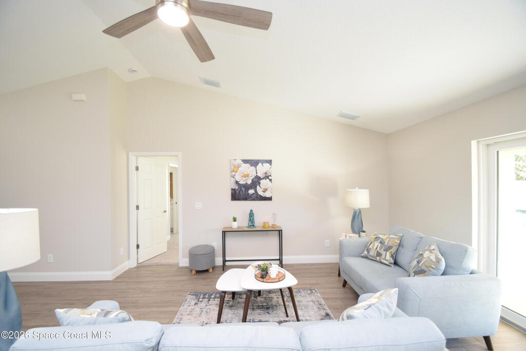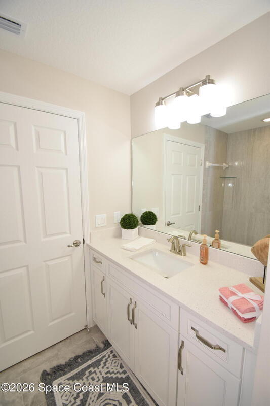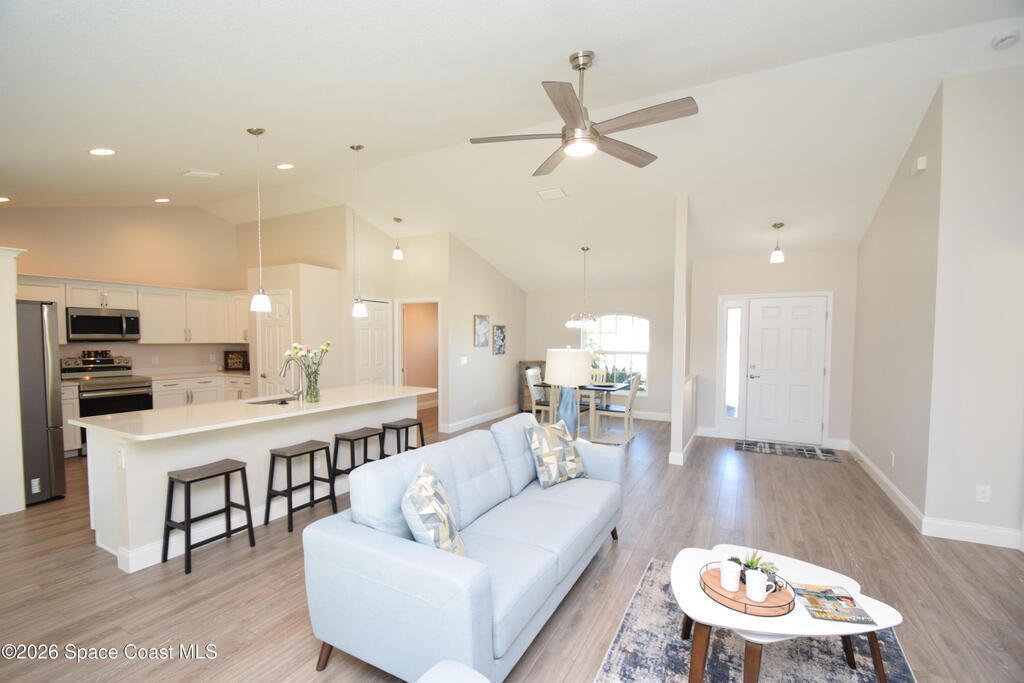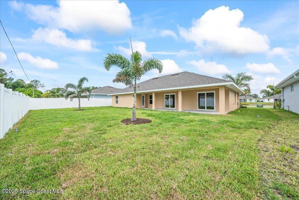 $1,000 DOWN & *ALL CLOSING COSTS PAID with use of Preferred Lender* Additional Incentives available! MOVE IN READY / EXPRESS CLOSE! Brand New and READY NOW! Lot 29 in Sanibel Cove a New community in Palm Bay with 50 homesites total. Enjoy this beautiful 3 bed 2 bath 2 car garage with large back porch. Open plan design with family room, dining room open to kitchen with large island breakfast bar & Fully equipped kitchen with all higher end appliances and Quartz counterops. Beautiful vinyl plank flooring in all main living areas, tile in bathrooms & upgraded carpet in 3 bedrooms. Master suite boasts tray ceiling, slider door direct access to covered porch, & a large glamour master bathroom with soaking tub, spacious tile walk in shower, dual sink vanity with Quartz countertops & walk in closet. Other features: ceiling fans, soft close cabinets with crown, indoor laundry room, garage door opener, brick paver driveway, city water & sewer, sidewalks & much more!