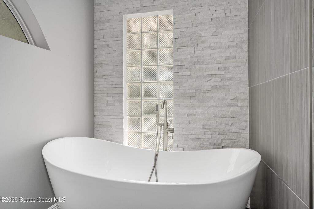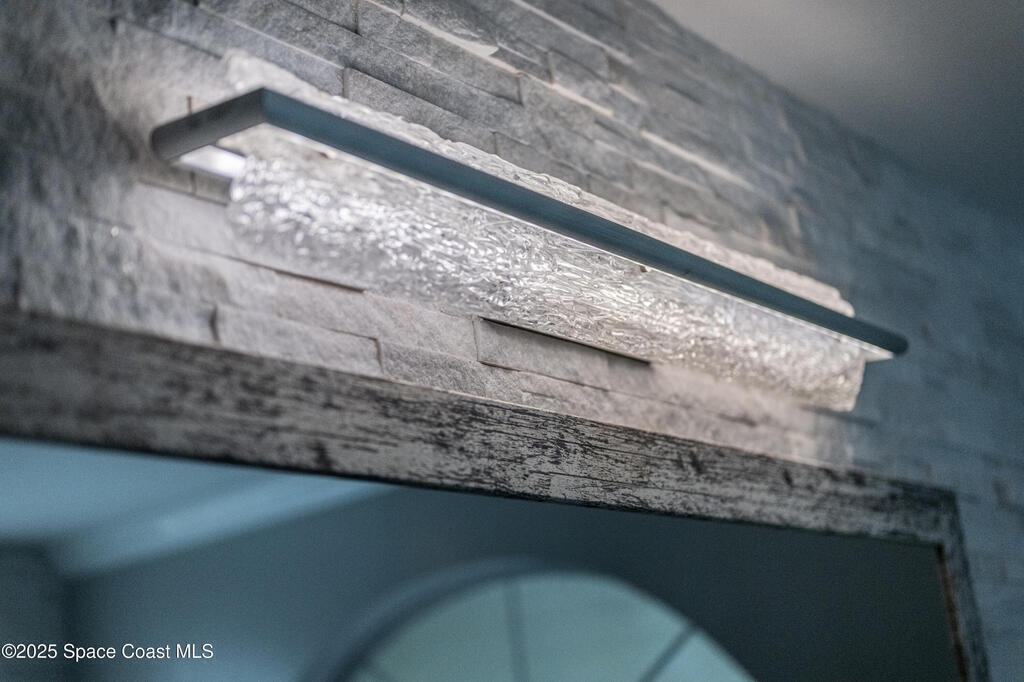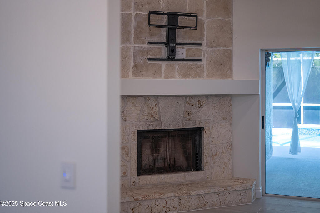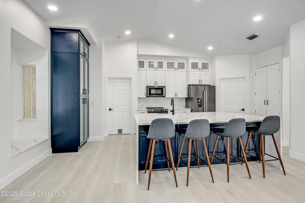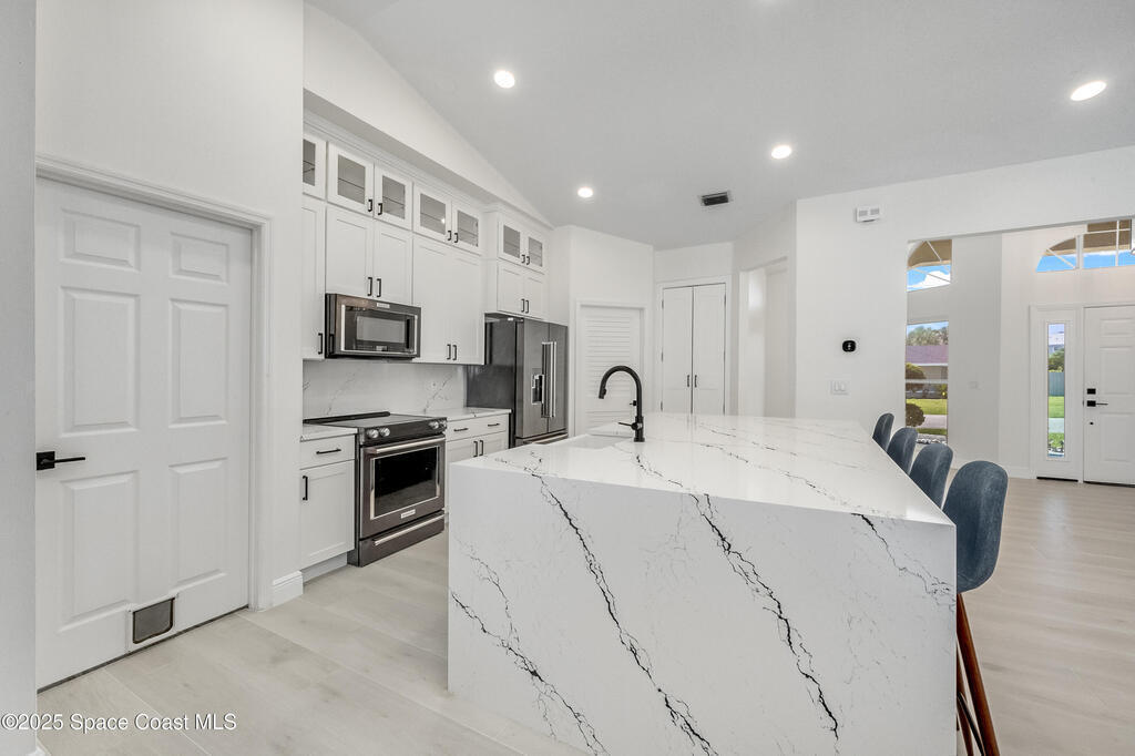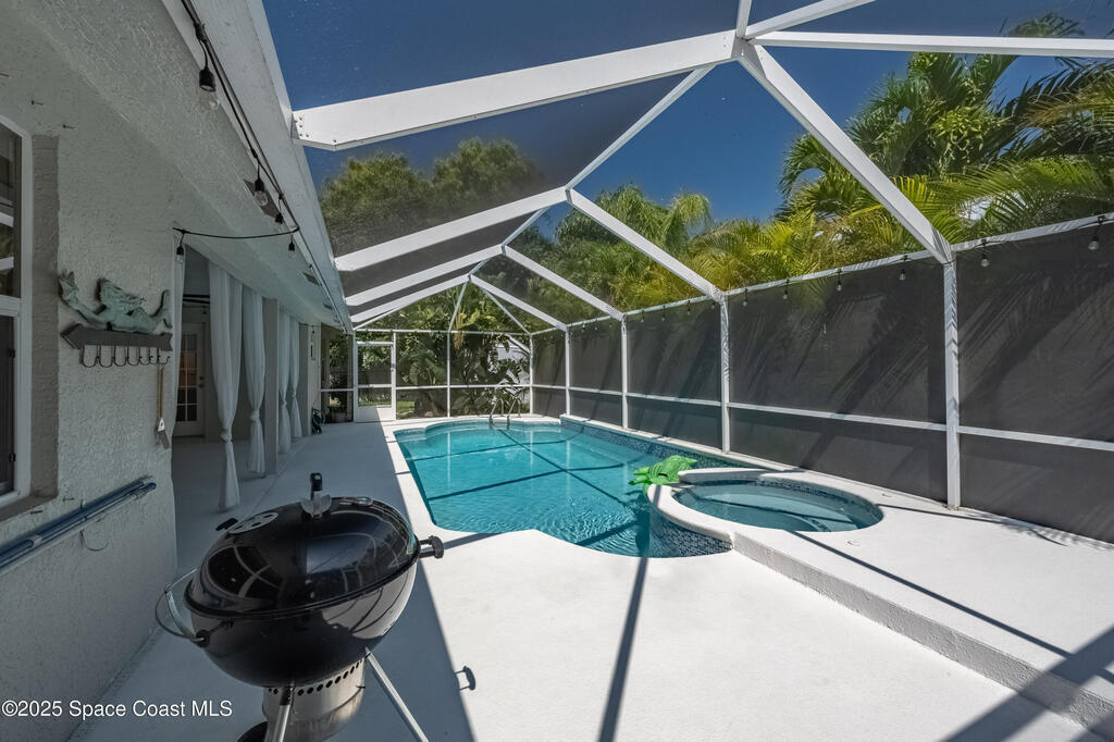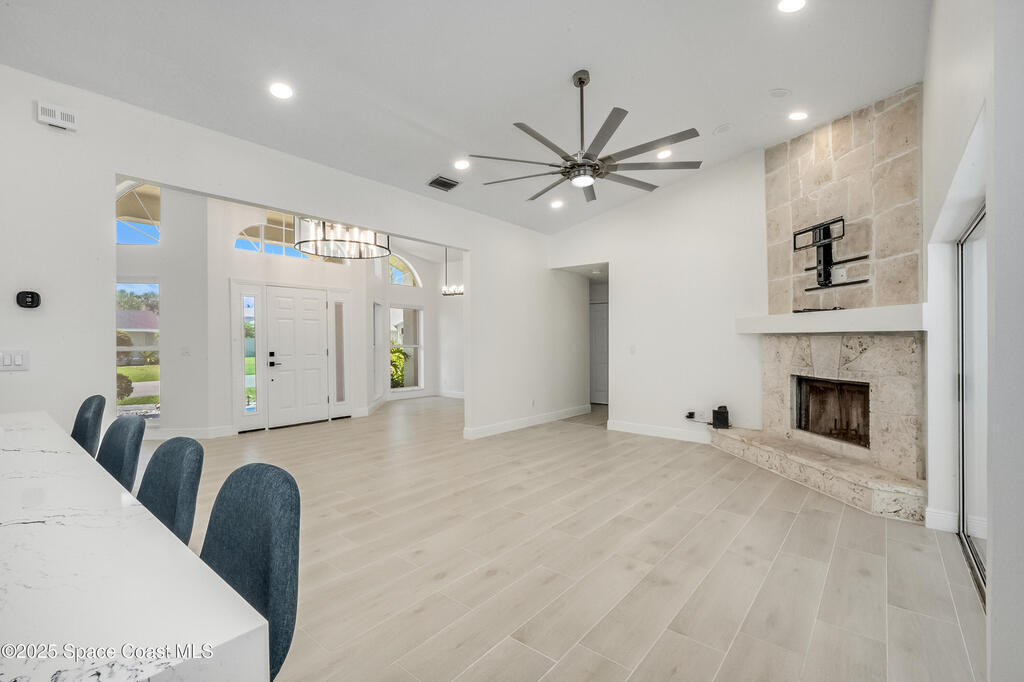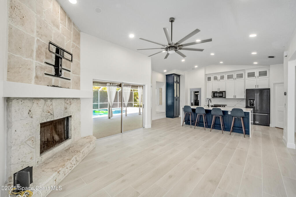 Experience the epitome of quiet, coastal living in this stunning 4-bedroom, 2-bathroom sanctuary, located 800 feet from pristine Melbourne Beach! This home offers the luxury you've been searching for, featuring soaring cathedral ceilings and a cozy wood-burning fireplace. The heart of the home is a masterfully remodeled gourmet kitchen, featuring a KitchenAid stainless steel appliance package, elegant veined quartz countertops with a dramatic waterfall edge and a large farmhouse sink. You'll also find a unique, pantry designed for maximum storage. The interior layout is perfectly designed for modern needs, featuring a formal dining room and a separate office or play area. The Master Suite is a true retreat with shiplap accents and a large walk-in closet. The ensuite bath features a luxury freestanding tub and an incredible multi-head massage shower system. Outside, enjoy a heated, caged pool with a with a jetted tub and a covered dining area. This home truly has it all!