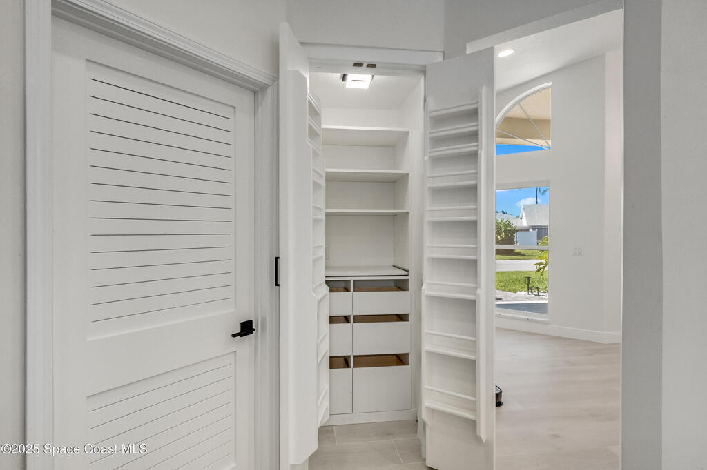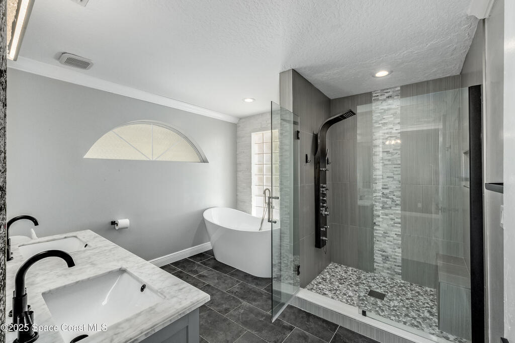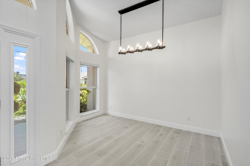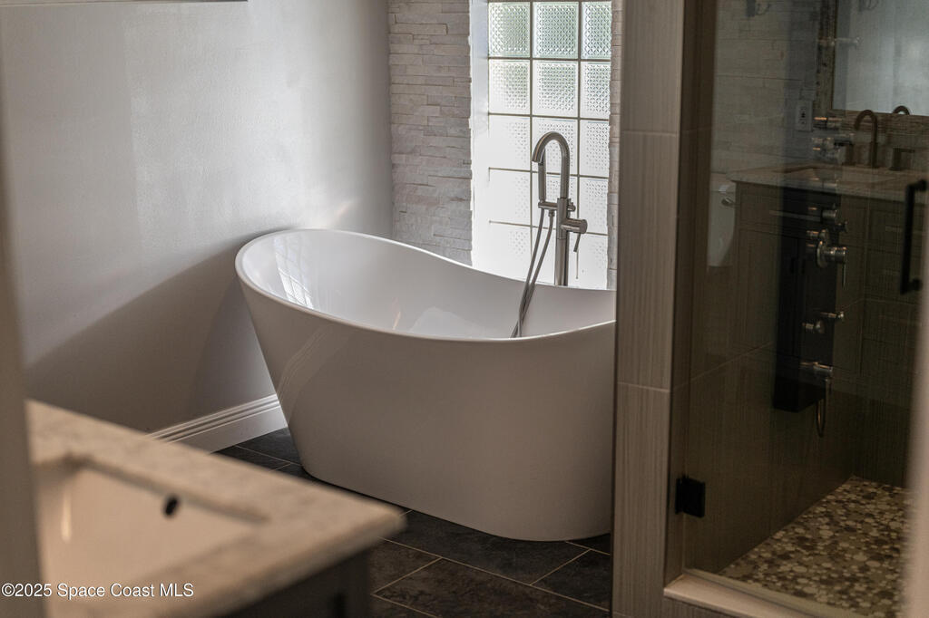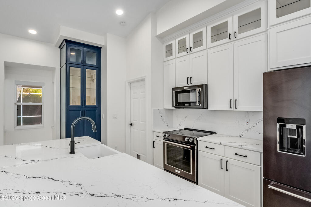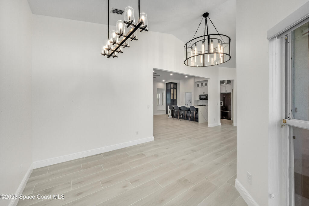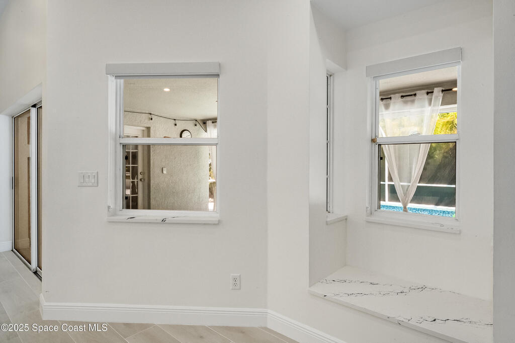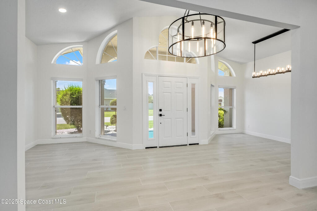 Experience the epitome of quiet, coastal living in this stunning 4-bedroom, 2-bathroom sanctuary, located 800 feet from pristine Melbourne Beach! This home offers the luxury you've been searching for, featuring soaring cathedral ceilings and a cozy wood-burning fireplace. The heart of the home is a masterfully remodeled gourmet kitchen, featuring a KitchenAid stainless steel appliance package, elegant veined quartz countertops with a dramatic waterfall edge and a large farmhouse sink. You'll also find a unique, pantry designed for maximum storage. The interior layout is perfectly designed for modern needs, featuring a formal dining room and a separate office or play area. The Master Suite is a true retreat with shiplap accents and a large walk-in closet. The ensuite bath features a luxury freestanding tub and an incredible multi-head massage shower system. Outside, enjoy a heated, caged pool with a with a jetted tub and a covered dining area. This home truly has it all!
