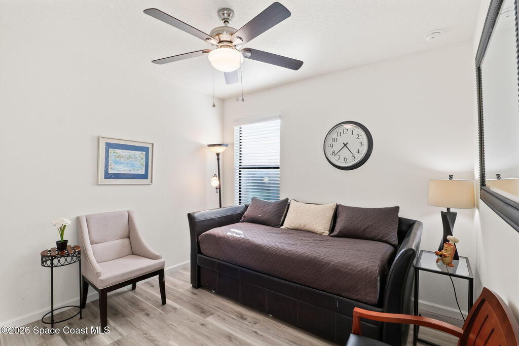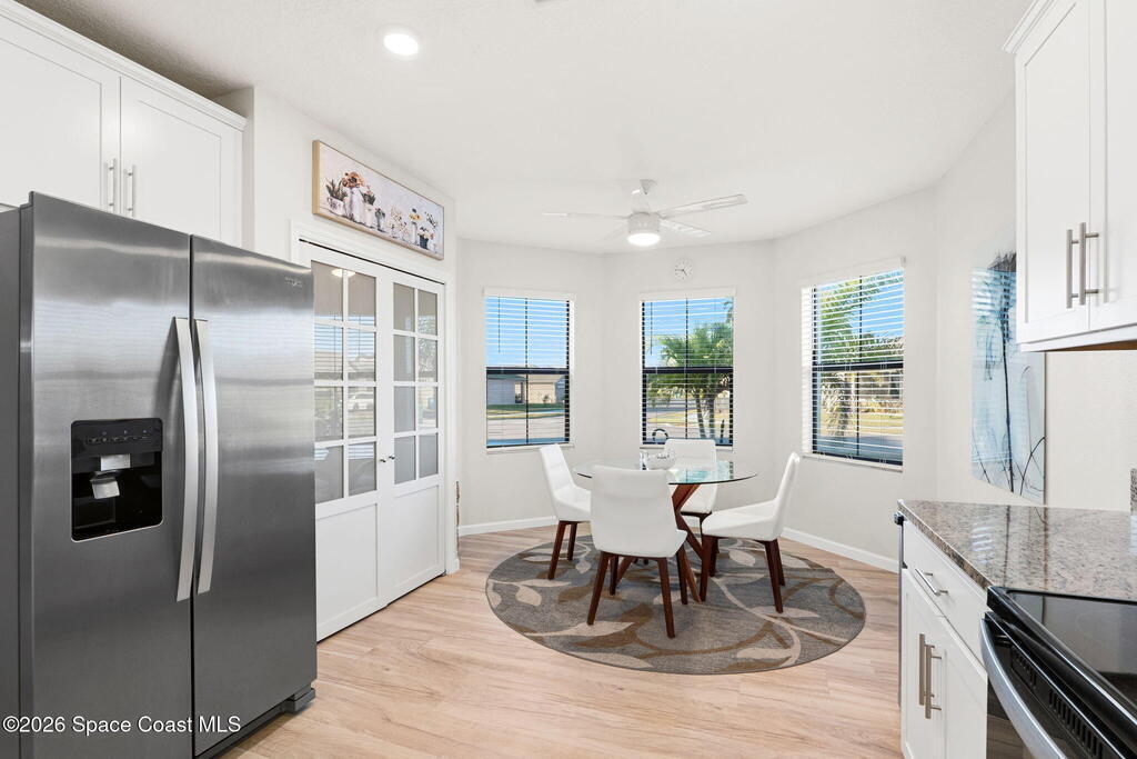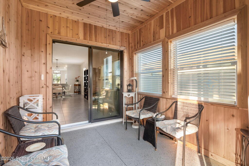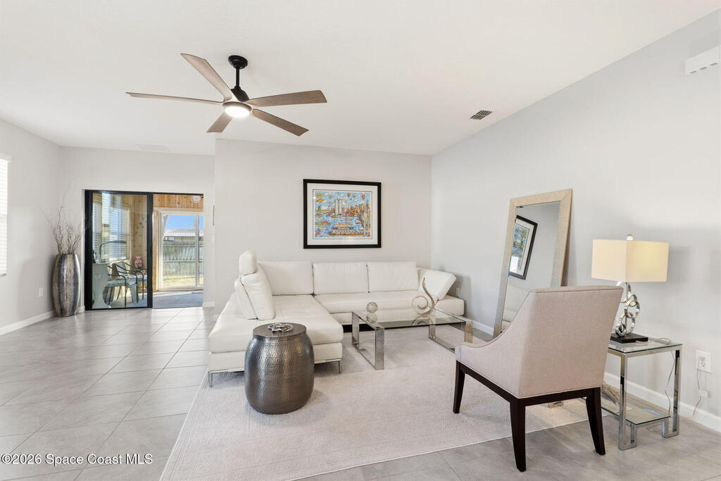 Better than new and lovingly maintained by the original owner! This beautifully customized home offers comfort, style, and thoughtful design. The kitchen features stainless steel appliances, a custom built-in pantry, upgraded sink, and an eat-in area with bay windows. Cosmetic updates include vinyl flooring in the bedrooms, modern ceiling fans, and stylish light fixtures. Accessibility-focused enhancements include widened access to the kitchen, primary bedroom, and primary bathroom with a large roll-in shower that can accommodate a walker or wheelchair plus grab bars in both the shower and toilet areas. The enclosed porch features impact windows and custom wood paneling for a spa-like feel. Located in the Crystal Bay community with clubhouse, pool, fitness center, pickleball and bocce courts, dog park, and proximity to the Indian River Lagoon.