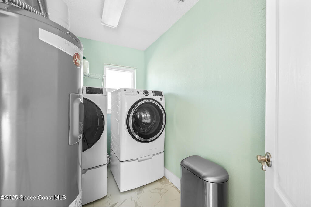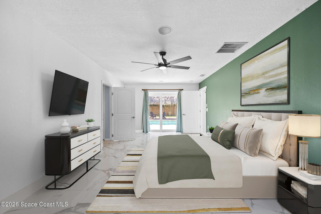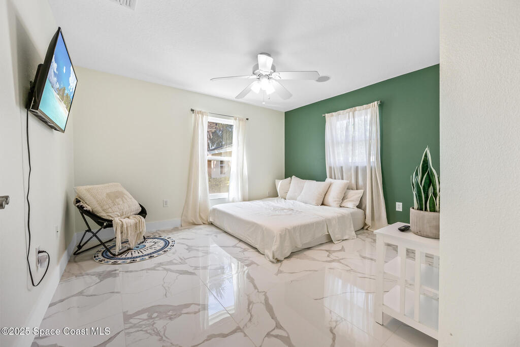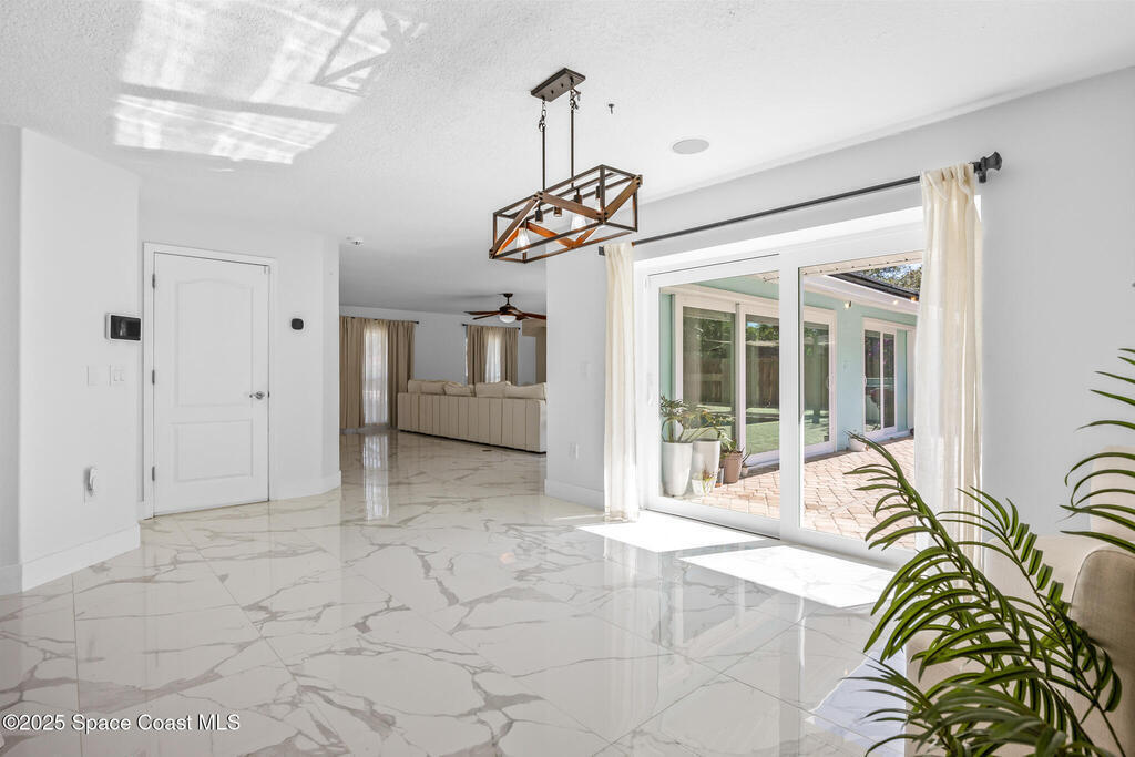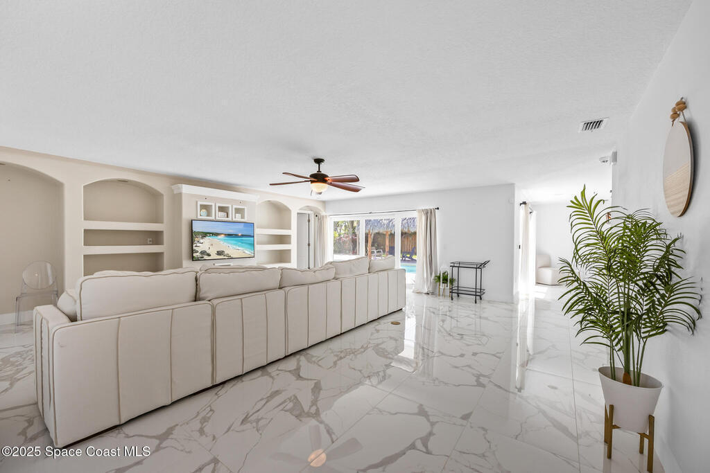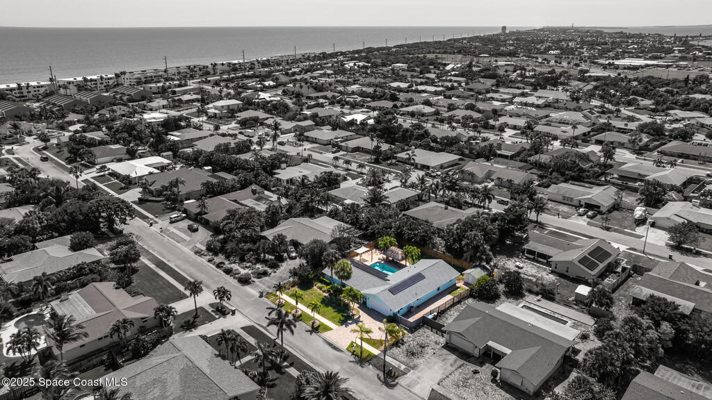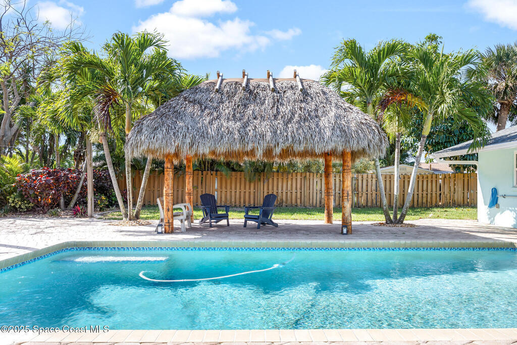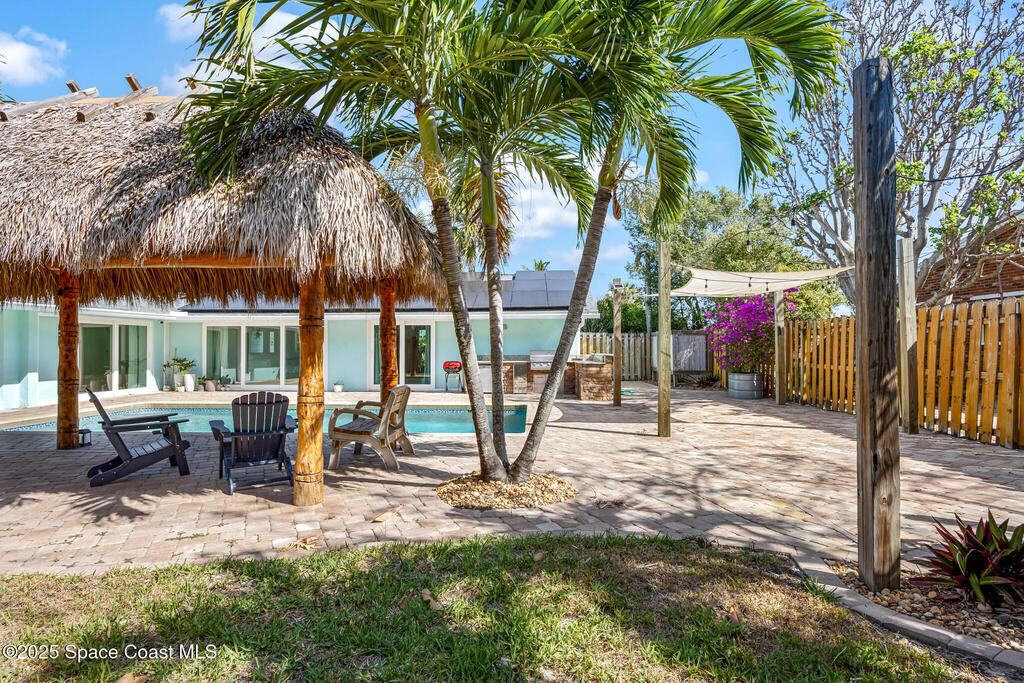 Beautifully upgraded Melbourne Beach retreat offers resort-style living just a short walk to the ocean. Featuring a 2024 roof, sleek porcelain tile throughout, and a new refrigerator, this home blends style and function. Impact-rated windows and sliders, plus a smart security system with cameras, add peace of mind. The open layout includes a well-appointed kitchen with granite counters, breakfast bar, and double ovens. Outside, a tropical paradise awaits: oversized pool, massive tiki hut, covered lounge areas, and a fully equipped outdoor kitchen--perfect for entertaining. Additional highlights include a solar panel system with EV charging, RV/boat parking pad, outdoor shower, storage shed, and lush landscaping. No HOA and close to restaurants, parks, and shopping. Ideal for full-time living, second home, or vacation rental. Live the Florida lifestyle with space, privacy, and high-end upgrades in a prime beachside location.