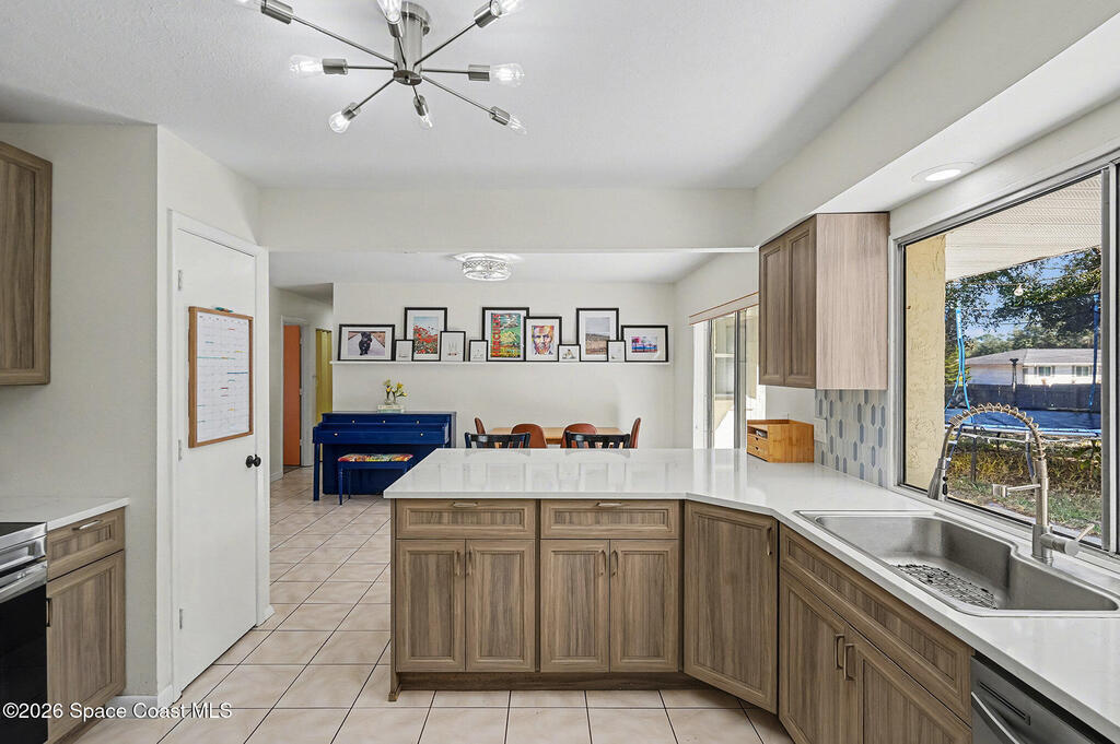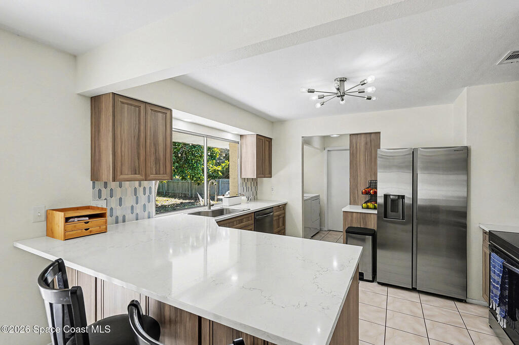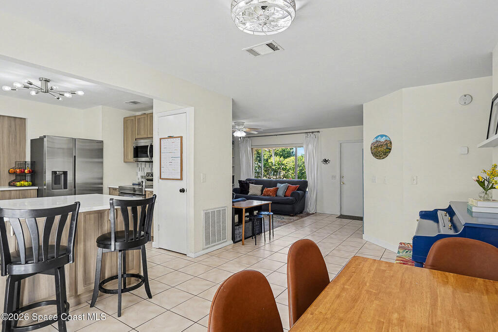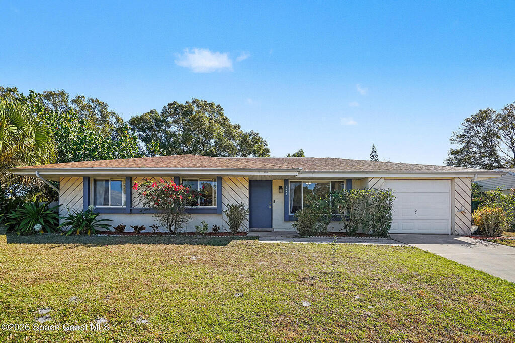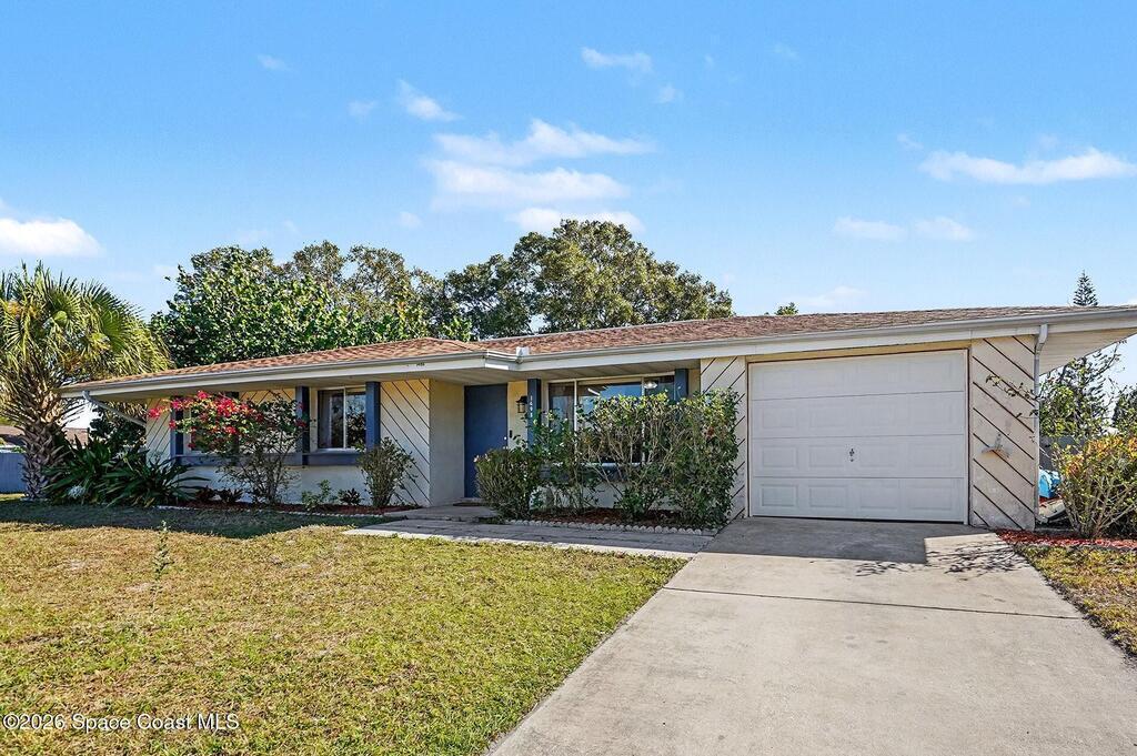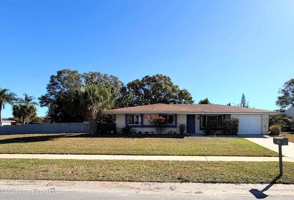 3 bedroom, 2 bath concrete block house with garage on ~1/3 acre. Kitchen updated in 2023 with all new cabinetry, appliances & quartz counters. HVAC 2025. Roof 2018. Updated electric for overhead lighting & fans in all bedrooms, kitchen, living & dining rooms. Interior laundry room. Board & batten entry wall with hooks. Freshly painted. Primary bedroom has a private bathroom & walk-in-closet. Fully fenced backyard on an oversized corner lot. Fruit trees: avocado, mango, banana, clementine, pomegranate. City water & sewer. Prime location just south of Palm Bay Road convenient to major employers, I-95, parks, shopping, and schools. No HOA.