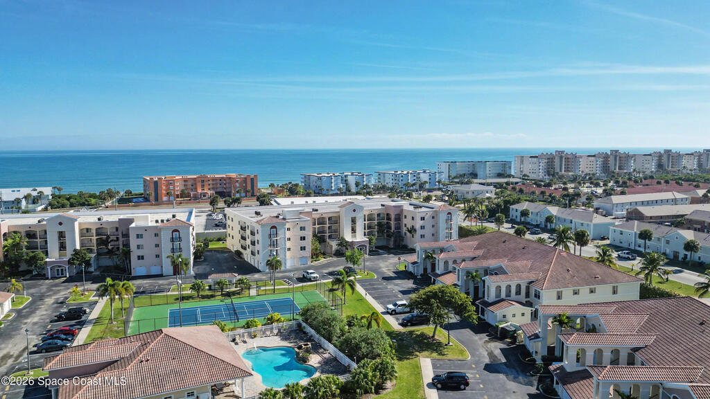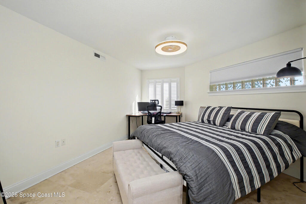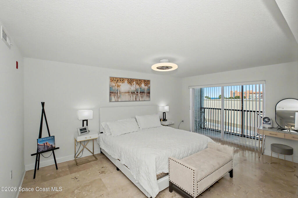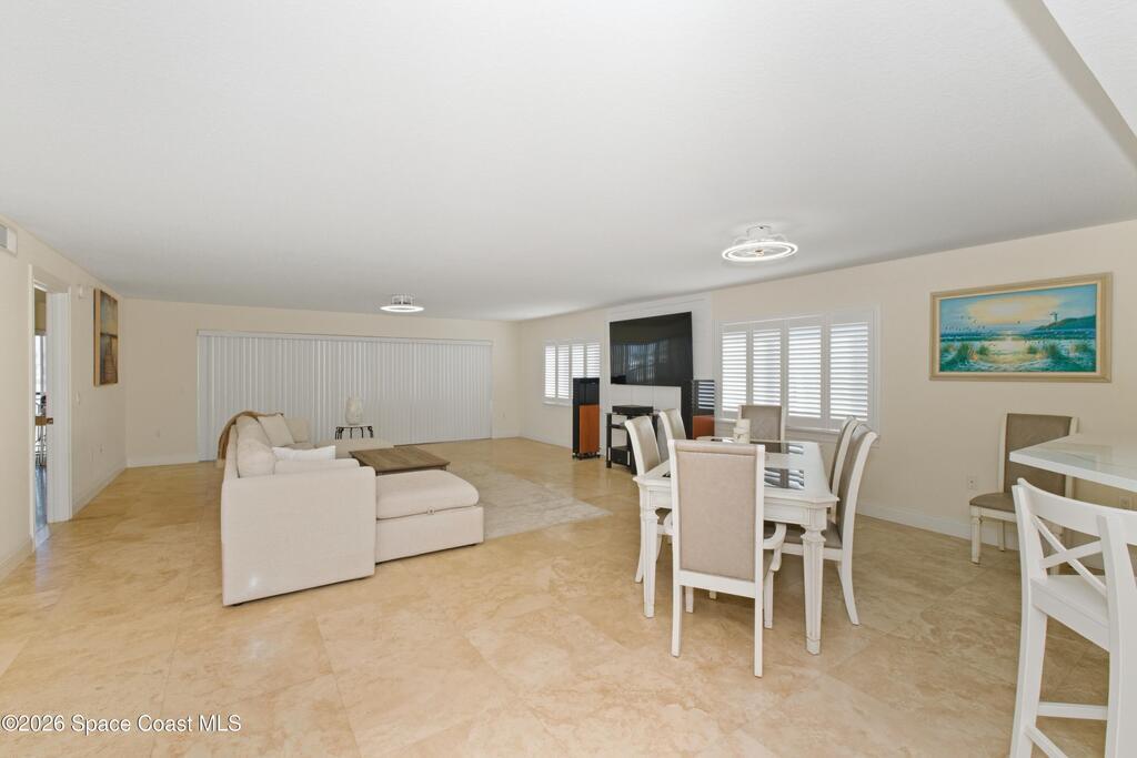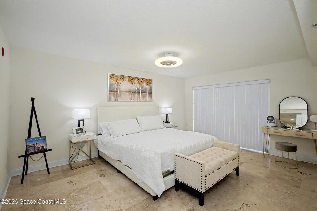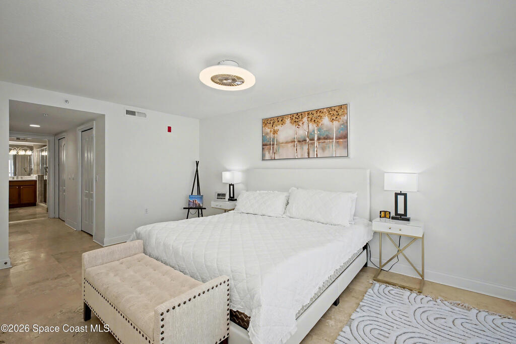 THE ULTIMATE BEACHSIDE HIDEAWAY: LUXURY CORNER END-UNIT + 2 GARAGE SPACES. Just steps to the sand, approximately 200 yards to the beach via a dedicated pedestrian walkway, this rare Southeast corner end-unit delivers extra privacy, abundant natural light, and turn-key coastal upgrades. Fully renovated with travertine stone flooring throughout, absolutely zero carpet. Stunning gourmet kitchen featuring a massive white quartz waterfall island, updated cabinetry, and designer shiplap millwork for a custom, high-end feel. Spa-inspired bathrooms with quartz vanities, updated showers, and modern fixtures. Impact windows, custom plantation shutters, and newer washer, dryer, and hot water tank (approx. 2 years). The golden ticket is parking: TWO deeded spaces, private enclosed garage plus coveted under-building space . Resort-style Palm Springs amenities include pool, clubhouse, fitness center, tennis and pickleball. Walk to dining, shopping, and beach living made easy.