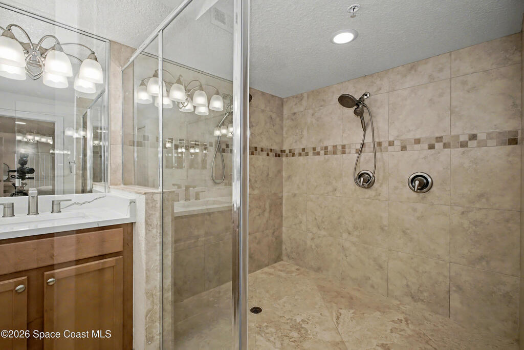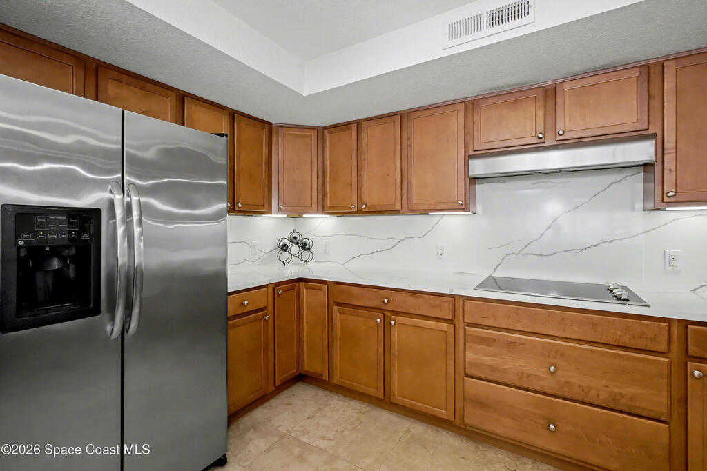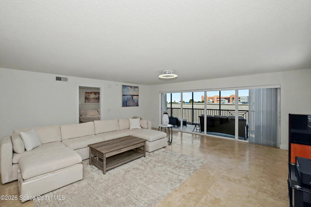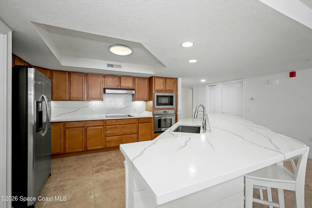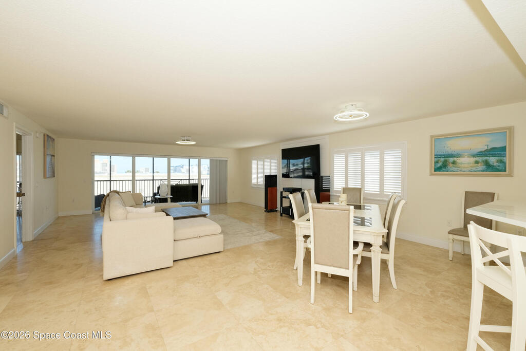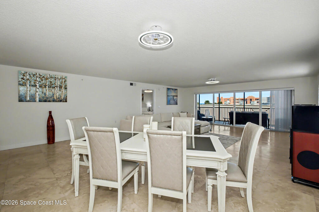 THE ULTIMATE BEACHSIDE HIDEAWAY: LUXURY CORNER END-UNIT + 2 GARAGE SPACES. Just steps to the sand, approximately 200 yards to the beach via a dedicated pedestrian walkway, this rare Southeast corner end-unit delivers extra privacy, abundant natural light, and turn-key coastal upgrades. Fully renovated with travertine stone flooring throughout, absolutely zero carpet. Stunning gourmet kitchen featuring a massive white quartz waterfall island, updated cabinetry, and designer shiplap millwork for a custom, high-end feel. Spa-inspired bathrooms with quartz vanities, updated showers, and modern fixtures. Impact windows, custom plantation shutters, and newer washer, dryer, and hot water tank (approx. 2 years). The golden ticket is parking: TWO deeded spaces, private enclosed garage plus coveted under-building space . Resort-style Palm Springs amenities include pool, clubhouse, fitness center, tennis and pickleball. Walk to dining, shopping, and beach living made easy.