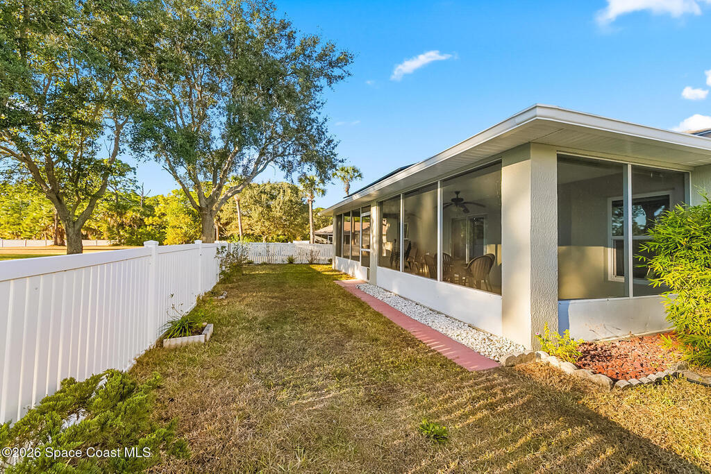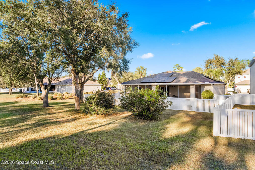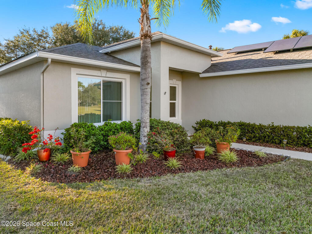 Step into this beautifully maintained, move in ready home nestled within a secure, gated community in Bayside Lakes where comfort, style, and peace of mind come together effortlessly. Home features an open concept floor plan that flows gracefully from room to room with split bedrooms. The living and dining areas open to a spacious screened patio -- an ideal spot for morning coffee, quiet evenings, or enjoying Florida's breeze. Upgrades include kitchen cabinets, granite countertops, stainless steel appliances, new roof installed in 2025, hurricane impact windows, and energy efficient tankless water heater, leased solar panels.Low HOA fees add incredible value convenience with lawncare, irrigation, gated access, and full use of resort-style amenities, including two pools, clubhouse, fitness center, tennis courts, and more. CITY WATER CITY SEWER, concrete block construction, located minutes from shopping, dining, nearby schools in walking distance, Majors Golf Club, medical facilities