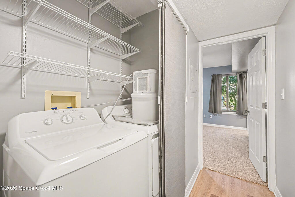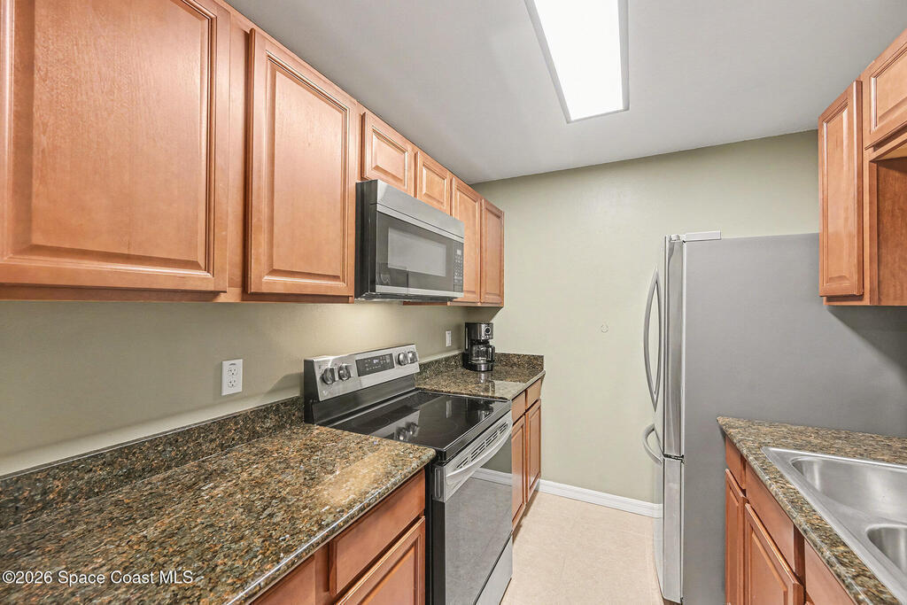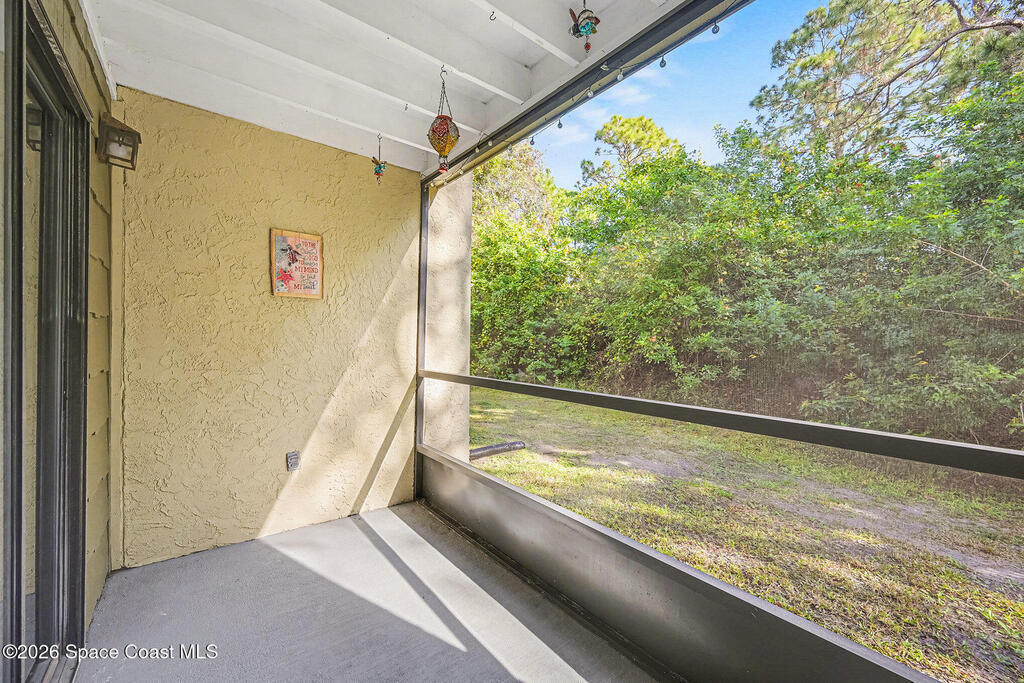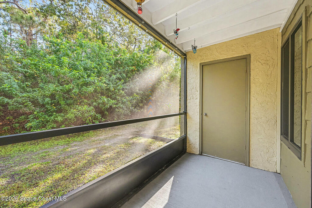 Amazing remodeled condo in desirable Villas at LaCita. 1st floor, spacious 2 full beds, 2 full remodeled baths. New luxury vinyl plank floors throughout living areas & guest room, Brand new carpet in primary bedroom, tile in all wet areas. Modern remodeled kitchen, ample prep space & storage in wood cabinets, granite counters, 2 yr old stainless appliances. Large living room overlooks screen enclosed porch w/added storage closet. Backs to private wooded setting. AC 3 years & serviced regularly. Impact windows 2023. HWH, Washer & Dryer in unit 4 yrs old. Professionally managed well maintained community with on-site office. Beautiful pool & bar area, Lighted community tennis courts, Shuffleboard & picnic area, Work-out gym. Meeting room for condo meetings. Walking paths throughout community include dog care stations. LaCita Country Club and Golf Course 0.8 mi away! About a mile to 2 different riverfront parks for viewing rocket launches or enjoying shops & dining at Titus Landing.