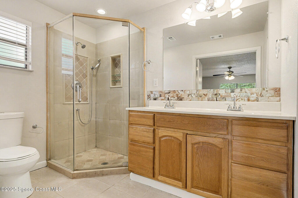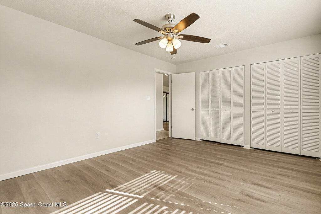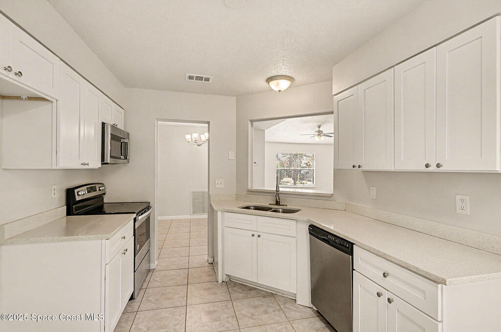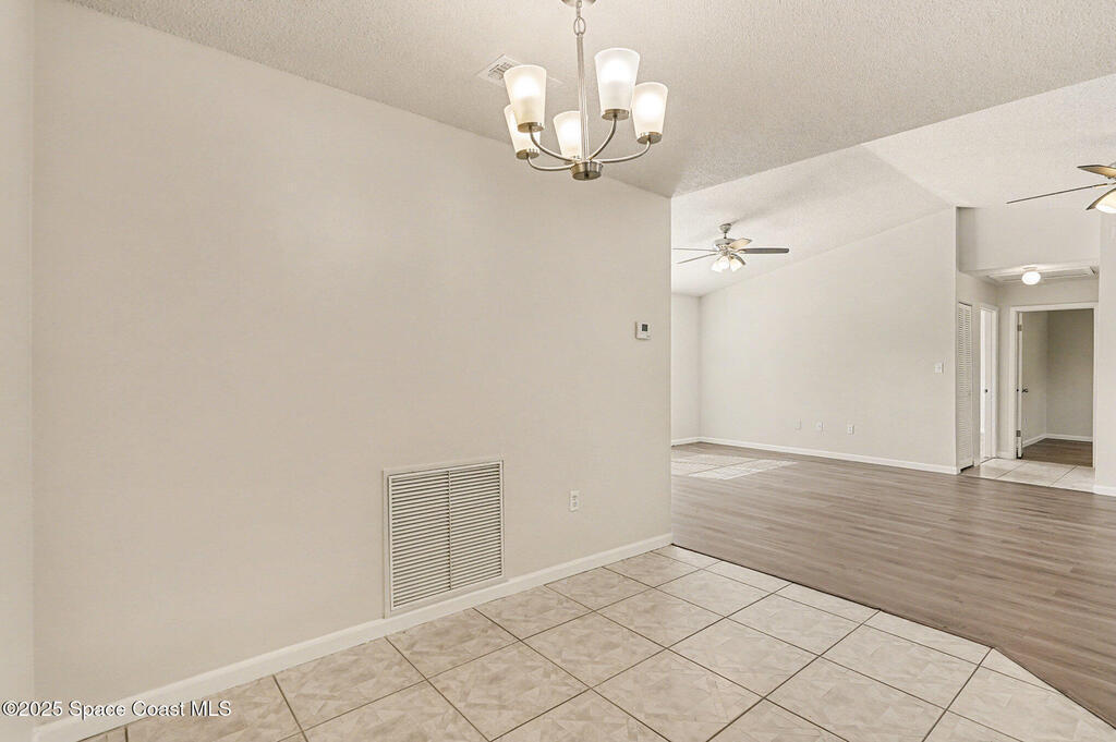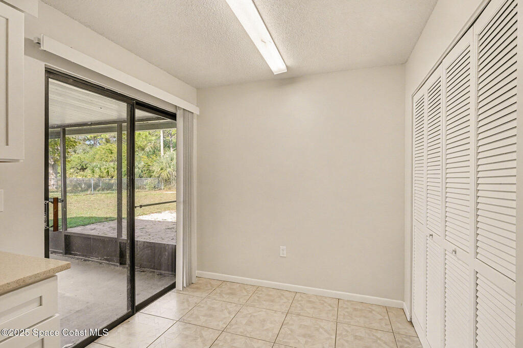 Welcome to this beautifully finished home in desirable NW Palm Bay, offering privacy, style, and a thoughtful layout. The kitchen shines with white shaker cabinets, quartz countertops, stainless steel range, dishwasher, and microwave, all overlooking a bright breakfast nook with peaceful backyard views. Vinyl plank flooring runs throughout the main living areas for a clean, modern feel. The split bedroom plan provides ideal privacy for both homeowners and guests. The primary suite features double-door entry, a spacious en-suite with dual sink vanity, a tiled walk-in shower with glass door, and a generous walk-in closet. Step outside to a screened lanai and extended patio, perfect for relaxing or entertaining. The fully fenced backyard backs to acreage along Hield Rd, creating a rare sense of seclusion with no direct rear neighbors.