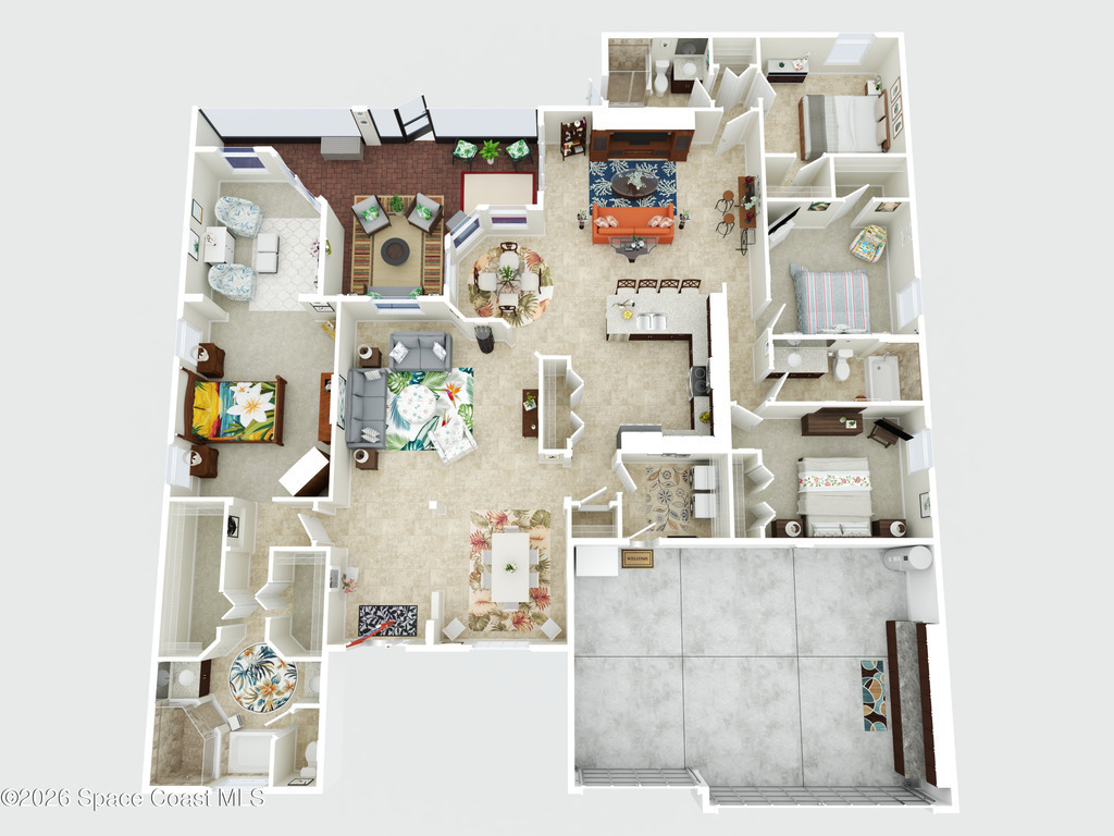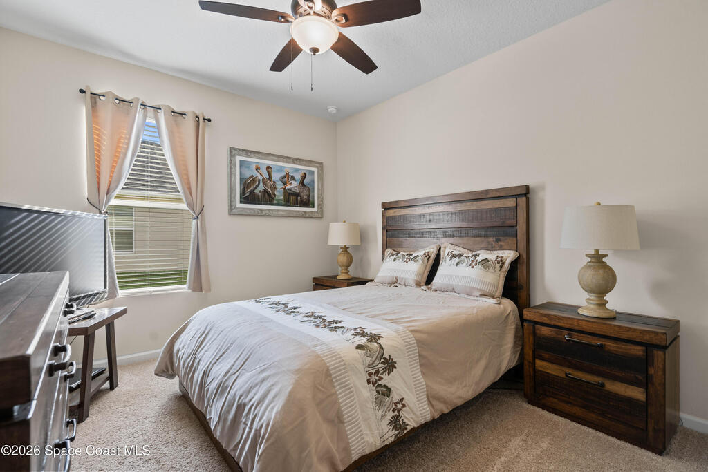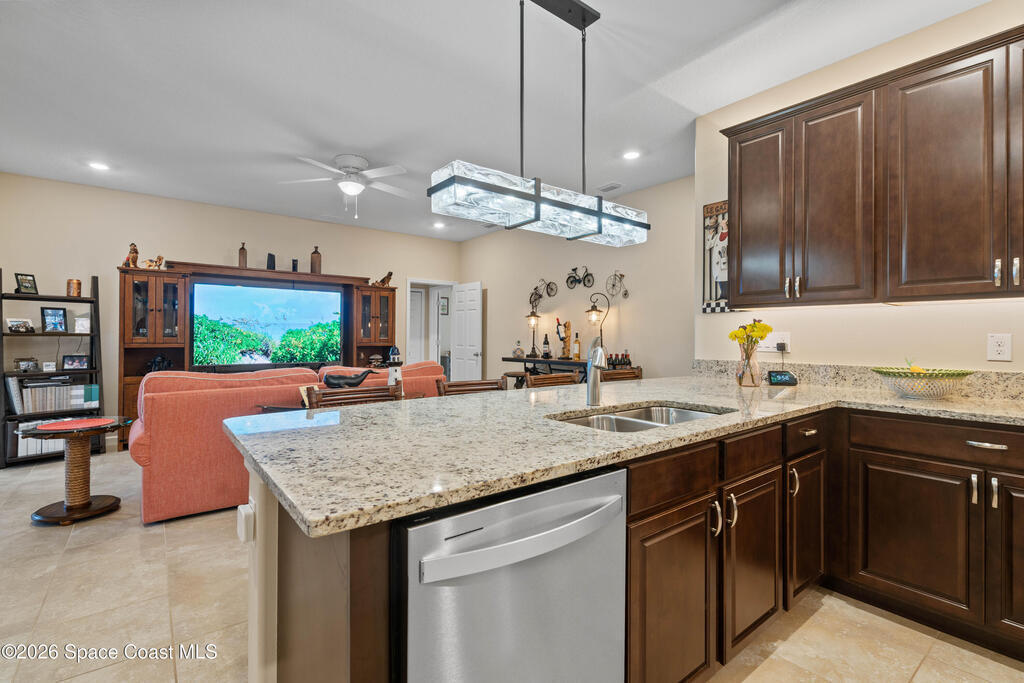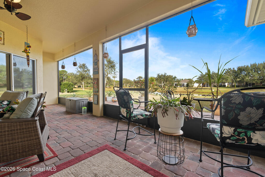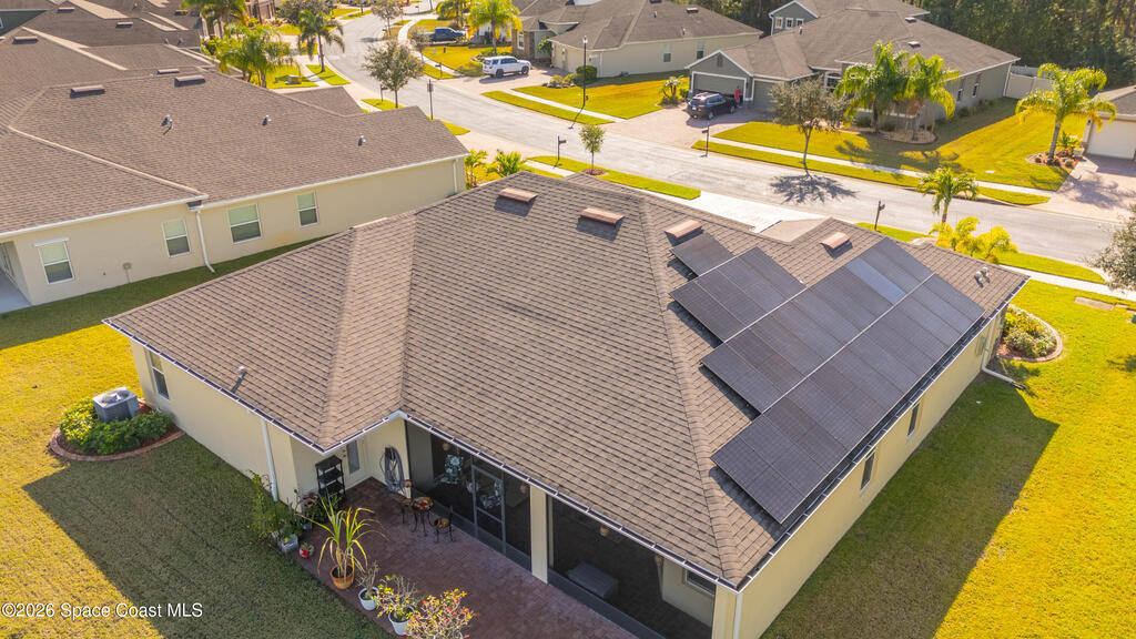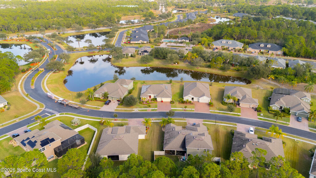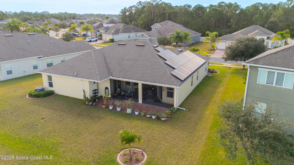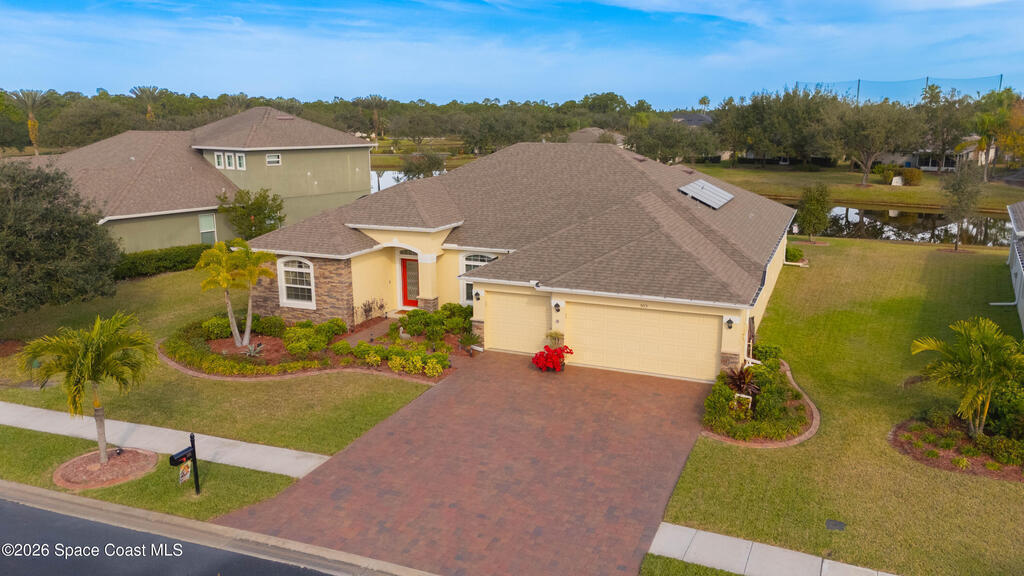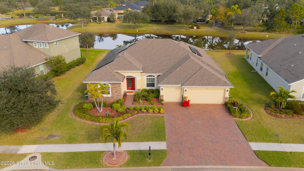 Bright, open, and move in ready in Bayside Lakes. This 4 bed, 3 bath home offers 2,558 sf with a 3 car garage, paver drive, high ceilings, and tile through the main living areas. The spacious kitchen features granite counters, a large breakfast bar island, plenty of cabinet storage, and stainless appliances, opening to the living and family rooms for easy entertaining. The split plan includes a generous primary suite with an attached sitting room, dual walk in closets, and a roomy bath. Step out to the oversized screened porch and brick paver patio to enjoy wide lake views and Florida sunsets. Big bonus: the 11.68 kW solar system, approximately $50,000, will be paid off at closing, helping keep electric bills low. Enjoy access to Bayside Lakes amenities including a clubhouse, pool, fitness room, tennis, pickleball, basketball, playground and more. Schedule your private showing today and experience the space, the view, and the value in person.