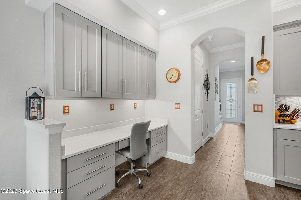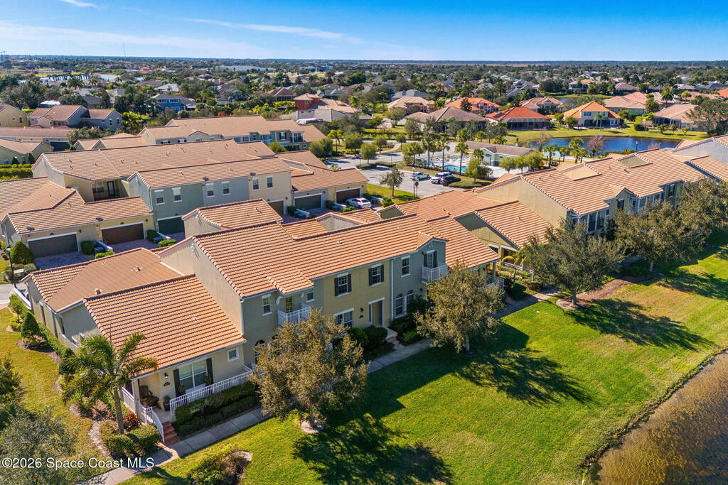 PRICE IMPROVED Premier Stadium Villas 3BR, 2.5BA townhome with pond views. Sellers' pride of ownership on display in every room. The masterpiece of the home is the light, bright, designer kitchen with upgraded KitchenAid appliances (gas stove, convection oven), quartz counters, marble backsplash, custom maple cabinets galore, breakfast bar, built in desk, butler pantry. The center of the home is the screened, private interior courtyard, bringing the outdoors into the open living area-perfect place to relax, gather, entertain; pets will love it too. Feel the breeze and gaze at the pond from the front porch. High ceilings make 1848 square feet of indoor living space feel even more generous. First-floor half bath renovated with quartz counter and vessel sink. Large two car garage with overhead attic for additional storage and epoxy floor covering. Beautiful details such as the wood-look plank flooring, high baseboards, crown moldings, glass front door, (Continued in More)