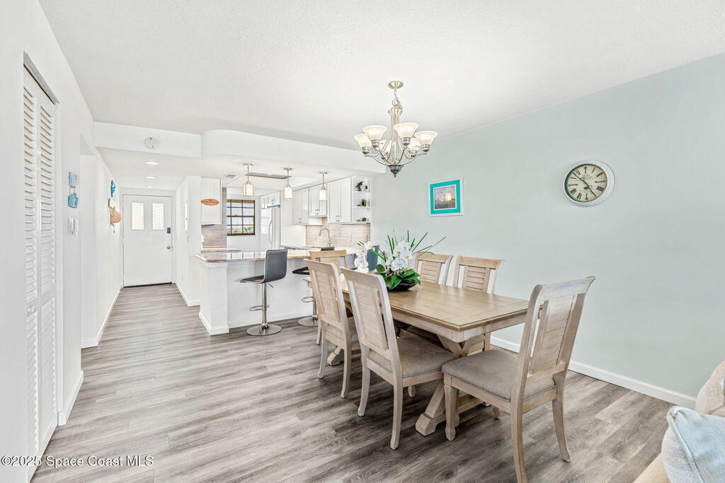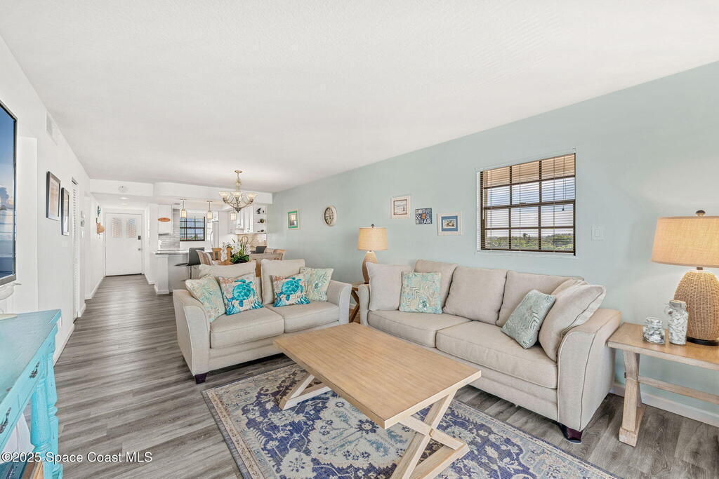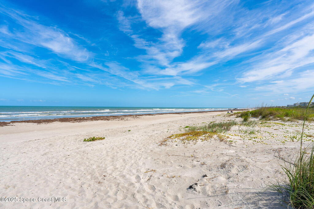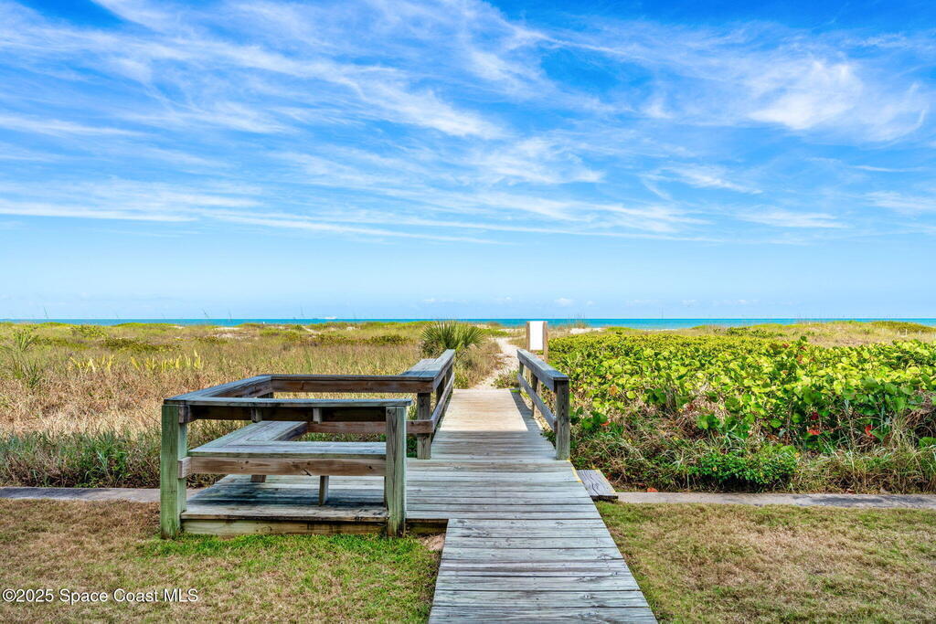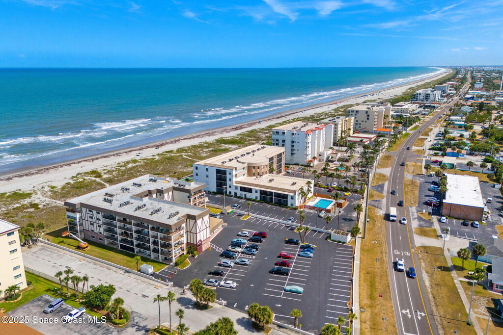 This renovated TOP FLOOR, NW CORNER UNIT offers OCEAN & RIVER VIEWS with a WRAP AROUND BALCONY! Top floor means no pesky view-obstructing structural components--just watching rocket-launches, sunshine, sea breezes & good vibes. An extra window at the corner provides plenty of natural light for that bright, beachy feel. Move right in--this furnished unit features vinyl flooring, a full copper rewire, and a 2018 kitchen remodel with white shaker, soft-close cabinetry, granite countertops and breakfast bar, and a pantry with rollout shelves. The in-unit laundry/utility room includes a newer large-capacity washer and dryer. Be storm ready with electric roll-down shutters on the sliders & corner window, and crank shutters for the front windows. Spend the day at the beach with convenient private access and finish the day with a refreshing dip in the ocean-view community pool, then walk downtown for dinner and cocktails. Recharge the next morning with a quick walk to breakfast at Whisk & Grind
