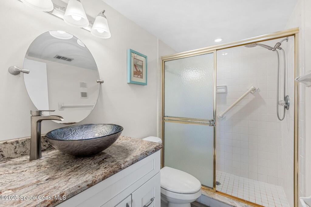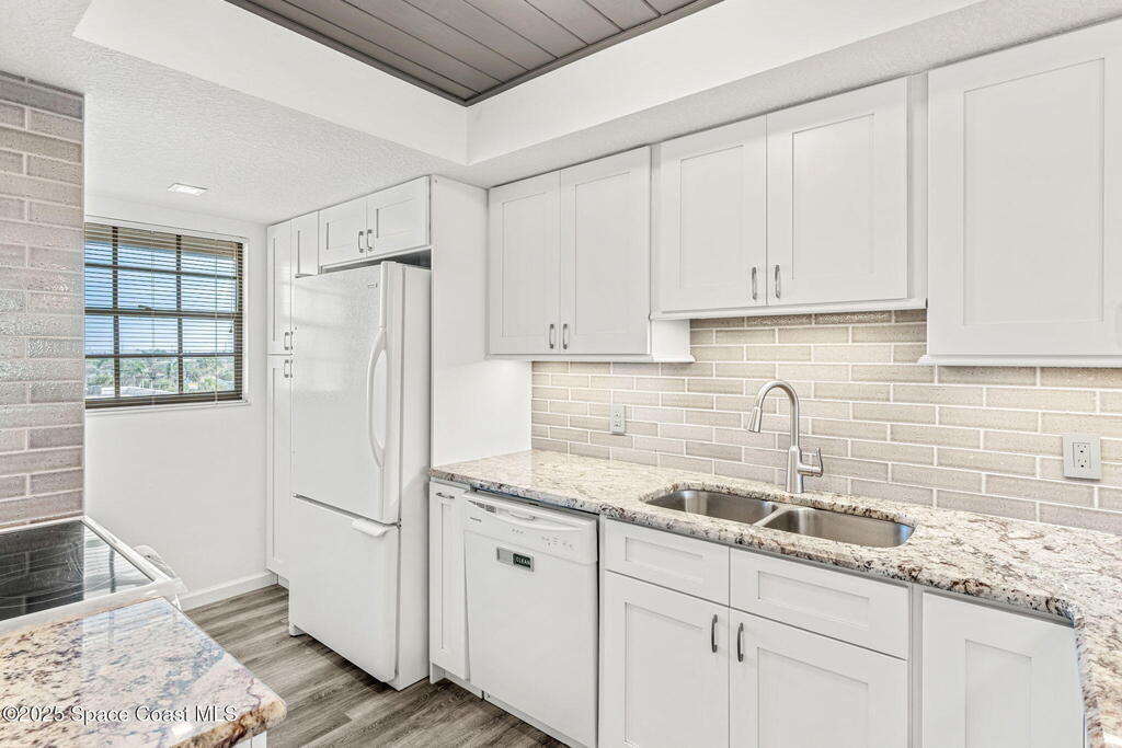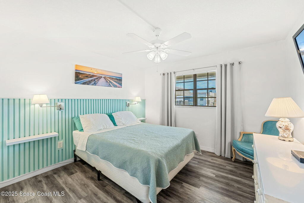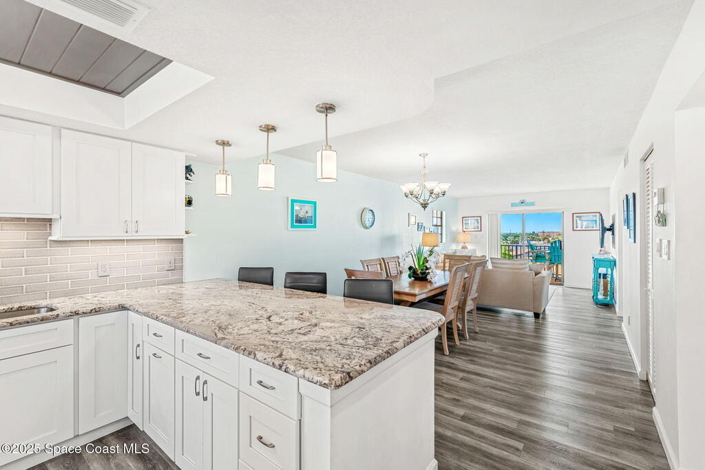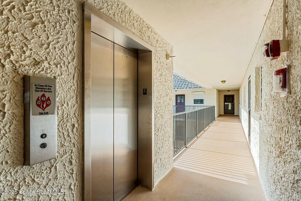 This renovated TOP FLOOR, NW CORNER UNIT offers OCEAN & RIVER VIEWS with a WRAP AROUND BALCONY! Top floor means no pesky view-obstructing structural components--just watching rocket-launches, sunshine, sea breezes & good vibes. An extra window at the corner provides plenty of natural light for that bright, beachy feel. Move right in--this furnished unit features vinyl flooring, a full copper rewire, and a 2018 kitchen remodel with white shaker, soft-close cabinetry, granite countertops and breakfast bar, and a pantry with rollout shelves. The in-unit laundry/utility room includes a newer large-capacity washer and dryer. Be storm ready with electric roll-down shutters on the sliders & corner window, and crank shutters for the front windows. Spend the day at the beach with convenient private access and finish the day with a refreshing dip in the ocean-view community pool, then walk downtown for dinner and cocktails. Recharge the next morning with a quick walk to breakfast at Whisk & Grind