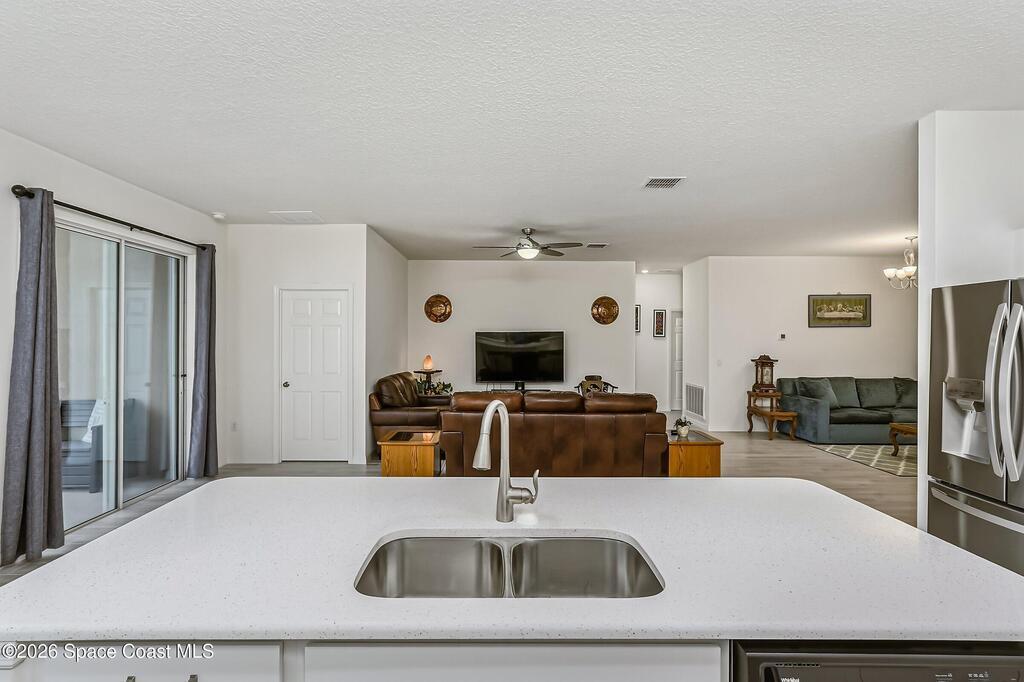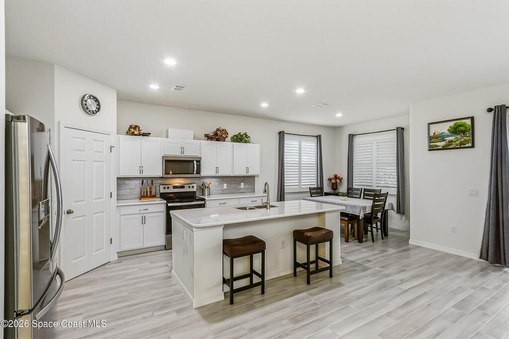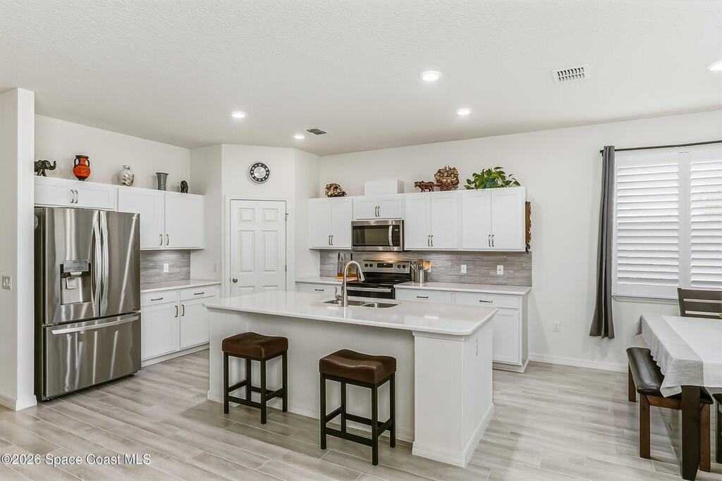 This 4+BR/3BA move-in ready home in NW Palm Bay highlights thoughtful upgrades and a layout designed for modern living. The bright main area centers around an updated kitchen with island seating, newer fixtures, and an eating nook that flows into the dining and living spaces. The private owner's suite offers a walk-in closet and renovated spa-style bath with dual sinks and a step-in shower. A flexible bonus room works as an office, guest space, or playroom, while three additional bedrooms, refreshed baths, and a large laundry room support everyday convenience. Outdoors, enjoy a screened porch, expanded decking, and a fully fenced yard with no rear residential neighbors. Minutes from shopping, dining, and I-95, this upgraded 2023 home feels like new and is ready for its next chapter. Schedule your showing today.