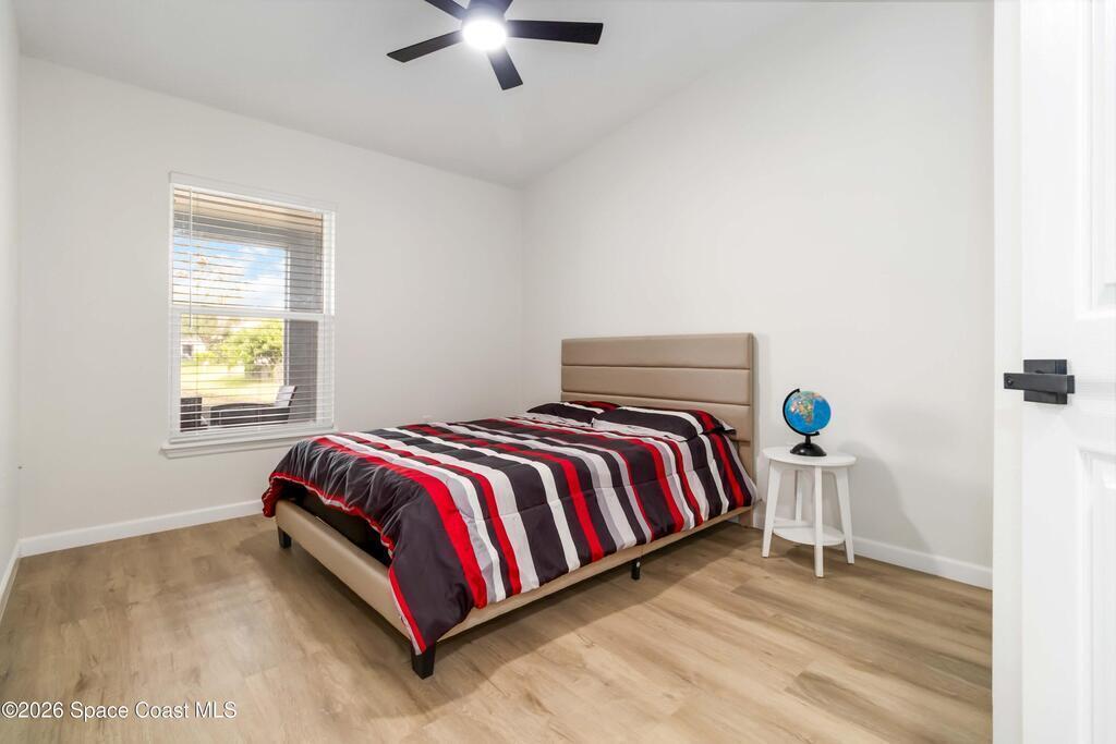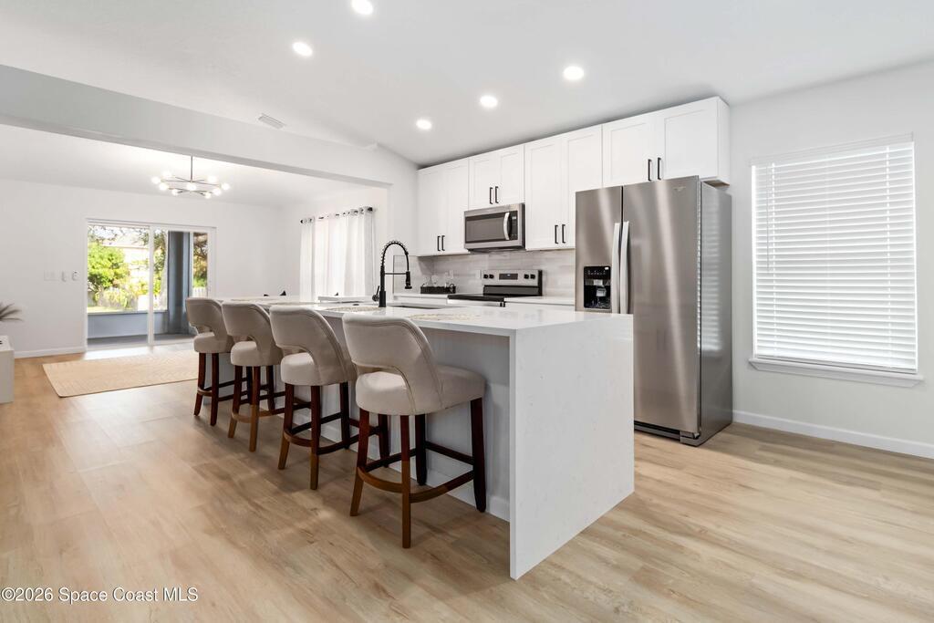 This beautifully updated 4-bedroom, 2-bathroom home offers modern comfort and peace of mind. Roof (2023) AC (2023) WH (2025), new impact windows, new interior & exterior paint. New luxury vinyl flooring throughout the home with new baseboards adds both elegance and practicality. The kitchen was designed with functionality in mind providing ample space for cooking and entertaining. The upgraded includes new stainless-steel appliances, new 42-inch shaker cabinets with quartz countertops and a beautiful backsplash. The primary bedroom large walk-in closet with double sink vanities. Ceiling fans throughout! Garage with new epoxy floor and paint. Out back, you'll appreciate having a screen and overlooking the lake. Don't miss this move-in ready!
