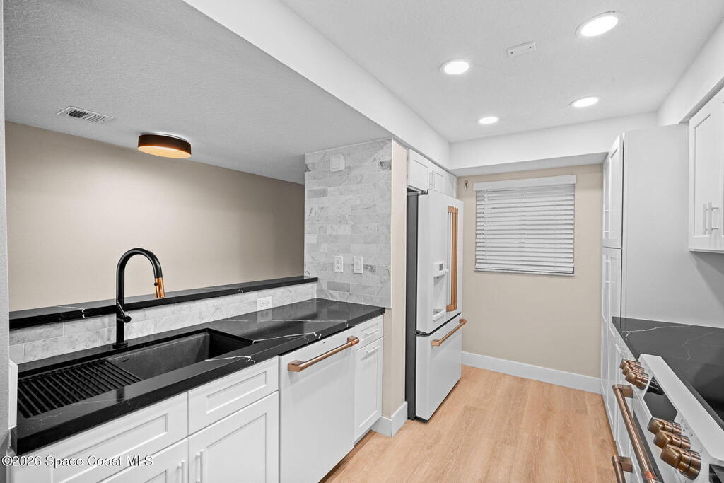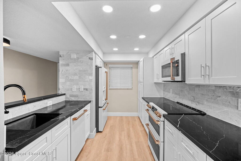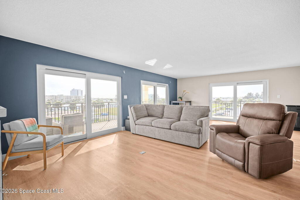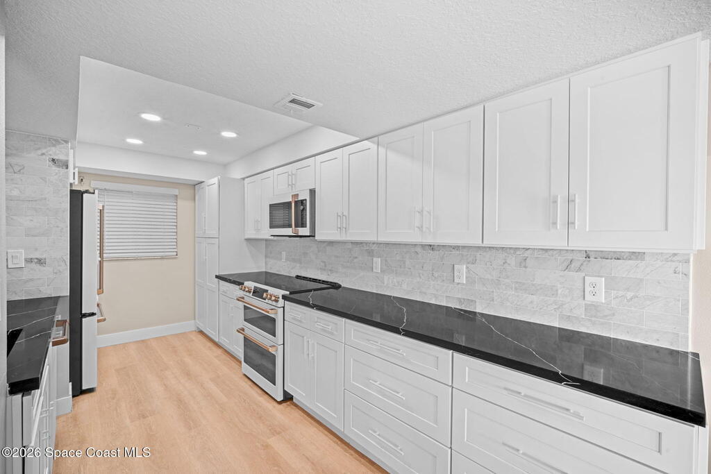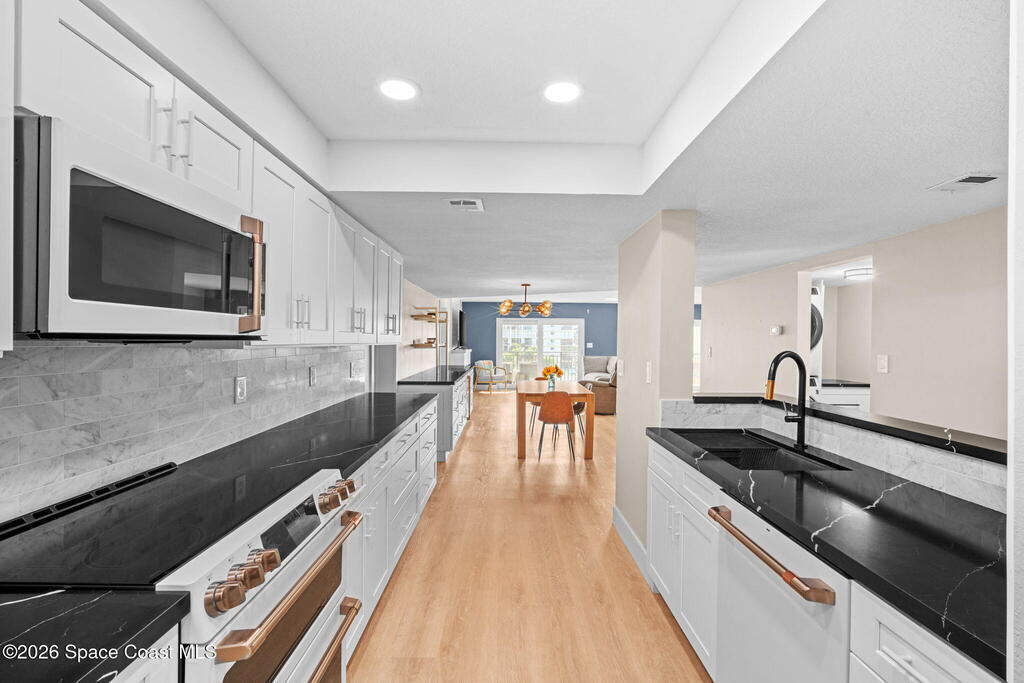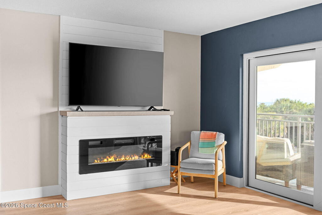 Sunrises in the Am and sunsets in the evening from your wrap-around corner balcony with ocean, park, and city views. This spacious 3-bedroom, 2-bath oceanfront residence has been meticulously remodeled down to the studs, and presents high-end finishes throughout. The open concept living space features quartz countertops and custom GE Cafe appliance suite that extends into the living area, with a built-in wine cooler, perfect for entertaining or relaxed everyday living. Modern electric fireplace creates a warm focal point in the living area, while luxury plank flooring flows seamlessly throughout, delivering a refined yet relaxed coastal-luxury feel. Impact-rated windows & sliders, storm shutters, and 2023 A/C system provide year-round comfort and peace of mind. One-car garage w/ storage. Walk to Publix, Florida's Fresh Grill, ice cream & more - plus the beach & park are steps away! Heated pool, sauna, bbq, private beach access, pickleball, fitness & more! Tour it today!