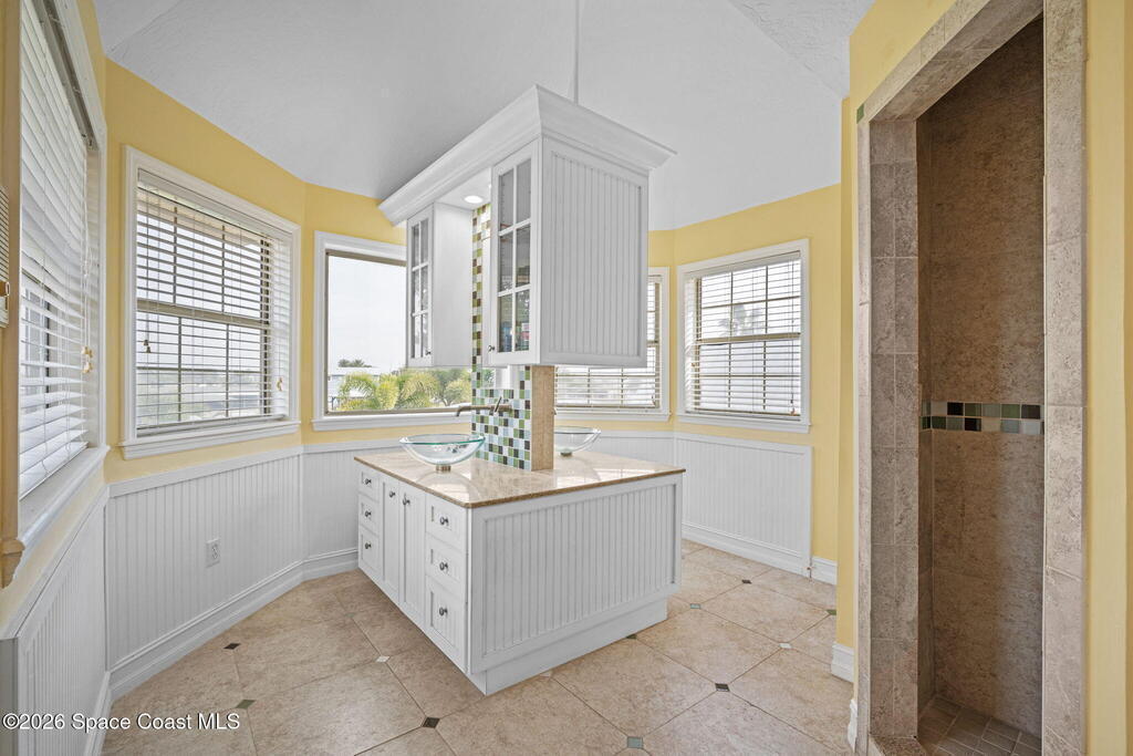 Tucked behind the guarded gates of Tortoise Island, this extraordinary waterfront estate commands approximately 120-feet of prime frontage along a 17-foot dredged canal, quietly asserting itself as one of the most significant offerings the community has seen in decades. With a newly reimagined dock and a private beach style shoreline, the property offers a level of boating access, scale, and permanence that discerning buyers often wait a lifetime to secure.The residence unfolds across more than 4,600 square feet of thoughtfully curated interior space, where timeless materials meet architectural volume. Tile flooring flows seamlessly throughout, complemented by soaring vaulted ceilings that create a sense of openness without sacrificing warmth. A private office anchors the front of the home, offering a refined workspace, while the primary living and dining areas extend naturally toward the water through French doors, dissolving the boundary between indoors and out.
