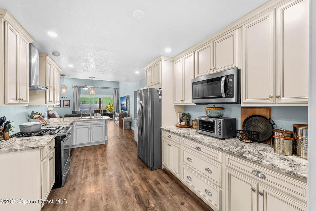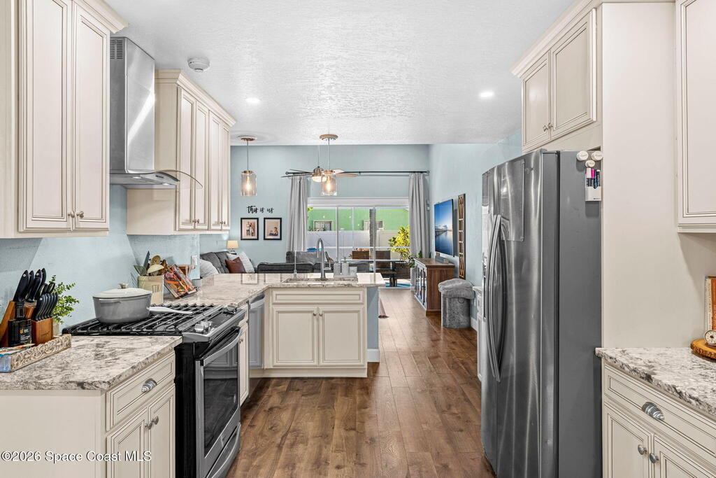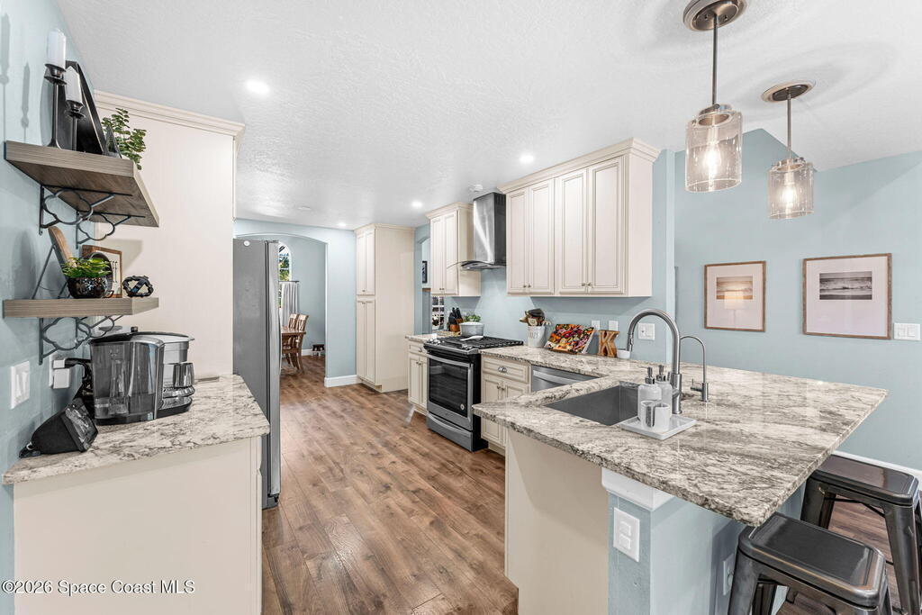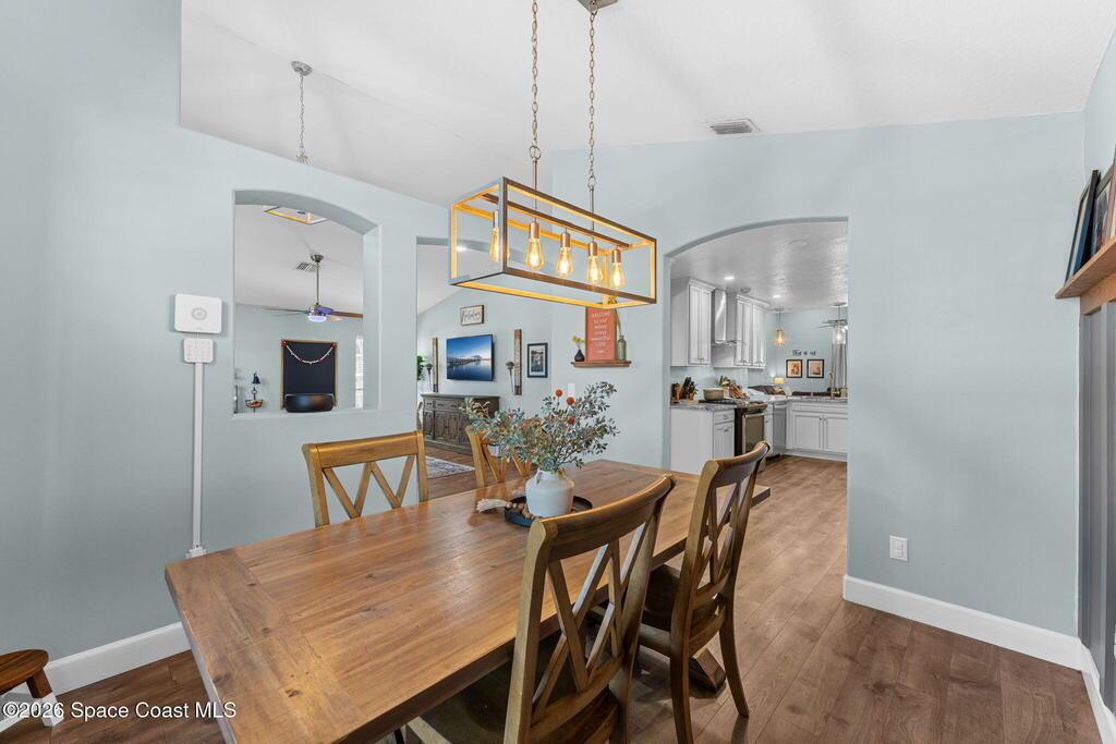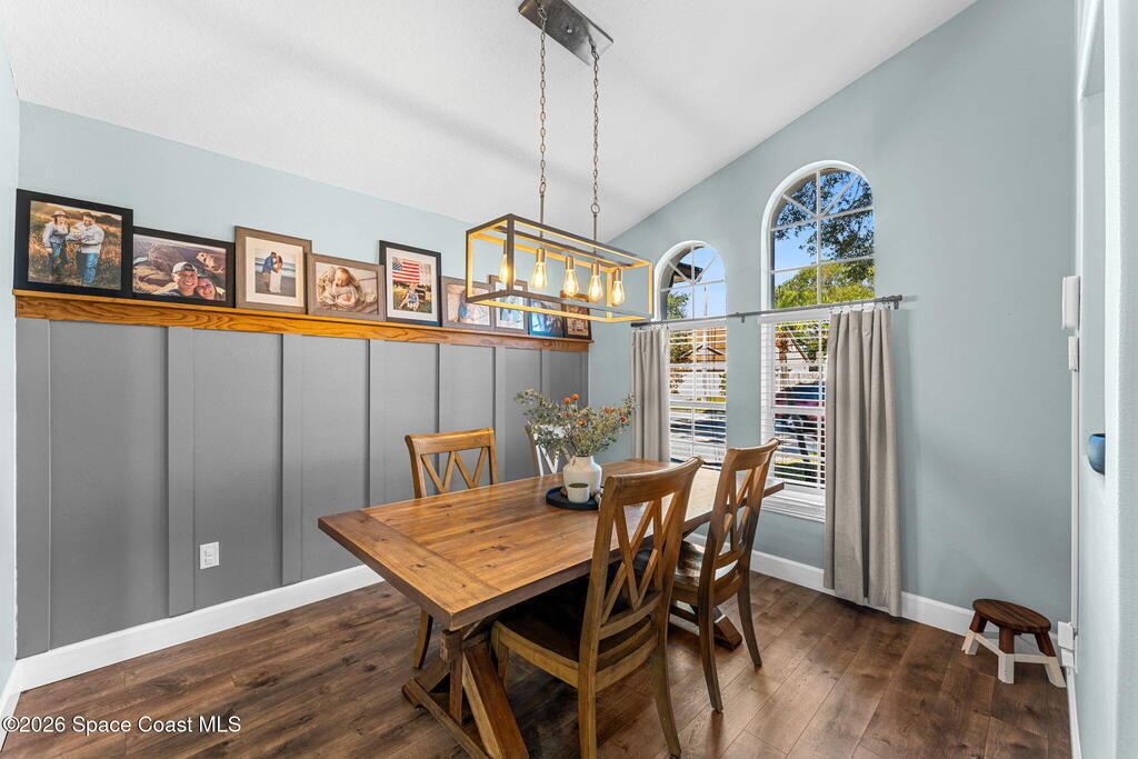 Freshly updated and full of personality, this 3-bedroom, 2-bath home in the heart of Pelican Harbour offers bright, easy living in a well-loved Rockledge neighborhood. Inside, the versatile layout features vaulted ceilings, open living and dining spaces, and stylish laminate flooring throughout. The remodeled kitchen is truly the heart of the home, w/ updated antique off-white cabinetry, modern finishes, and seamless flow for gathering. A renovated primary bathroom adds comfort and style. Set on a .22-acre corner lot, the home also includes a spacious primary suite, recessed lighting, and an interior laundry room. Out back, enjoy a screened pool w/ safety fence overlooking the water, and a large backyard perfect for lounging, grilling, or play. Additional updates include fresh exterior paint, a 2023 HVAC system, tasteful touches throughout. Just minutes from schools and shopping, this centrally located home offers laid-back living in one of Rockledge's most convenient neighborhoods.