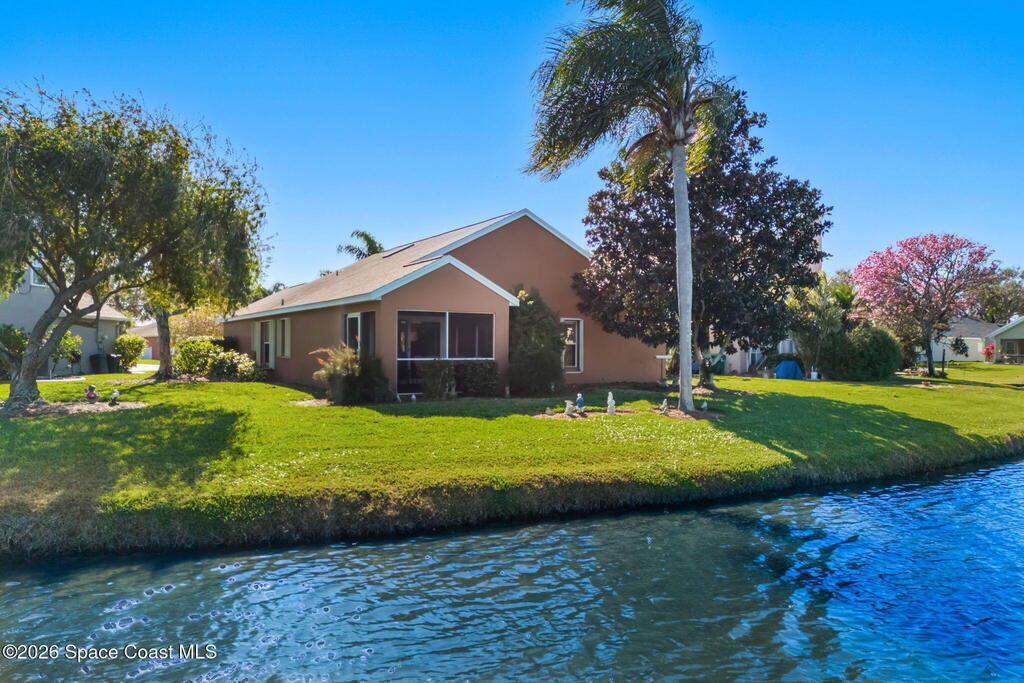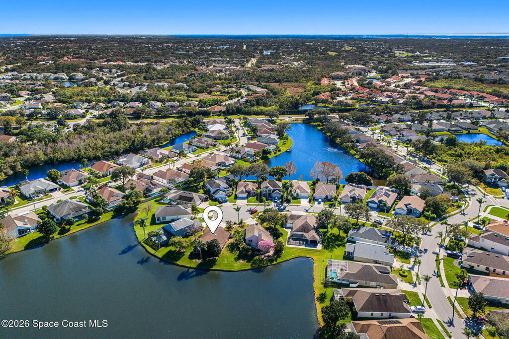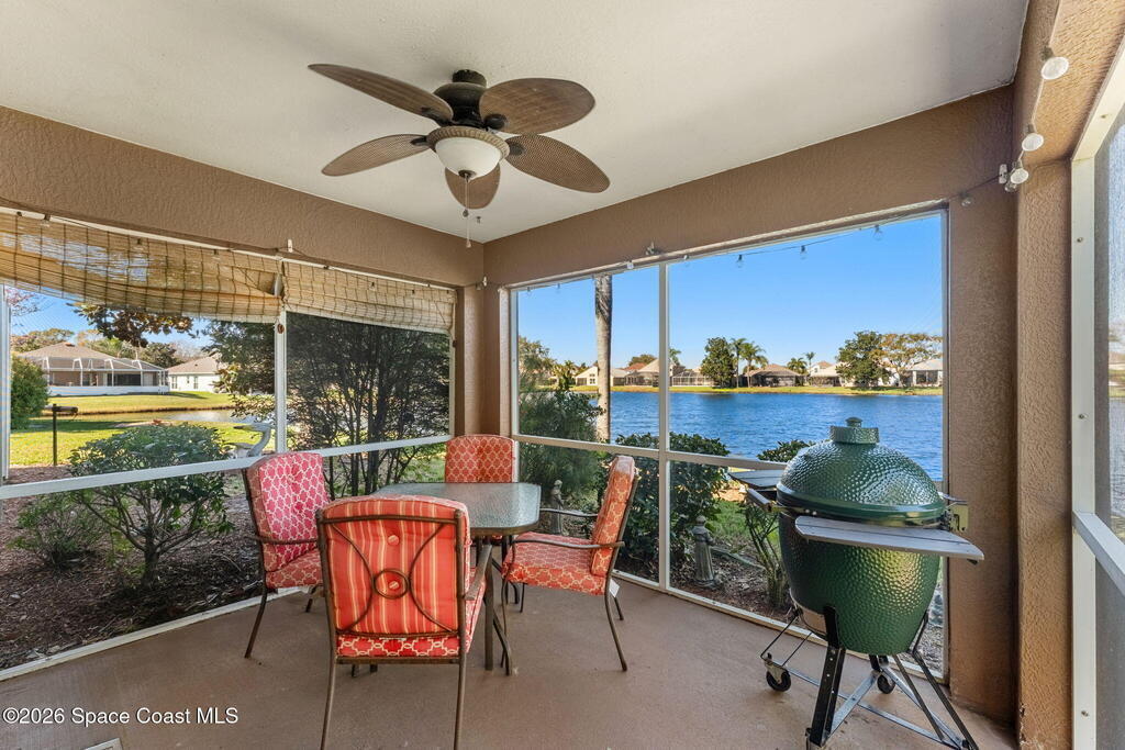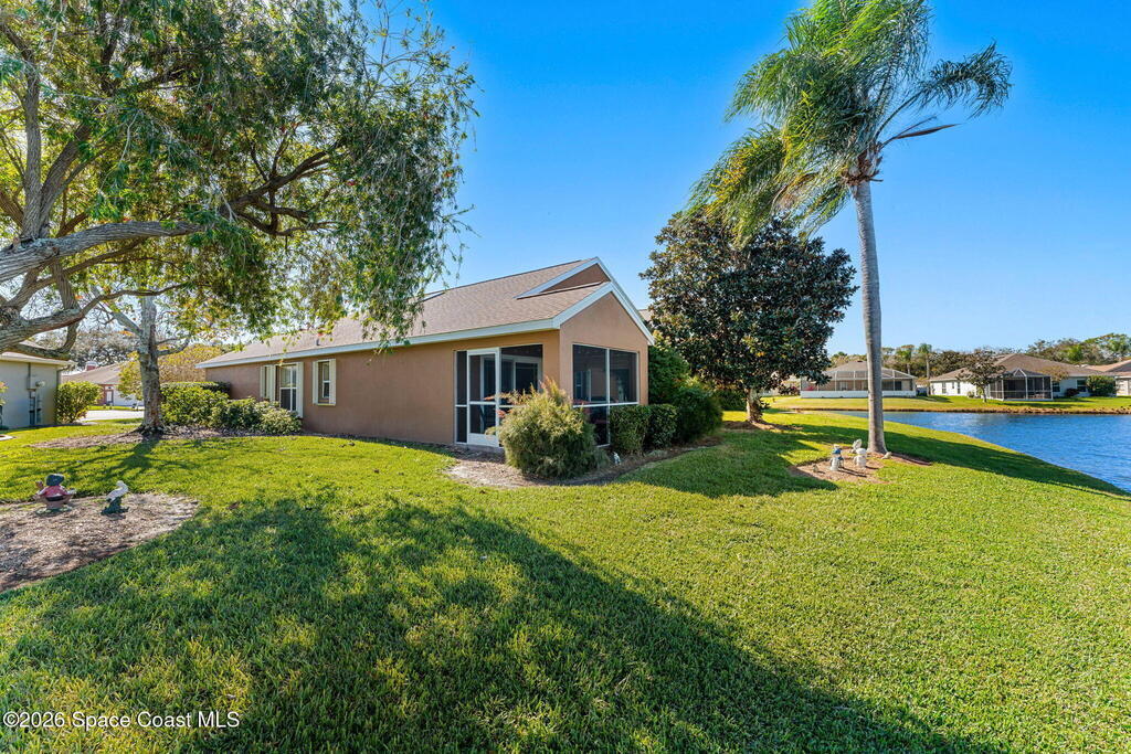 This one owner home sits on a rare pie-shaped lakefront lot on a cul-de-sac, one of the best water-view lots in the subdivision. A central kitchen & popular open floor plan are filled w/ natural light from skylights, creating a bright & welcoming living space. Enjoy serene lake views from almost every window of the home including kitchen table. The primary suite also offers peaceful water views, walk-in closet, dual sinks, updated shower and garden tub. The screened patio is ideal for relaxing or entertaining while overlooking the lake. Key updates include a 2014 roof, accordion hurricane shutters, 2015 HVAC, and storm-impact double front doors & a storm-impact sliding glass door to the patio. All appliances convey, including washer and dryer. The home is well lived in and offers a well-designed and popular layout. Located near restaurants & shopping, with easy access to major employers, beaches, PSFB & highways.