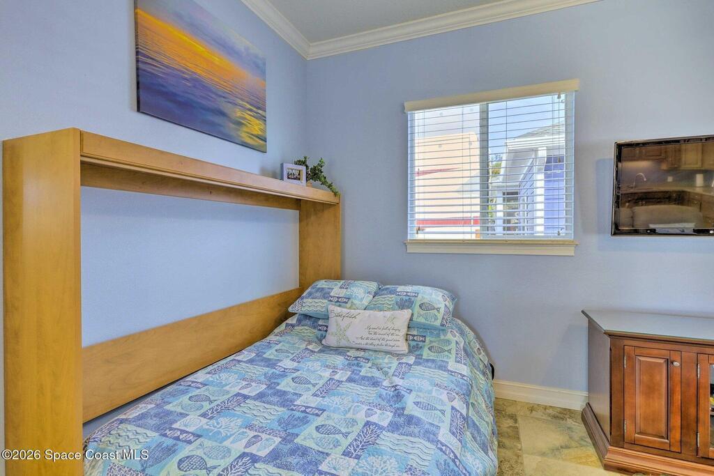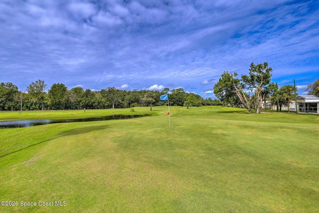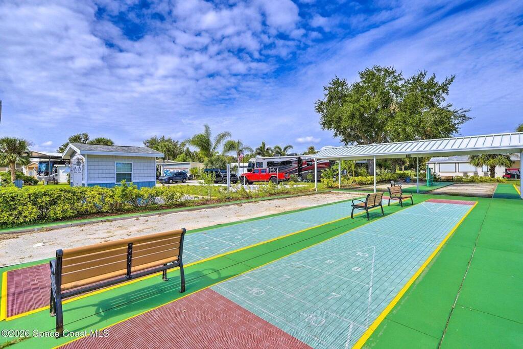 The shell house! The stucco has sea shells incorporated into it. RV Resort living at this active 55+ community for year round or seasonal use. This lot will accommodate any size or style RV with additional hookups for water, sewer, electricity and cable. . This cute, roomy cottage has a master bedroom and an additional bonus room that could be used for sleeping. It is being offered furnished turn-key. You could rent the property short or long term while you aren't using it. In fact, there is a rental manager in place, which could continue. There is a gated entry and and an executive golf course on the property. Amenities include a clubhouse, heated pool, tennis, pickleball, shuffleboard, bocce and tennis. The community is close to airports, theme parks, beaches, shopping and restaurants. Watch the rocket launches from your own yard. The inexpensive association dues cover deluxe cable, your own internet modem/router, sewer, water, trash removal, lawn care and access to common area.