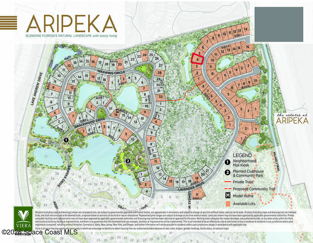To be built in the prestigious, gated community of Aripeka at Viera, this contemporary luxury residence offers 3,254 sq. ft. of thoughtfully designed living space on a private homesite backing to tranquil lake and preserve views. One of the last remaining lots with this spectacular, private outlook, the property captures breathtaking sunset views over the water. The elegant floor plan features 4 bedrooms and 3 bathrooms, with the primary suite and a dedicated office conveniently located on the main level, while upstairs bedrooms provide privacy and flexibility for guests or family. The expansive backyard offers ample room for a resort-style pool and outdoor living. Buyers may build this refined plan or custom build their dream home with a luxury builder. Property is also listed as vacant land (MLS #1067162). Aripeka is known for its preserved trees, nature trails, and distinctive architecture, just minutes from shopping, dining, I-95, beaches, and A-rated schools.
