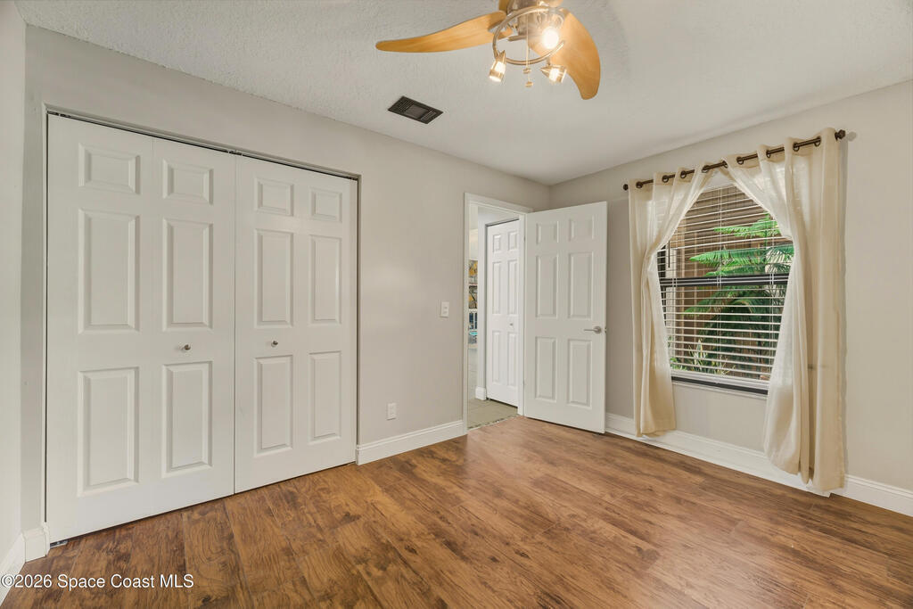 Charming 2 bedroom, 2 bathroom, 2 car garage patio home in Quail Ridge. Located directly in front of the community pool and only 1 mile to Wickham Park. The open floor plan has had all of the big ticket items replaced to include new interior doors, fixtures and wood laminate flooring in bedrooms + impact windows and exterior doors in 2020. HVAC and water heater 2023. Roof 2025.