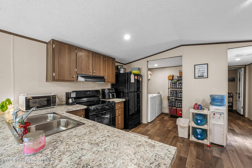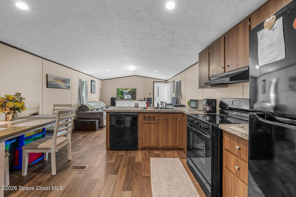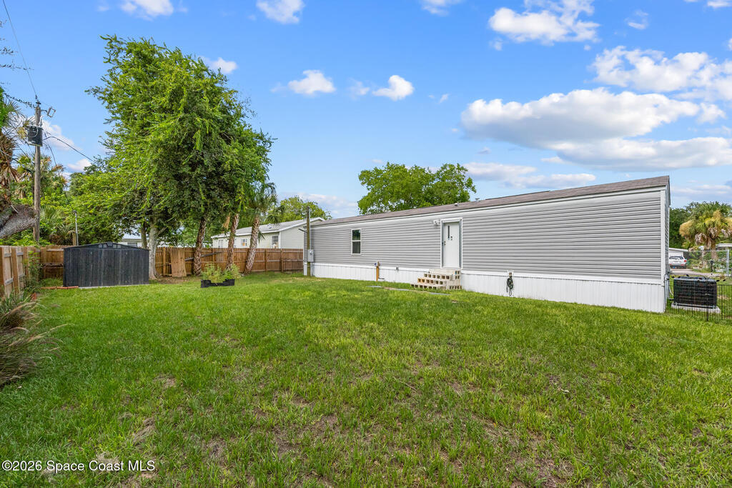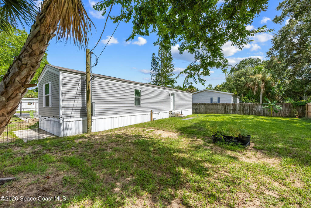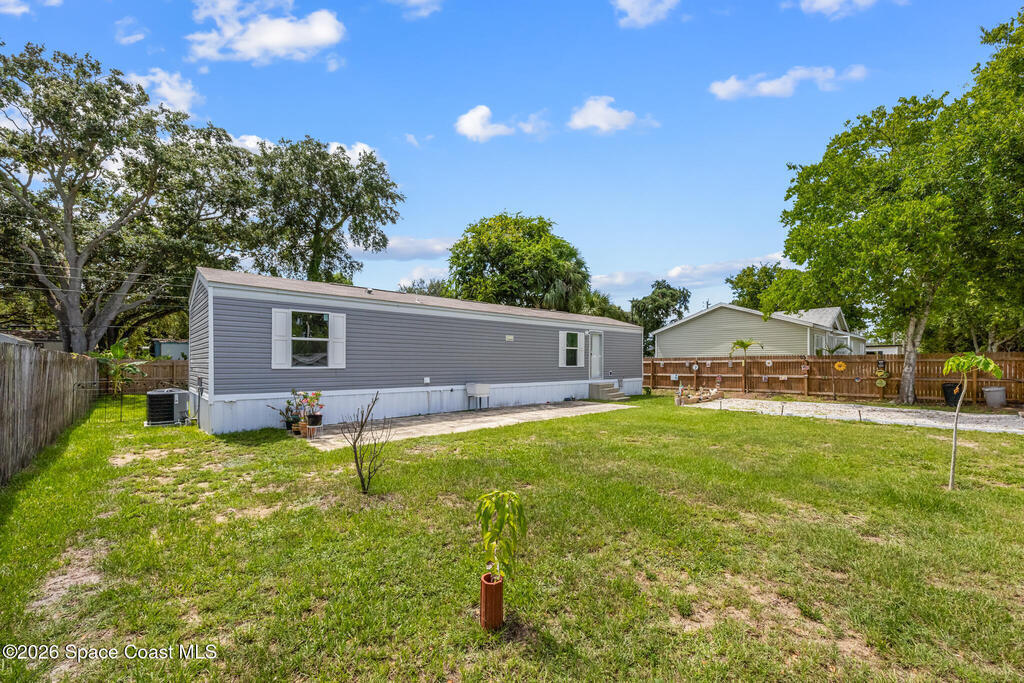This brand new 2 bedroom, 1 bath manufactured home in Cocoa has been updated with a new privacy fence, gravel driveway, metal shed, fruit trees, new septic system, new AC, new kitchen appliances, skirting, and a concrete easement. The lot is owned and has been fully cleared. Perfect for anyone seeking low-maintenance living in a convenient Space Coast location. Bring all your toys: Boats, RVs, etc. Close to the beaches, US1, and the Space Center. Don't miss the incredible opportunity to own a fully updated home at an affordable price and sit back and watch the launches from your front yard!