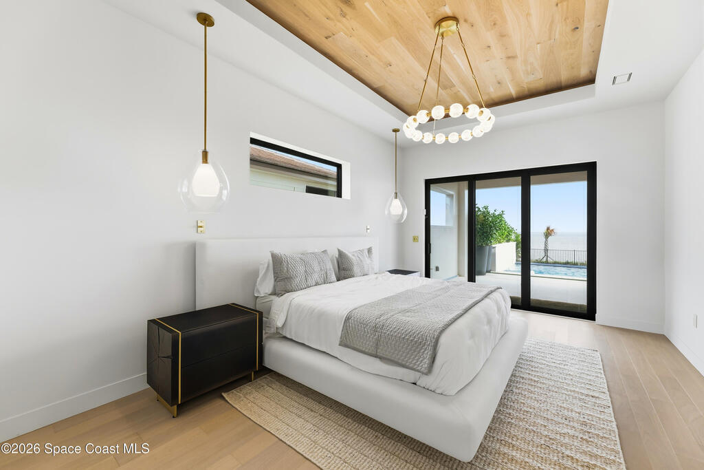 Experience waterfront living in this newly custom-built luxury home, perfectly positioned along the Intracoastal within the premier gated community of The Shores at Tranquility. Set on .45 acres with 69+ feet of direct waterfront, this 4-bedroom, 4-bath residence offers an oversized bonus room, a 4-car garage and is thoughtfully designed for both everyday comfort and elegant entertaining. A beautiful double-door entry welcomes you into 23-foot ceilings and 3-5 mile waterfront views showcased through oversized sliding glass doors, creating an unforgettable first impression with front-row views of Kennedy Space Center rocket launches, abundant wildlife, and breathtaking sunrises from the comfort of home.The heart of this home is a chef's kitchen featuring premium Monogram appliances, a 48-inch gas range with double ovens, six burners, and a griddle, quartz countertops with waterfall edges,