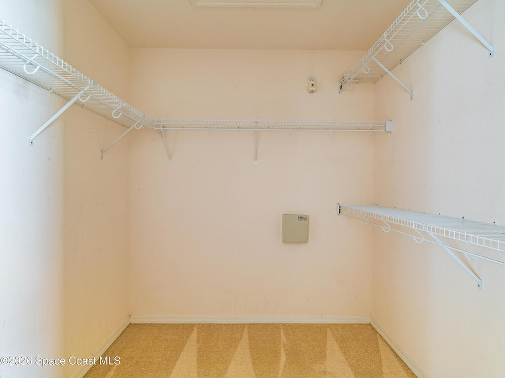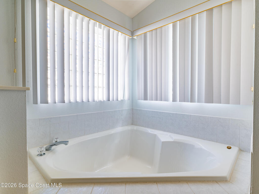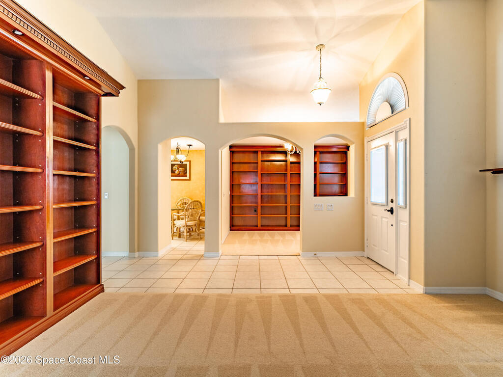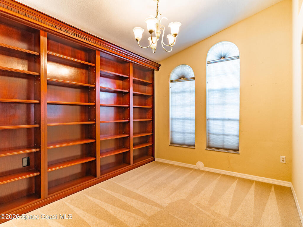 Now ACCEPTING BACK UPS. Enjoy Space Coast living in this 4-bed, 2-bath, 2,152 sq ft split-floorplan pool home with 3-car garage conveniently located near shopping, dining, entertainment, and Florida's beautiful beaches. Upon entry, you are greeted by a dining area to the right and a versatile living/entertaining space to the left, both featuring built-in bookcases, perfect for book collectors, or displaying cherished items. Moving through the home, the fourth bedroom provides flexible use as an office, nursery, or bonus space and connects through double doors to the primary suite. The primary retreat features a soaking tub, walk-in closet, and a separate shower and toilet area. The centrally located kitchen opens to a spacious family room, creating an inviting open-concept living area that flows seamlessly through triple sliding doors to the screened-in pool and spa and private backyard, ideal for entertaining. Rest easy with a whole house generator and hurricane shutters.