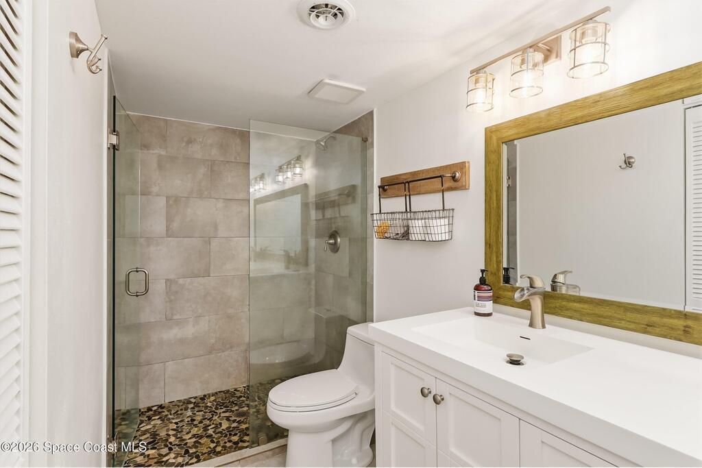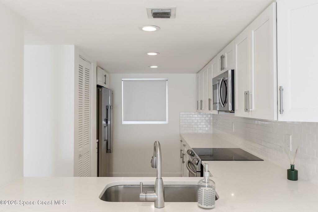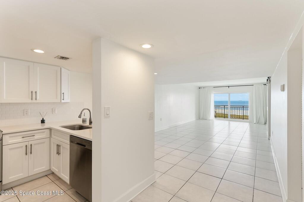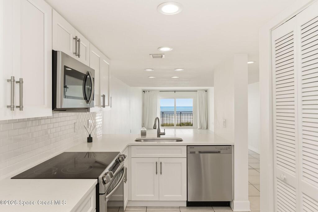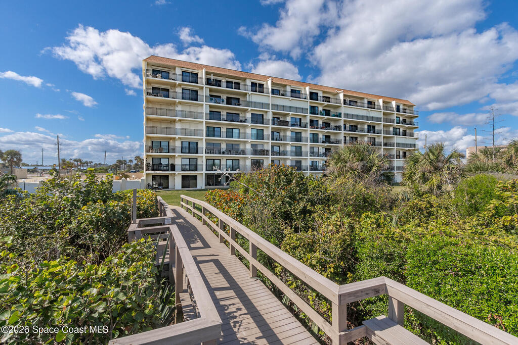 Beautiful Direct Oceanfront Condo with remodeled kitchen and bathrooms. Spectacular DIRECT OCEAN VIEWS from this 4th floor updated condo. The bright and open kitchen features soft close cabinetry, beautiful counter tops, large basin sink w/ disposal, and updated stainless steel appliances with a slide in range and refrigerator with in-door water/ice dispenser. Solid surface flooring with large tile and wood look vinyl. Oceanfront primary suite with ensuite bathroom and walk in closet. Guest bedroom has beautiful sunset views. The residence also features updated impact slider doors and windows. You can see the launch pads providing spectacular rocket launch viewing! Private, 1-car garage plus ample guest parking onsite. You are steps from restaurants and shops from this desirable community that features resort-style amenities including a heated pool, gas BBQ grill, tennis, pickleball, beach access, clubhouse, exercise room, sauna, and an onsite manager. Priced to sell! Click for more...