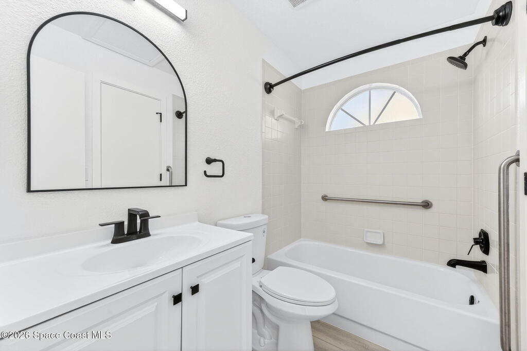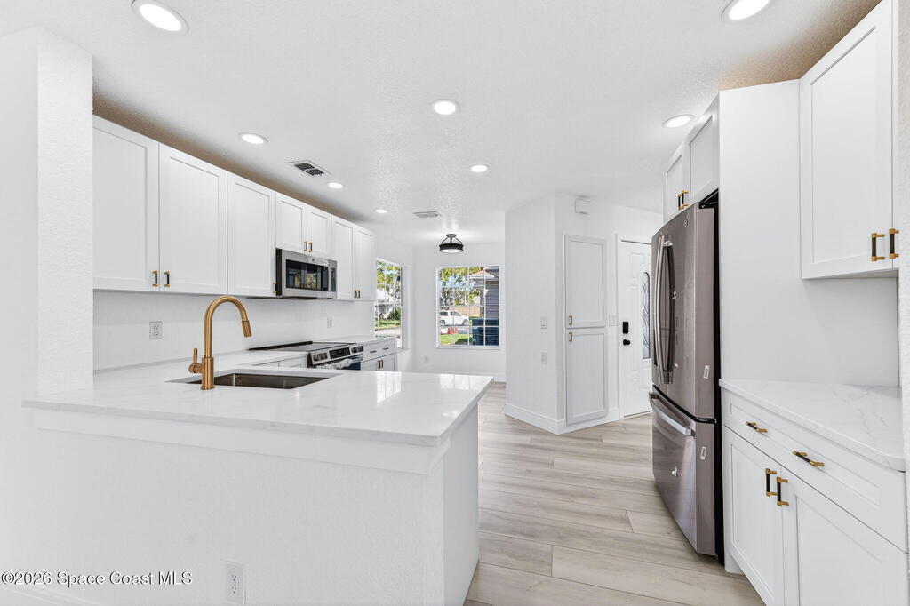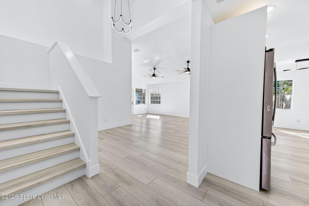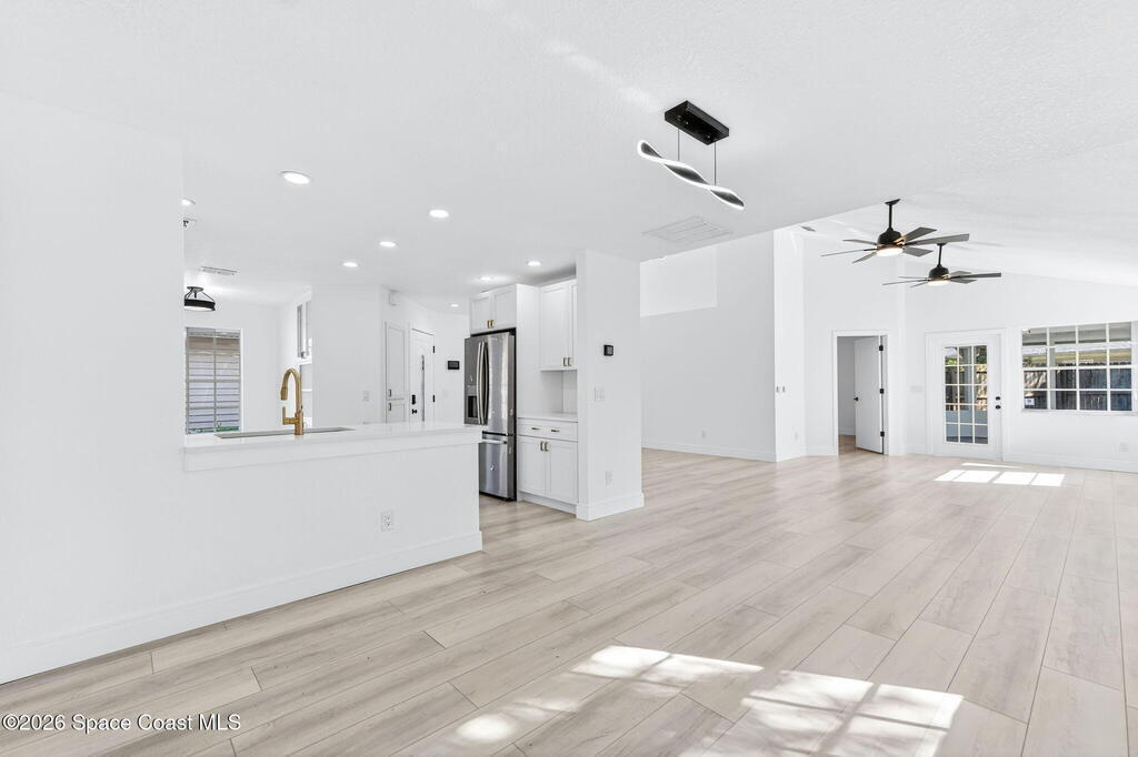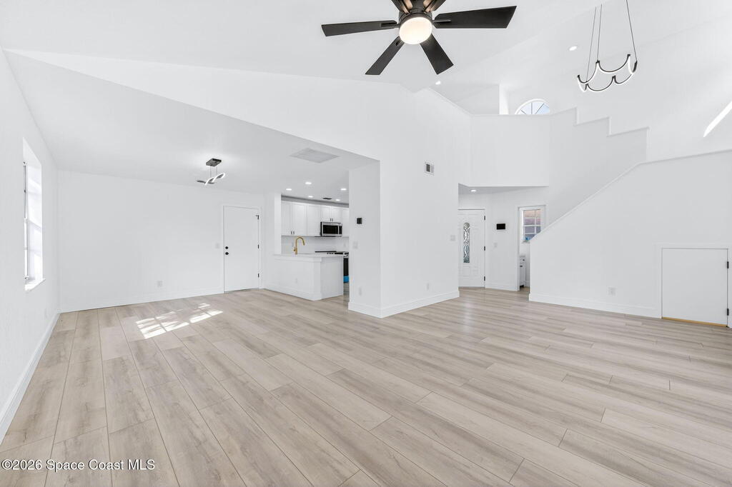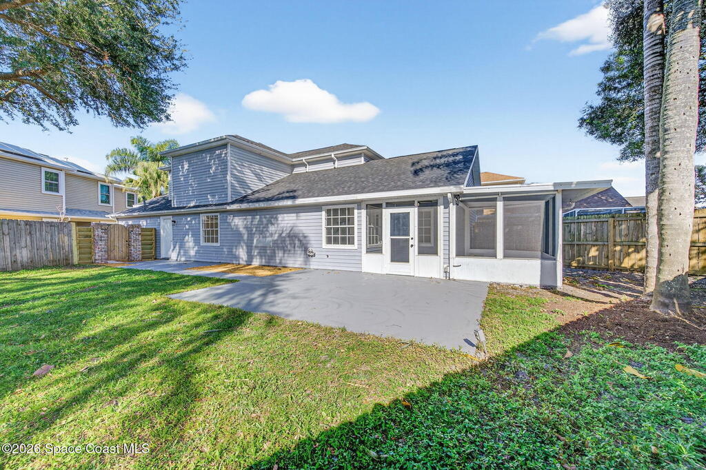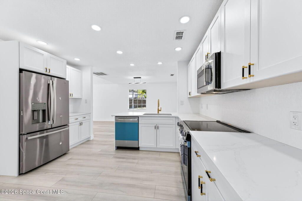 Beautifully renovated home in a central Melbourne location, offering modern finishes, soaring ceilings, and a functional floor plan. This move-in-ready property features a brand-new roof, luxury vinyl flooring throughout, and a completely updated kitchen with quartz countertops, new cabinetry, a pantry with pull-out shelving, stainless steel appliances, and stylish gold accents. The main level includes a spacious primary bedroom with a stunning en suite and large walk-in closet, an additional half bath, and a light-filled living area with high ceilings. Enjoy year-round indoor/outdoor living in the screened Florida room with removable vinyl windows. Upstairs, you'll find a large loft-style living space and two additional bedrooms, one with direct access to the bathroom. The epoxy-sealed two-car garage includes a full-size refrigerator and new washer and dryer. Conveniently located near shopping, dining, golf, and beautiful beaches.