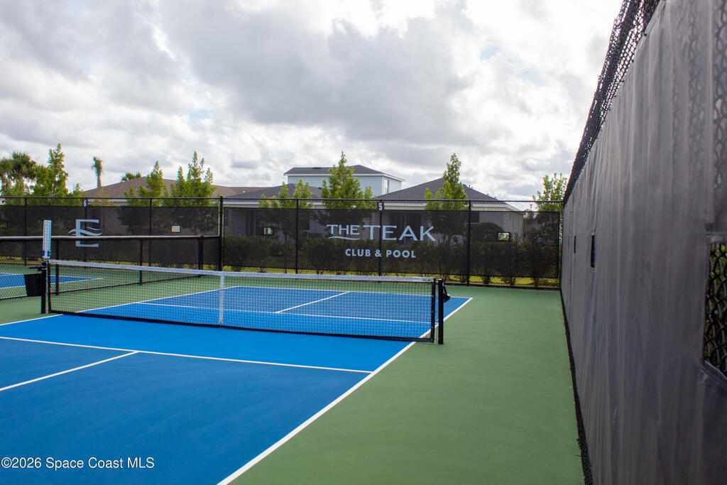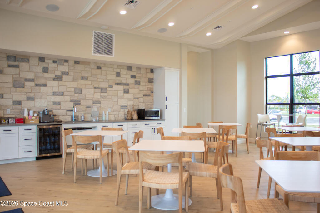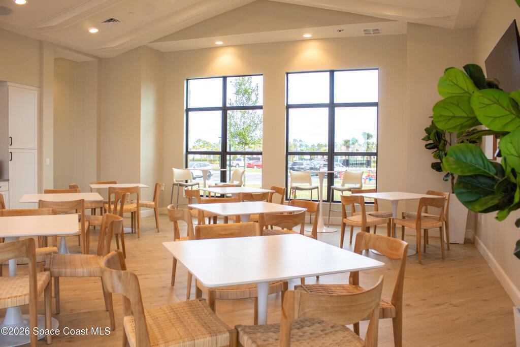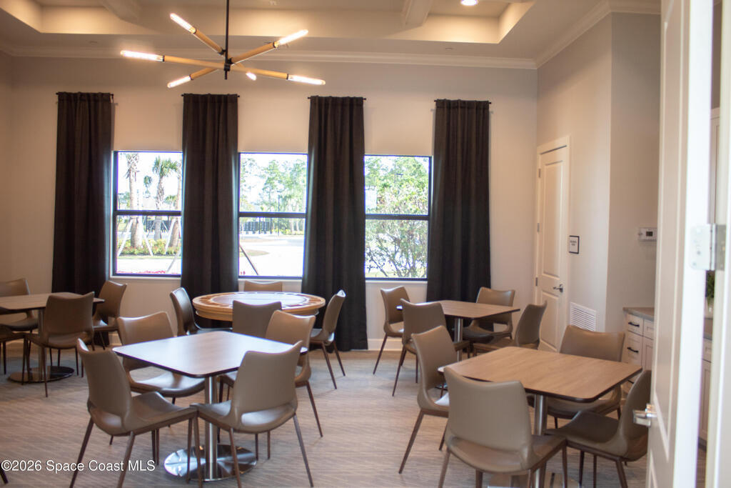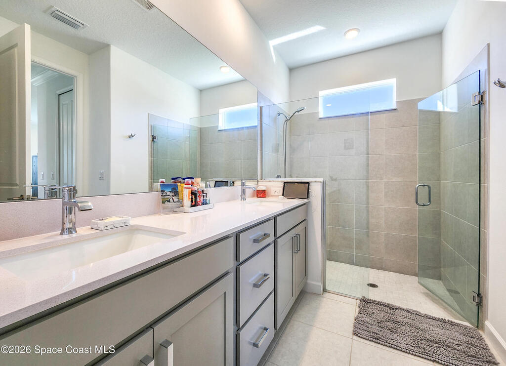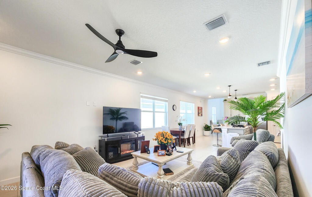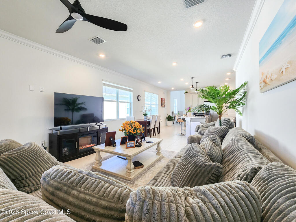 Welcome to Timbers at Everlands, Palm Bay's premier 55+ community, where modern design meets resort-style living. This beautifully designed two-story home sits on a spacious corner lot and offers a thoughtfully planned layout ideal for both everyday comfort and hosting guests. The second level features a private en-suite bedroom, full bath, and loft area; perfect for visitors, hobbies, or a quiet retreat.The main-level owner's suite is a relaxing sanctuary, complete with a walk-in shower, dual sinks, and a generous walk-in closet. At the heart of the home, the open-concept great room seamlessly connects the kitchen, dining area, and covered lanai, creating an inviting space for entertaining or unwinding. The kitchen showcases gray shaker-style cabinetry, a large center island, and modern finishes. Crown molding and window blinds add refined finishing touches throughout.