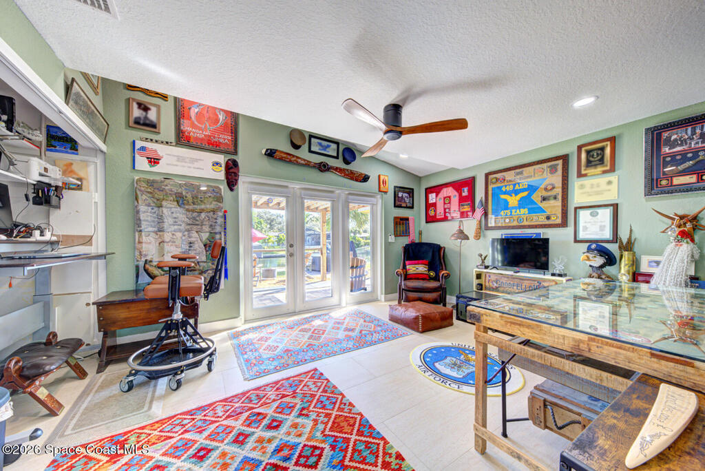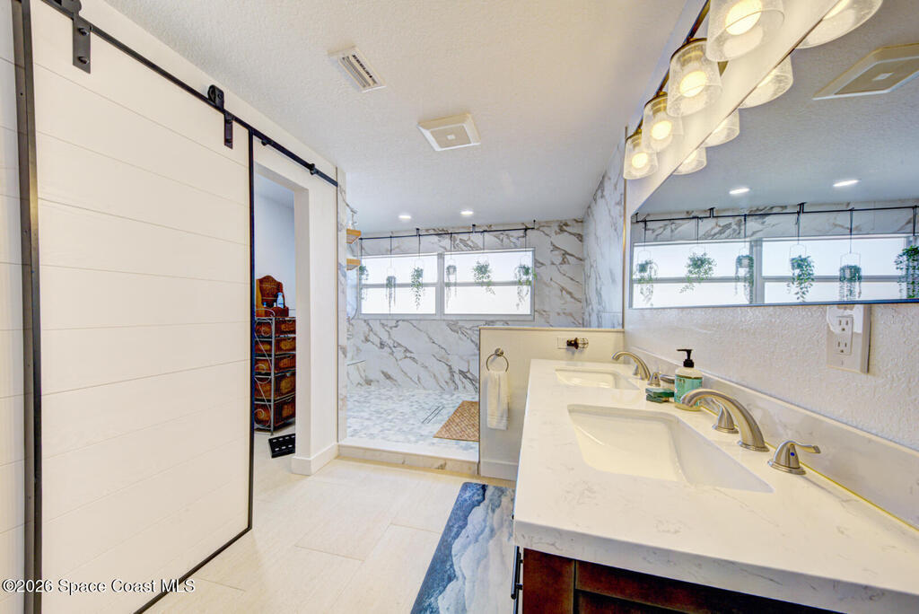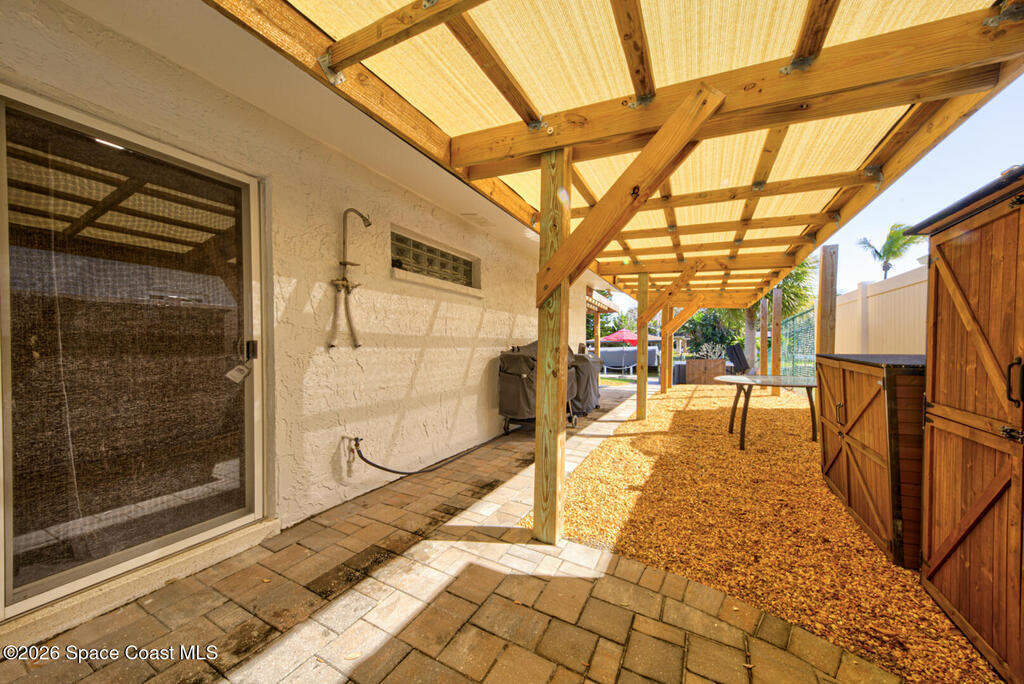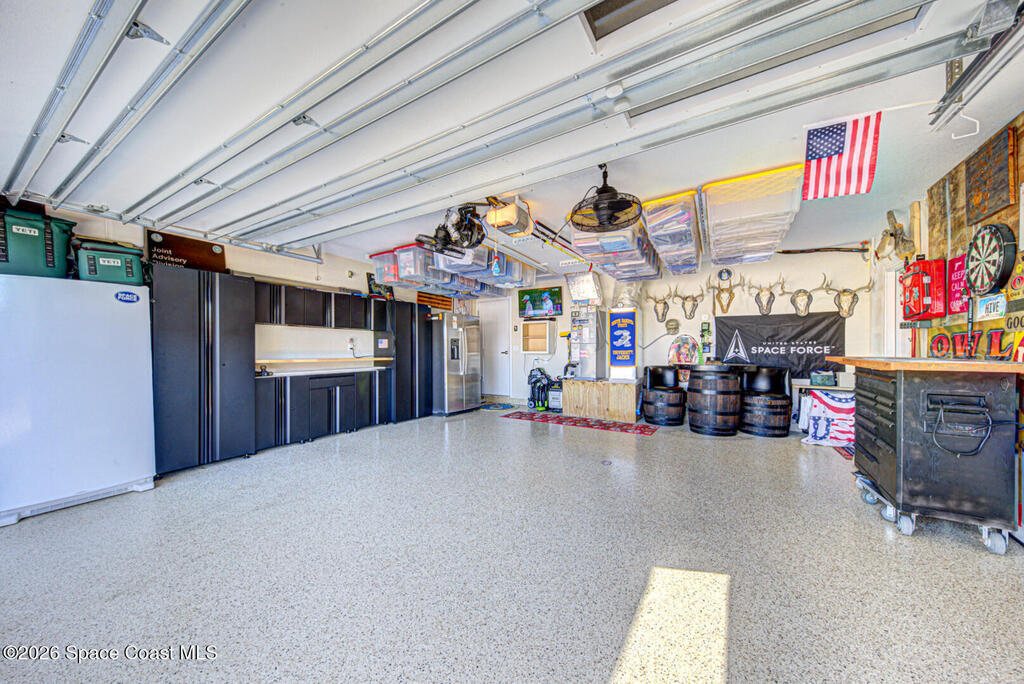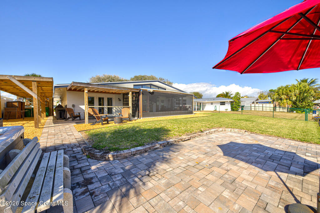 Luxury canal-front living in desirable Surfside neighborhood of Cocoa Beach--NO HOA. This beautifully designed 4-bedroom, 3-bath home features double-primary suites and direct access to a waterfront lifestyle with private floating dock. The open floor plan is filled with natural light and seamless indoor-outdoor flow. The kitchen, dining, and great room connect effortlessly, offering tranquil water views. The kitchen boasts SS appliances, abundant cabinetry, ample counter space, and recessed lighting. Elegant tile flooring imported from Ukraine runs throughout, complemented by plantation shutters and hurricane-rated windows, doors, and garage door. Primary suite provides a retreat with a spa-like bath, double-sink vanity, shower, and soaker tub. Highlights include epoxy-coated driveway and garage with extensive storage, solar panels producing approx. 3,000 kWh/month. A fenced backyard, screened patio, pergola, garden arbor, hot tub are perfect for boating and year-round enjoyment.