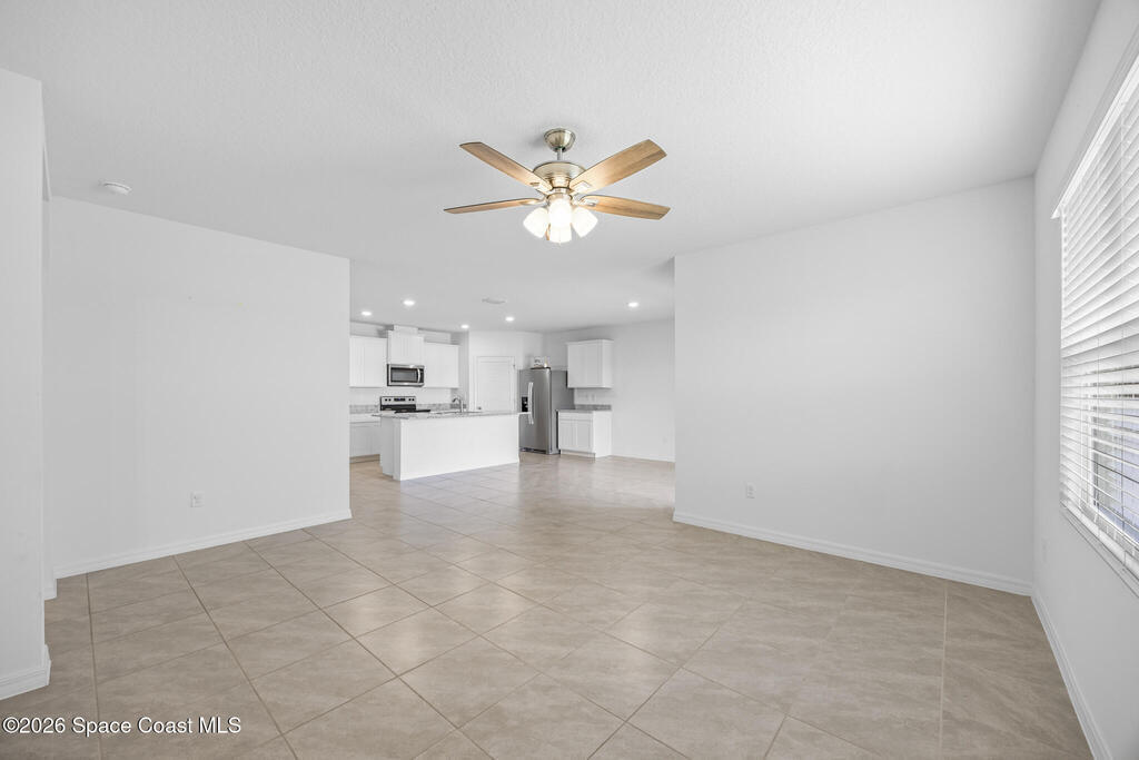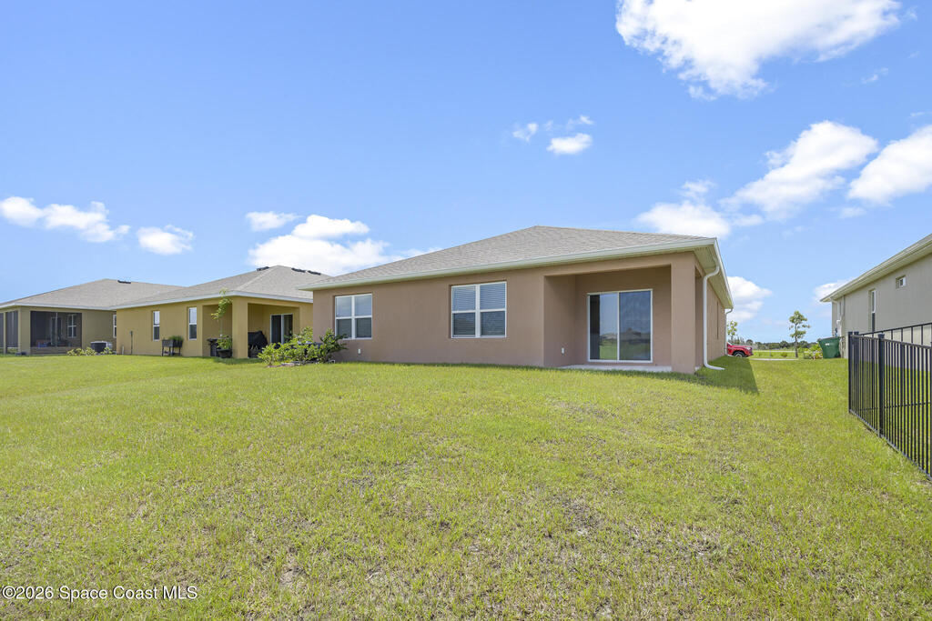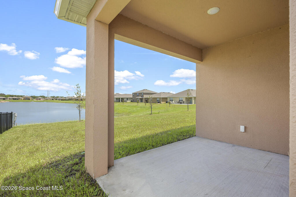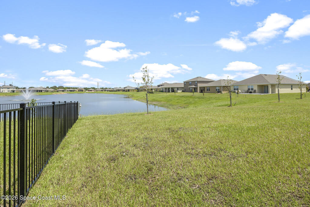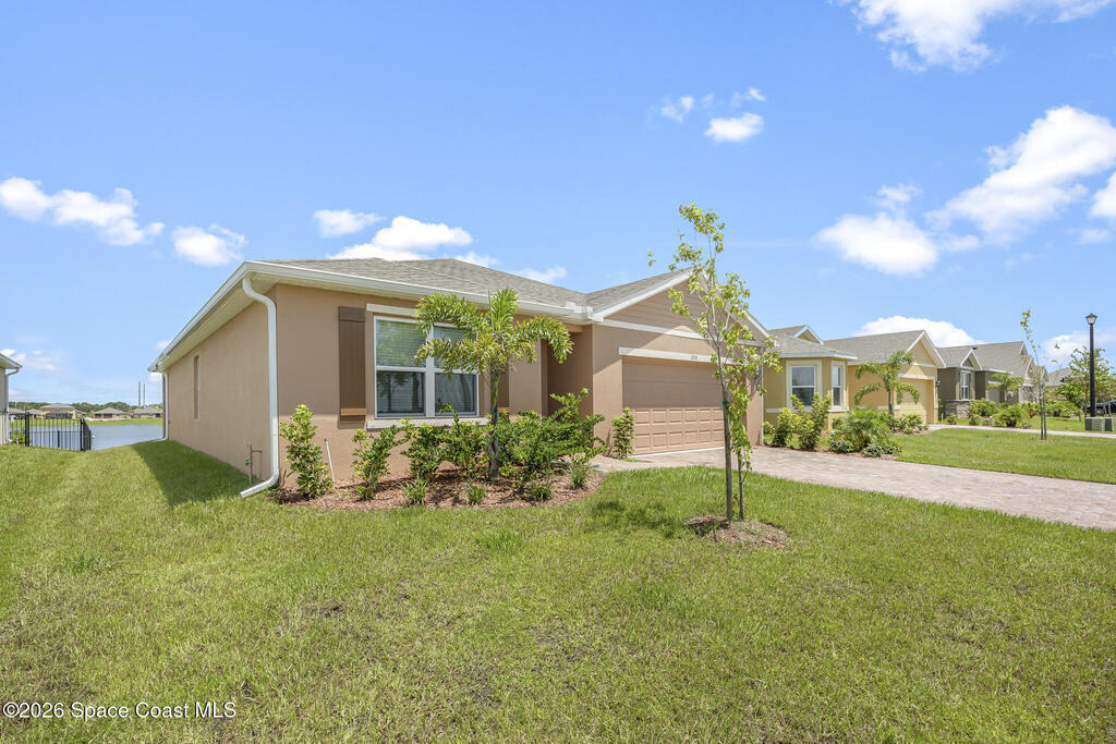 Welcome to your 2024 built home of modern living. Offers four bedrooms and two full baths, and a 2 car-garage, and a gorgeous lake view. City water and sewer. Interior highlights: tiles in kitchen, living areas and bathrooms, luxury vinyl in bedrooms (some old photos shown carpets). Kitchen with breakfast island and SS appliances. Spacious master with a huge walk-in closet. Split bedrooms. Lots of natural light. Great location: 2 mins to I-95, minus to 192 with Publix, Target, Home Depot, shops and restaurants, 20 mins to beach, 50 mins to Orlando airport, 1 hr to Disney. Make it home!