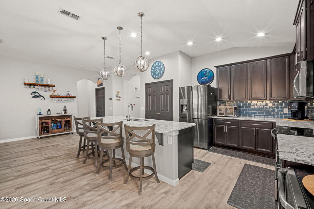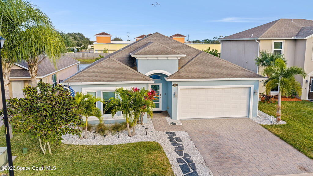 Enjoy the best of Florida living with waterfront views in this bright, updated home located in a gated community. The open floor plan features wood-plank laminate flooring and upgraded lighting for a light, airy feel. The kitchen offers a large island, quartz countertops, custom cabinetry, touch less faucet, smart refrigerator, and tile backsplash. A stone accent wall with built-in electric fireplace adds a modern and cozy touch to the living area. With a split floor plan the master en suite includes a walk-in shower, soaking tub, and spacious walk-in closet with custom shelving. Relax in the screened lanai overlooking a manicured, fenced backyard with new pavers, deck, and lakeside fire-pit area. Upgrades include impact windows and doors, 2023 AC and duct work, freshly painted interior and exterior, garage cabinetry, attic storage, new gutters, access gates, Ring doorbell, hardwired smoke detectors, instant-hot water system, automatic garage exhaust fan, and a Massey termite bond.
