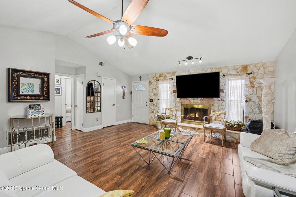 Move-in ready FOUR bedroom, 2.5 BATH Suntree home tucked away on a quiet cul-de-sac, just a short walk to Spyglass Park. Enjoy LOW HOA fees and a convenient location close to shopping, dining, and everyday amenities. This home features SOLAR PANELS offering reduced monthly utility costs immediately! The kitchen offers stainless steel appliances, a new dishwasher, and wood-tile flooring, while the indoor laundry room includes a newer washer. Ceiling fans are found throughout the home for added comfort. Major systems--including the roof, AC, and refrigerator--are approximately six years old. The home also highlights a wet bar and a cozy wood-burning fireplace, perfect for entertaining or relaxing. A versatile fourth bedroom and flex space opens directly to the backyard, making it ideal for a home office or guest bedroom. Lastly, newer irrigation pump helps maintain the outdoor space with ease. Schedule your showing today!