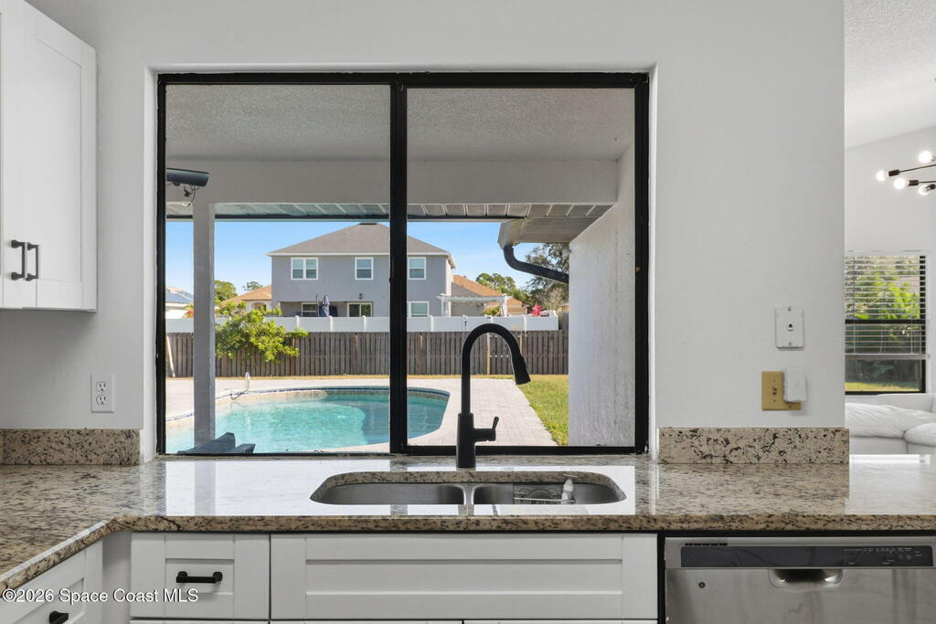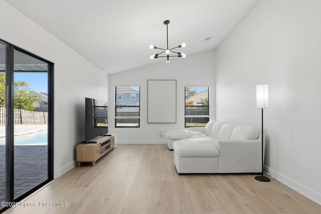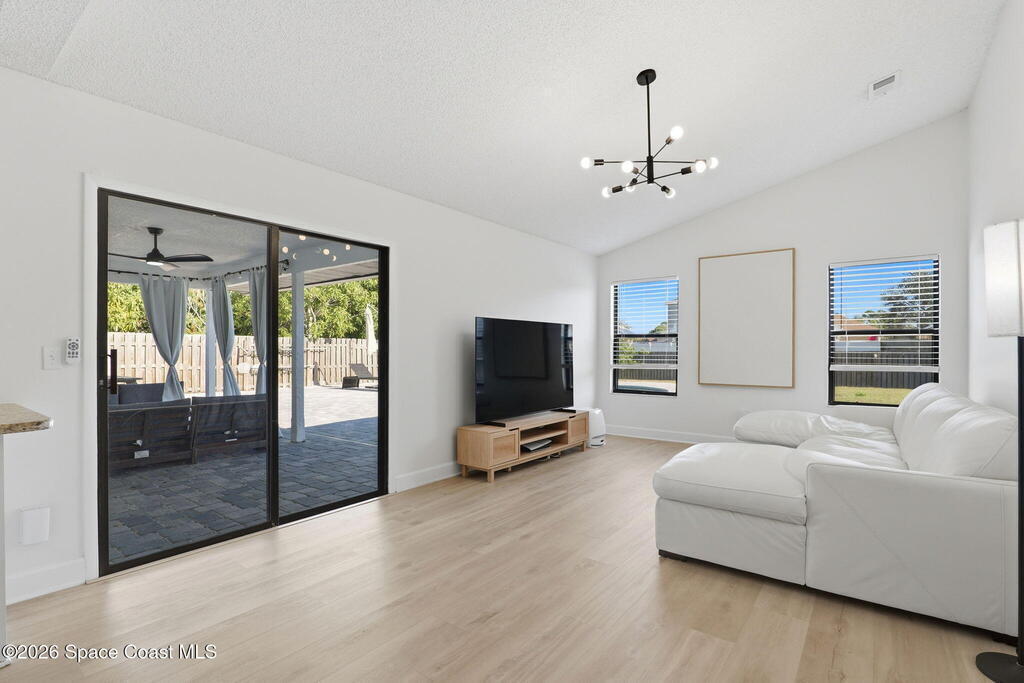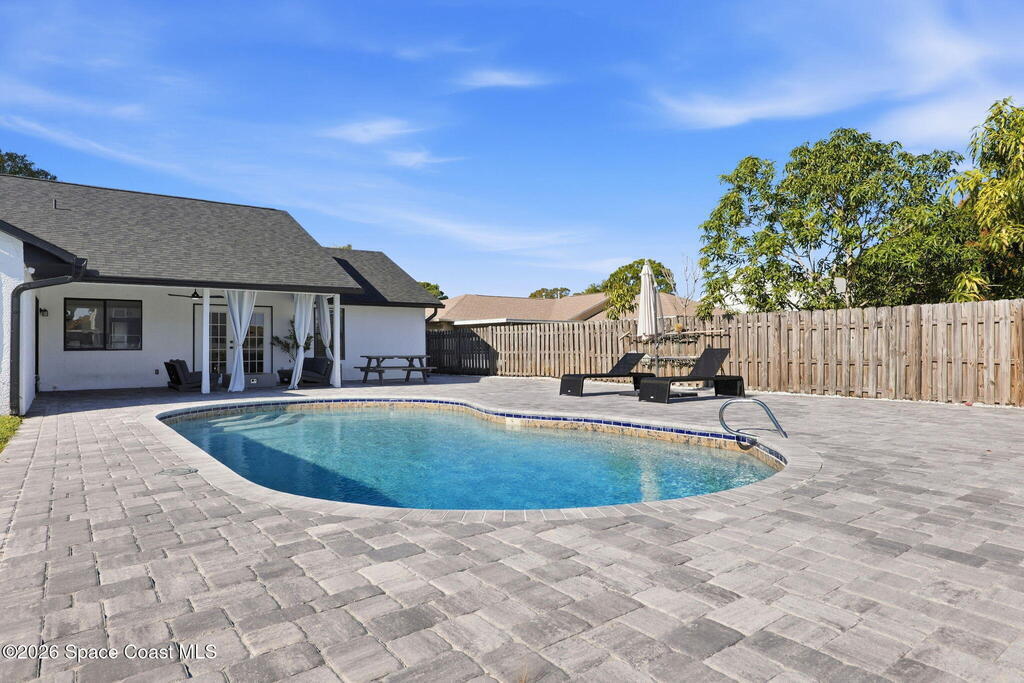 Located in the Wickham Forest neighborhood, this beautifully remodeled 3-bedroom, 2-bath, 2-car garage home sits on an exceptionally rare .34acre oversized lot, offering expansive front and backyard space with full fencing for privacy. The outdoor living area features a large freshwater swimming pool, newly paved pool deck, and a spacious covered lanai--perfect for entertaining or relaxing. Inside, the home showcases brand-new luxury vinyl plank flooring throughout with no carpet, vaulted ceilings, and skylights that fill the space with natural light. The updated kitchen offers granite countertops, white shaker cabinetry with soft-close hardware, gas range, pantry, and breakfast nook, all overlooking the backyard and pool. The primary suite features vaulted ceilings and an ensuite bath with walk-in shower, separate tub, and granite vanities. Additional upgrades include a freshly painted interior and exterior, brand-new paved driveway, upgraded lighting and fixtures. 2yr old roof. Home