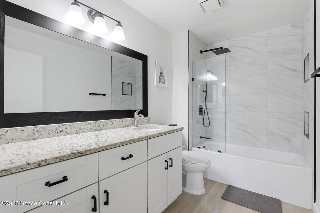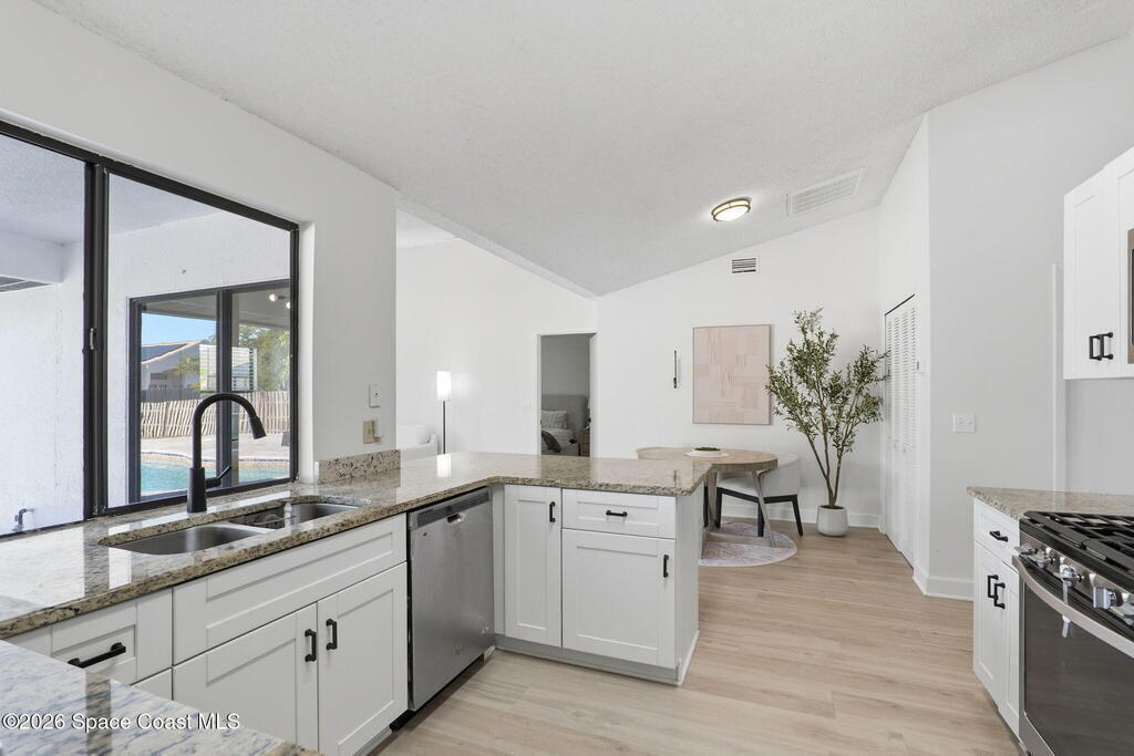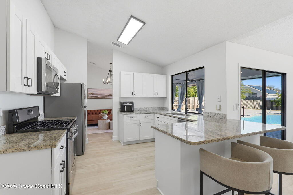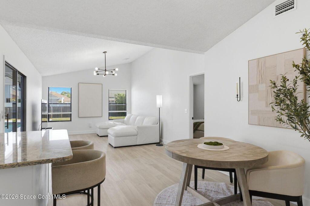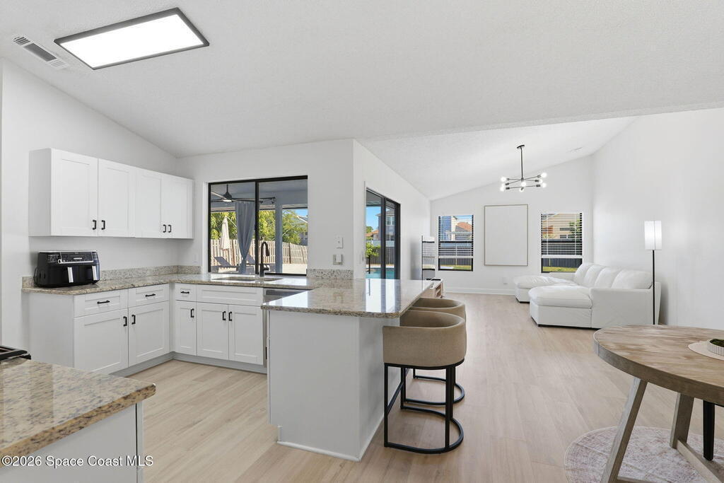Located in the Wickham Forest neighborhood, this beautifully remodeled 3-bedroom, 2-bath, 2-car garage home sits on an exceptionally rare .34acre oversized lot, offering expansive front and backyard space with full fencing for privacy. The outdoor living area features a large freshwater swimming pool, newly paved pool deck, and a spacious covered lanai--perfect for entertaining or relaxing. Inside, the home showcases brand-new luxury vinyl plank flooring throughout with no carpet, vaulted ceilings, and skylights that fill the space with natural light. The updated kitchen offers granite countertops, white shaker cabinetry with soft-close hardware, gas range, pantry, and breakfast nook, all overlooking the backyard and pool. The primary suite features vaulted ceilings and an ensuite bath with walk-in shower, separate tub, and granite vanities. Additional upgrades include a freshly painted interior and exterior, brand-new paved driveway, upgraded lighting and fixtures. 2yr old roof. Home