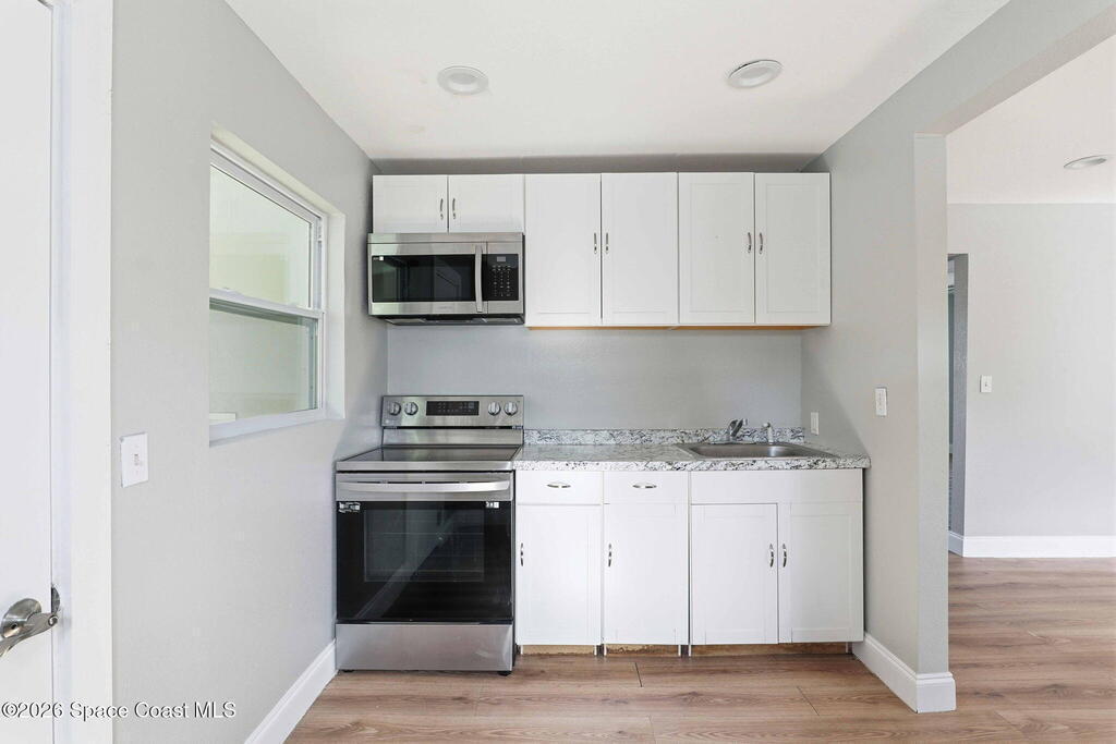 This 2 bedroom, 1 bathroom house in Titusville is simple, clean, and easy to live in. The inside has fresh paint and wood laminate floors throughout, so there's no carpet to deal with. In addition to the living room, there's an enclosed front porch and an enclosed back porch, which gives you extra room for things like working from home, hobbies, storage, or just spreading out a bit. The back porch also has washer and dryer hookups. The kitchen has very clean cabinets and appliances, and the backyard is fully fenced. There's also a shed for tools, bikes, or extra storage. If you're looking for a functional rental house in Titusville with extra usable space, this one checks a lot of boxes.
