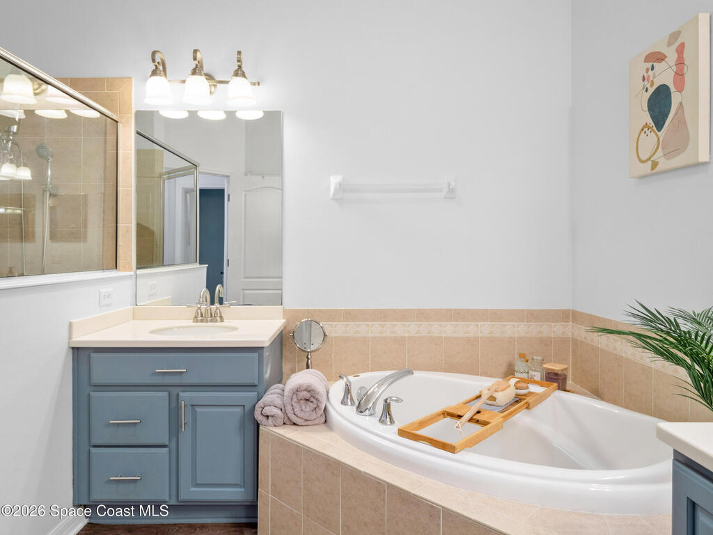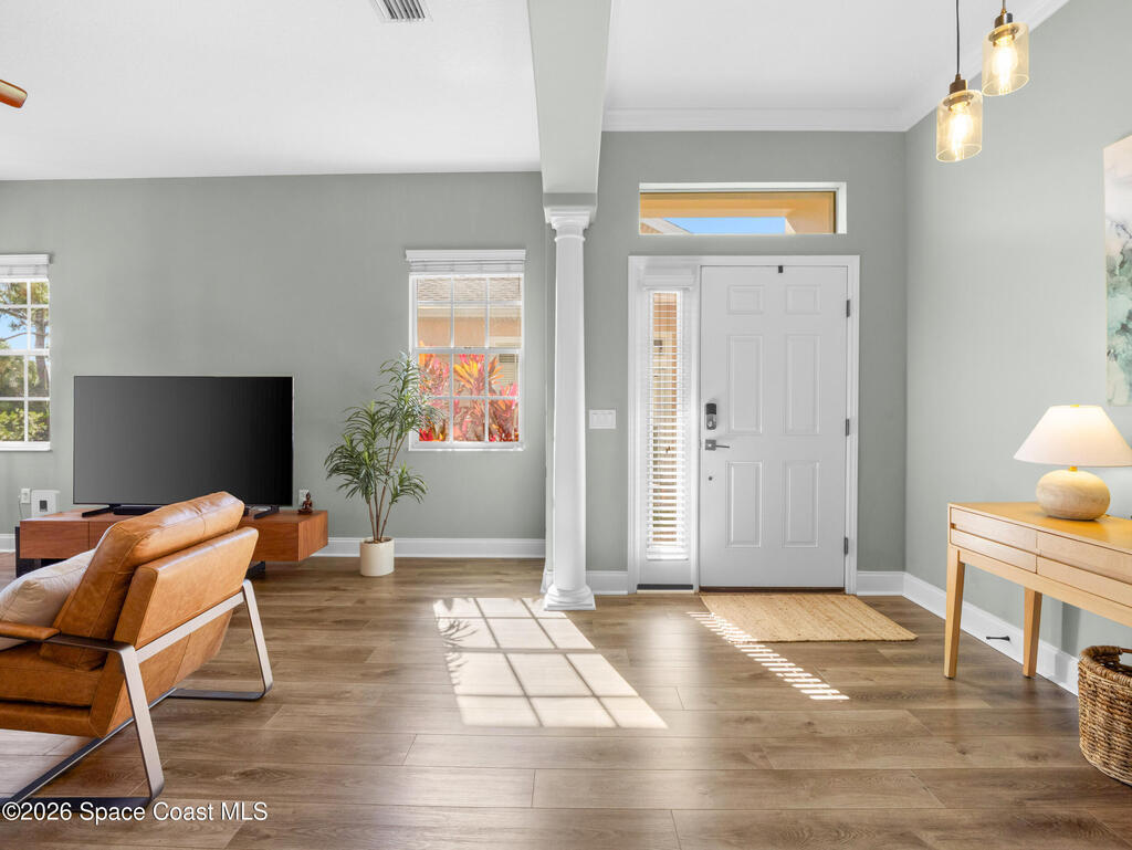 Tucked at the end of a quiet cul-de-sac, this end-unit offers rare privacy. Thoughtfully updated, the home features luxury vinyl flooring w/ tall baseboards throughout, white kitchen w/quartz countertops, SS appliances, all flowing into an open living and dining area designed for comfortable everyday living. The primary suite is a true retreat, complete with a large en-suite bath featuring an oversized garden tub, walk-in shower & private water closet. Enjoy peaceful mornings & evenings on the screened-in porch, perfect for unwinding. Located within the gated Capron Ridge community, residents enjoy a beautiful clubhouse, heated pool, walking trails, parks, tennis shuffleboard courts. Lawn care, exterior maintenance & roof coverage provide low-maintenance living, all within top-rated Viera schools & minutes from shopping, dining, medical facilities, & major employers. A great opportunity to enjoy privacy, convenience & community living in one of Viera's most established neighborhoods.