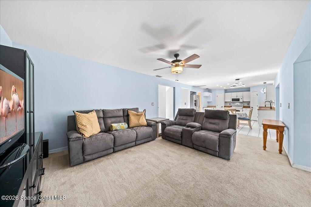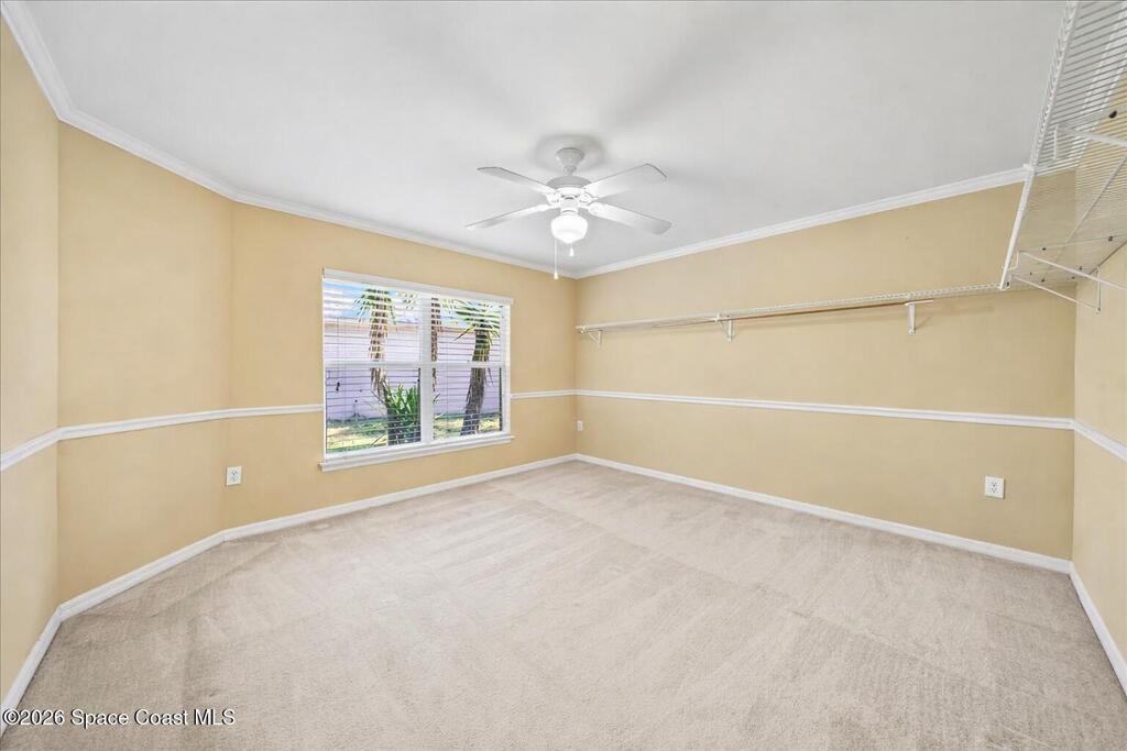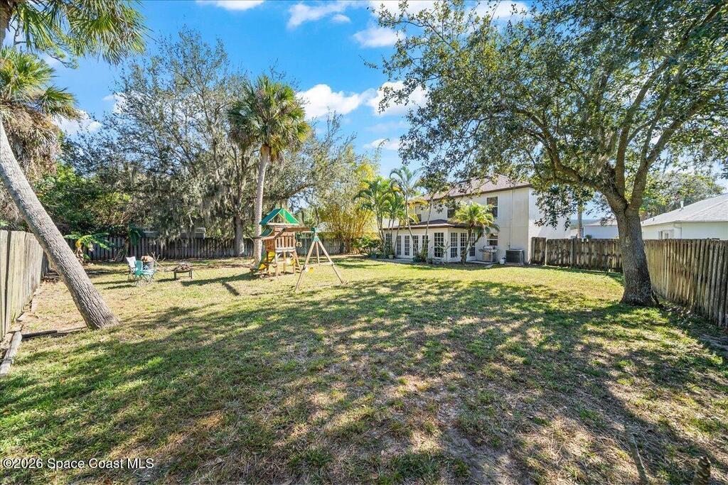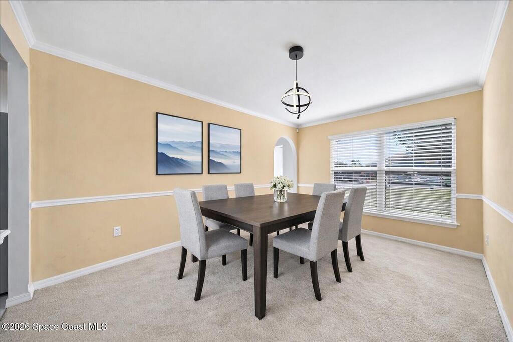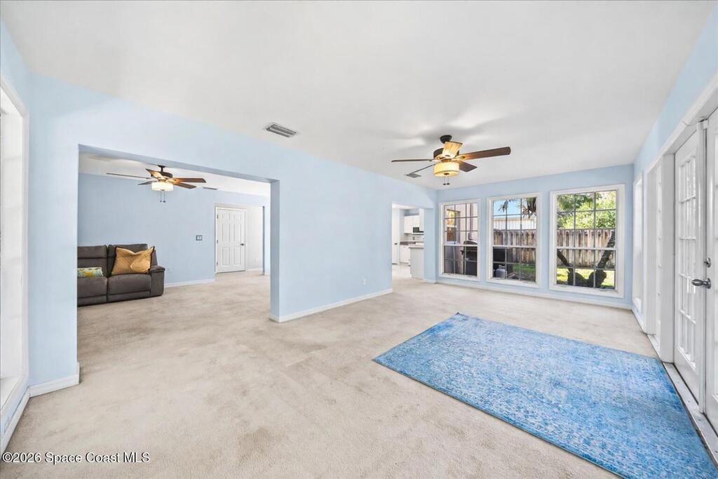 Located within a GATED community, this home offers generous space and a flexible layout. With 4 bedrooms plus a large flex space that could easily be converted into a 5th BEDROOM, it's ideal for multi-generational living, working from home, or simply having room to grow.One of the standout features is the four-seasons SUNROOM, surrounded by windows and filled with natural light. Over the past few years, the homeowner has made several updates including a newer ROOF in 2024, fresh exterior PAINT, updated kitchen BACKSPLASH, new fixtures, and added RECESSED lighting. CROWN MOLDING and CHAIR RAIL add subtle detail and character throughout the home.The FENCED backyard offers plenty of space to entertain or unwind, with no rear neighbors and the rare bonus of watching Space Coast rocket launches from your own yard. The community features a POOL and SIDEWALKS, perfect for evening walks. Conveniently located near I-95, just a short drive to Orlando, and just 10 miles to the BEACH.