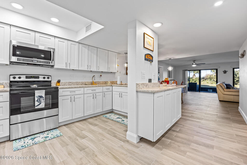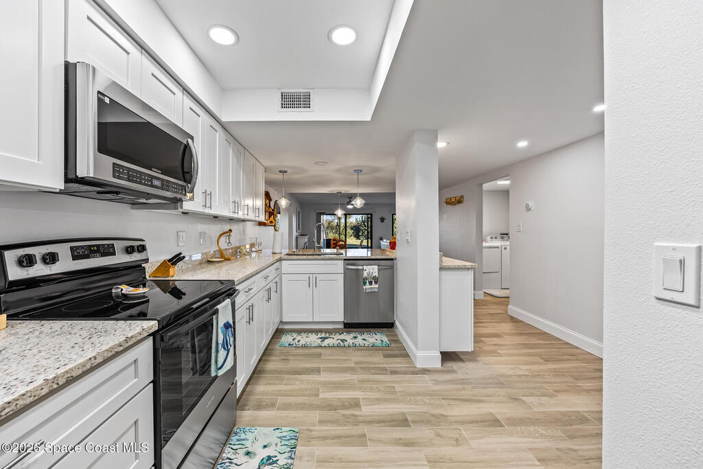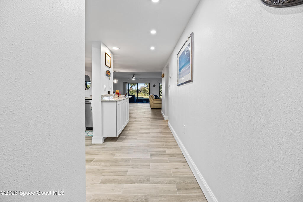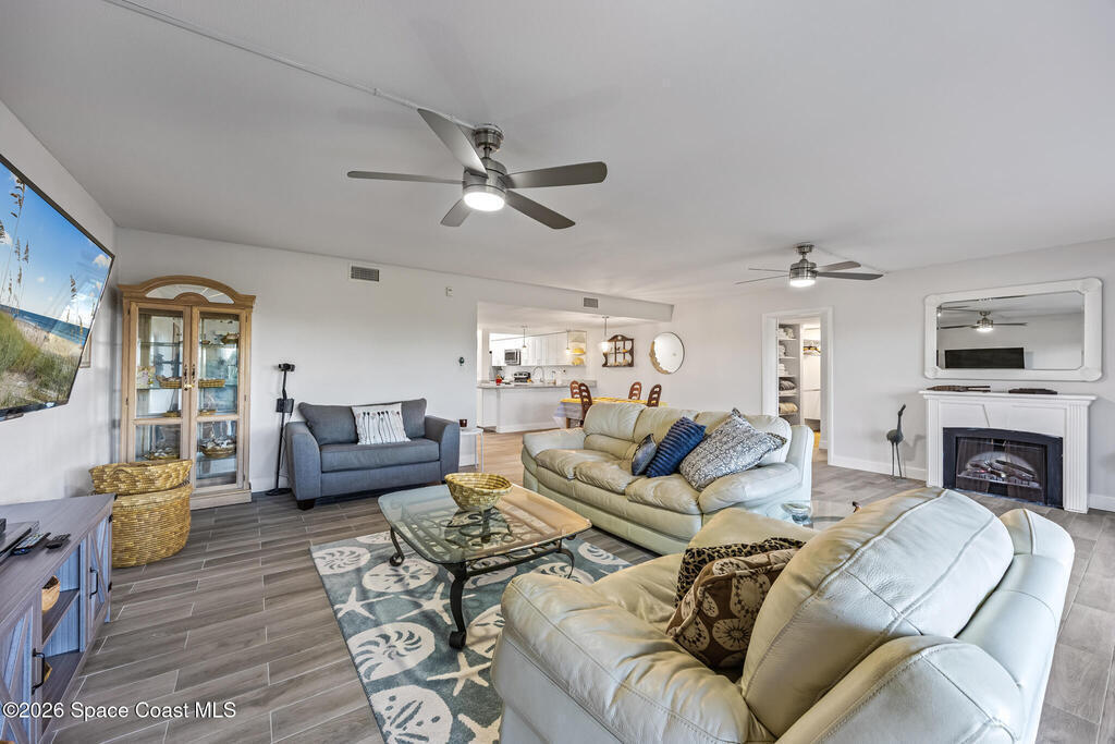 Welcome to this oceanfront, first-floor condo in the heart of Cocoa Beach. Step out from your screened back porch and, in less than a minute, have your toes in the sand. When the HOA cuts back the vegetation it gives you ocean views. They cut it back several times a year. This unit has been completely remodeled from top to bottom, including new plumbing, electrical, hurricane-impact windows, AC duct work, tile flooring, kitchen, and bathrooms. The entire condo has been fully rewired with CAT6 ethernet and coaxial cable, and all interior drywall has been replaced with green board. The condo building's roof was replaced in 2025. This spacious unit offers the perfect blend of comfort, quality, and unbeatable beachfront living. The unit includes a one-car garage. Enjoy resort-style amenities including a pool, fitness center, sauna, pickleball, and tennis courts. Furniture is negotiable.