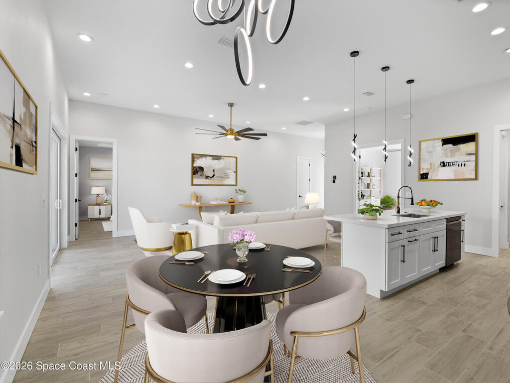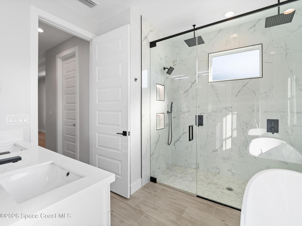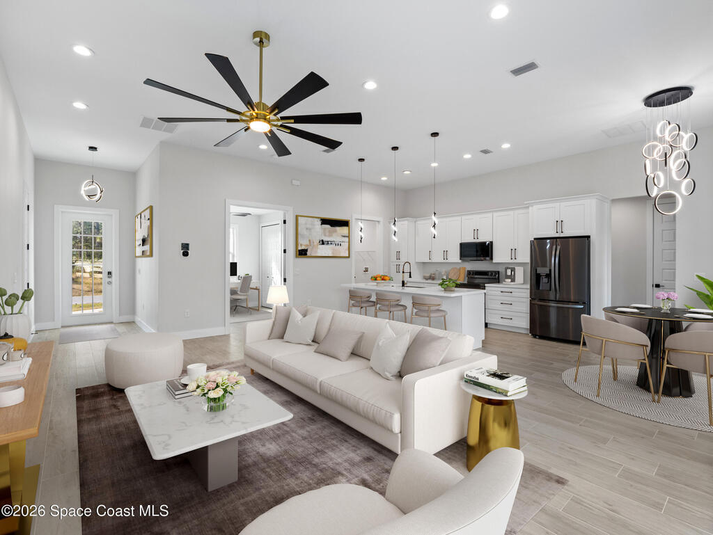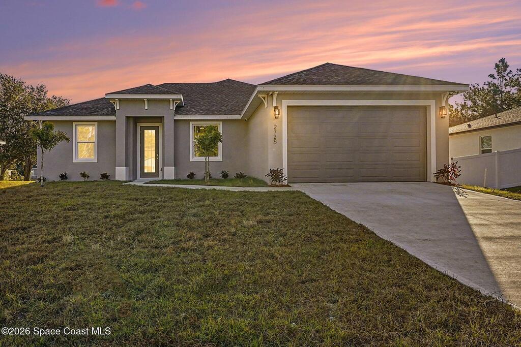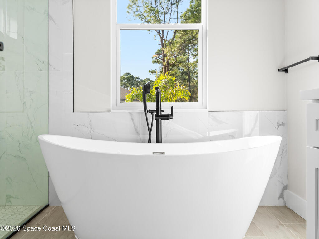 Impeccable craftsmanship and sophisticated design in the heart of Palm Bay, Florida. This stunning home embodies the essence of understated luxury, offering a serene retreat that blends modern high-end finishes with the relaxed atmosphere of the Space Coast. Every detail has been thoughtfully curated to provide a living experience that is both grand and inviting. The kitchen is anchored by a sprawling center island, perfect for entertaining or casual dining. This residence features lustrous quartz countertops not just in the kitchen, but carried seamlessly throughout the home, creating a cohesive aesthetic of elegance. Pristine tile flooring runs throughout the entire property, offering a cool, hypoallergenic, and sophisticated foundation that enhances the open, airy feel of the living spaces. The primary suite is a true sanctuary of relaxation. The en-suite bathroom rivals a high-end spa, featuring a grand walk-in shower equipped with dual rain shower heads, and a stand-alone bathtub